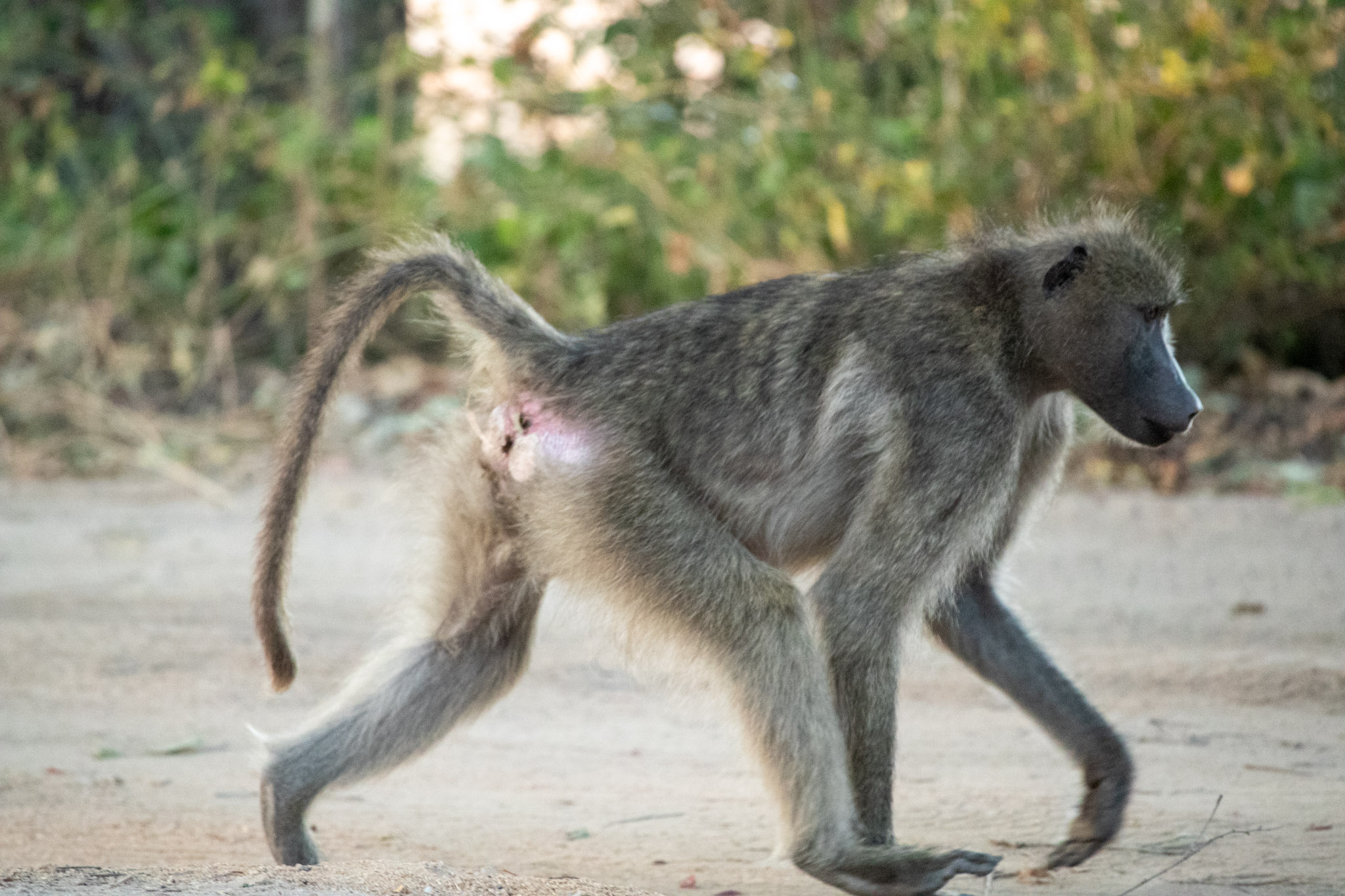 Plus loin un babouin isolé passe derrière la voiture alors que l’on est arrêté à un point de vue sur la rivière dans l'espoir de trouver des crocodiles ou des hippopotames.