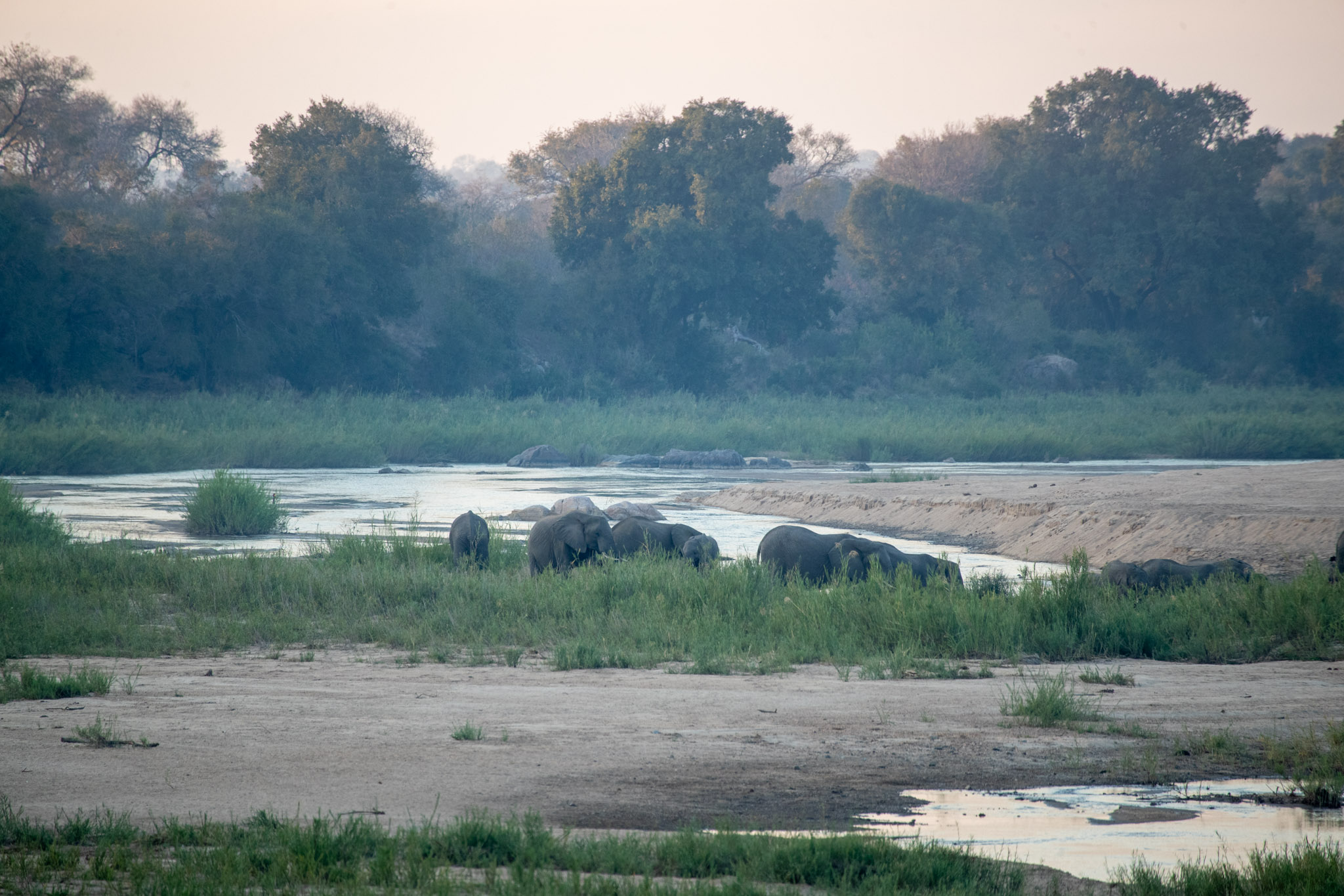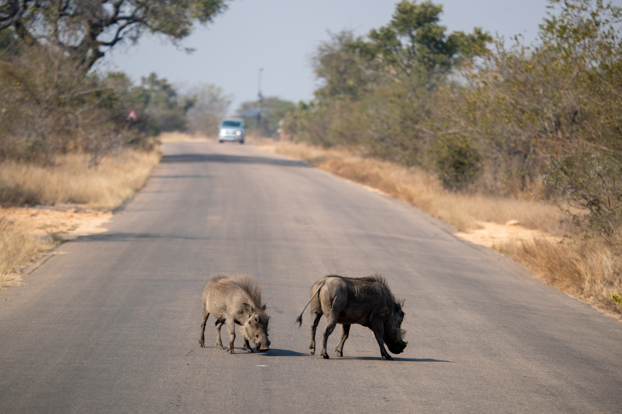 Cette quête est vraiment comme un jeu pour adultes, on se prend à essayer de compléter notre tableau de chasse. Nous faisons un tour au shop du camp de Skukuza pour acheter un livre avec les espèces que l’on peut voir dans le parc, il y a une explication succincte et on peut cocher ceux que l’on a vu. On se donne une règle du jeu entre nous : on essaye de compléter le livre mais seuls les animaux photographiés suffisamment clairement comptent. A partir de maintenant, nous passerons toutes nos soirées au restaurant à identifier les animaux vus dans la journée et mettre une croix au tableau de « chasse ». Nous regardons une à une les photos et on complète avec une recherche sur internet pour confirmer, le plus c’est pour les oiseaux mais il y a des ressources en ligne pour nous aider. Comme les jours sont très courts, les portes du campement ferment à 17h30, cela comble nos soirées avec une activité idéale en relation avec notre environnement, on essaye d’en savoir plus sur les animaux et leurs habitudes, c’est fascinant de découvrir une telle richesse dans la nature sauvage, non seulement dans l’apparence mais dans le comportement aussi. Il y a les animaux sociaux, les animaux isolés, les animaux féroces, les agressifs, les placides, toute une palette de comportements différents. Nous prenons le petit déjeuner à côté du shop au restaurant Cattle Baron qui a une terrasse qui domine la rivière Sabi. Le cadre est enchanteur avec le soleil rasant sur la forêt. Les prix sont comme d’habitude très corrects et on mange avec un œil attentif sur la rivière au cas où il y aurait de l’activité. Nos yeux ne sont pas encore très experts, le serveur nous indique qu’il y a un crocodile juste là dans l’eau, il était sous nos yeux depuis le début et on l'avait confondu avec un tronc d'arbre et sinon beaucoup d’oiseux encore, mais pas de gros. On retourne à la voiture pour démarrer notre safari de la journée. Bien que l’activité des animaux soit réduite aux heures les plus chaudes. On ne veut pas rater notre chance quand même, au cas où. En sortant des portes du camp, on tombe quelques mètres après déjà sur une famille de phacochères. Il y en a vraiment beaucoup dans le coin.