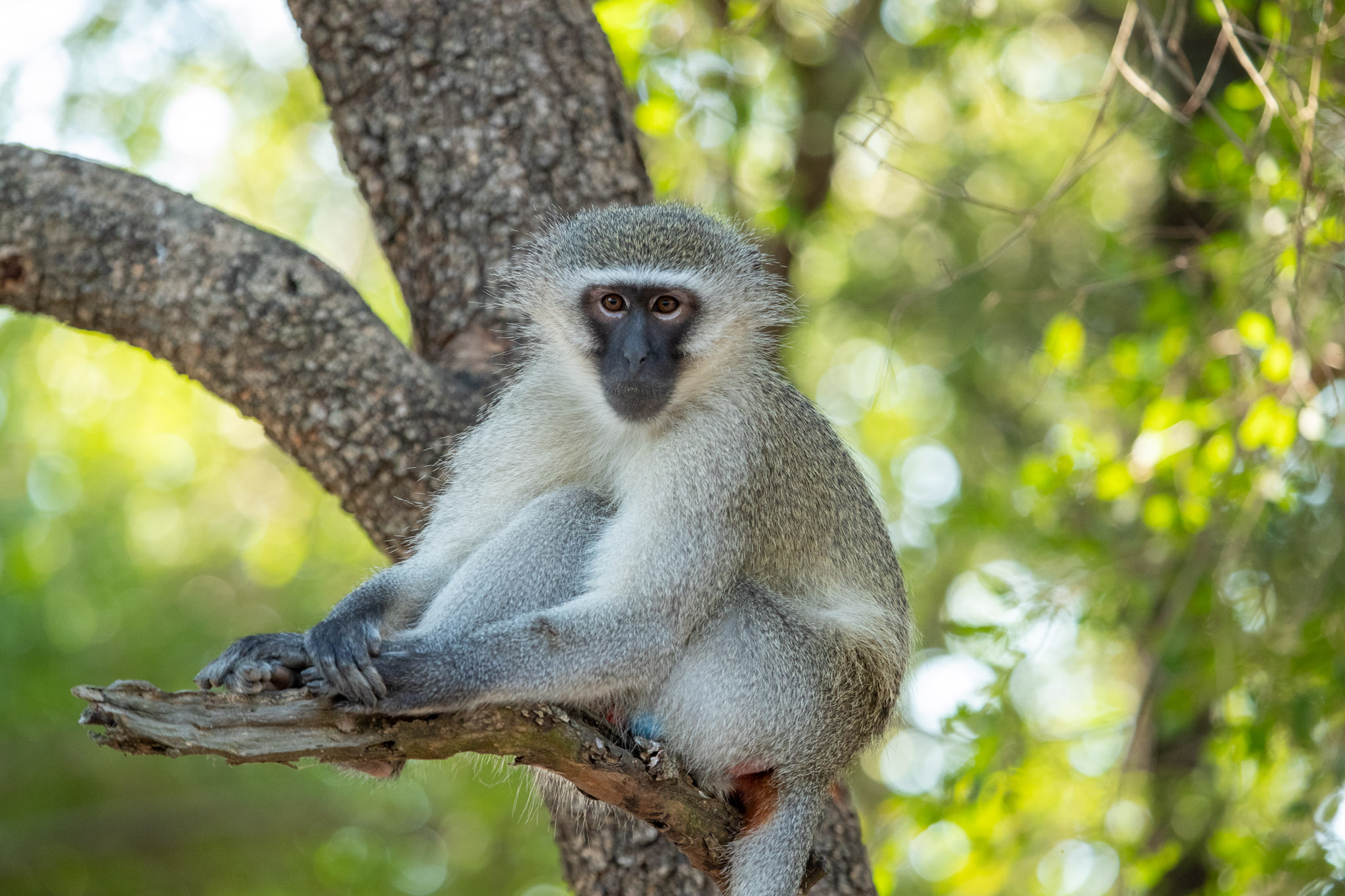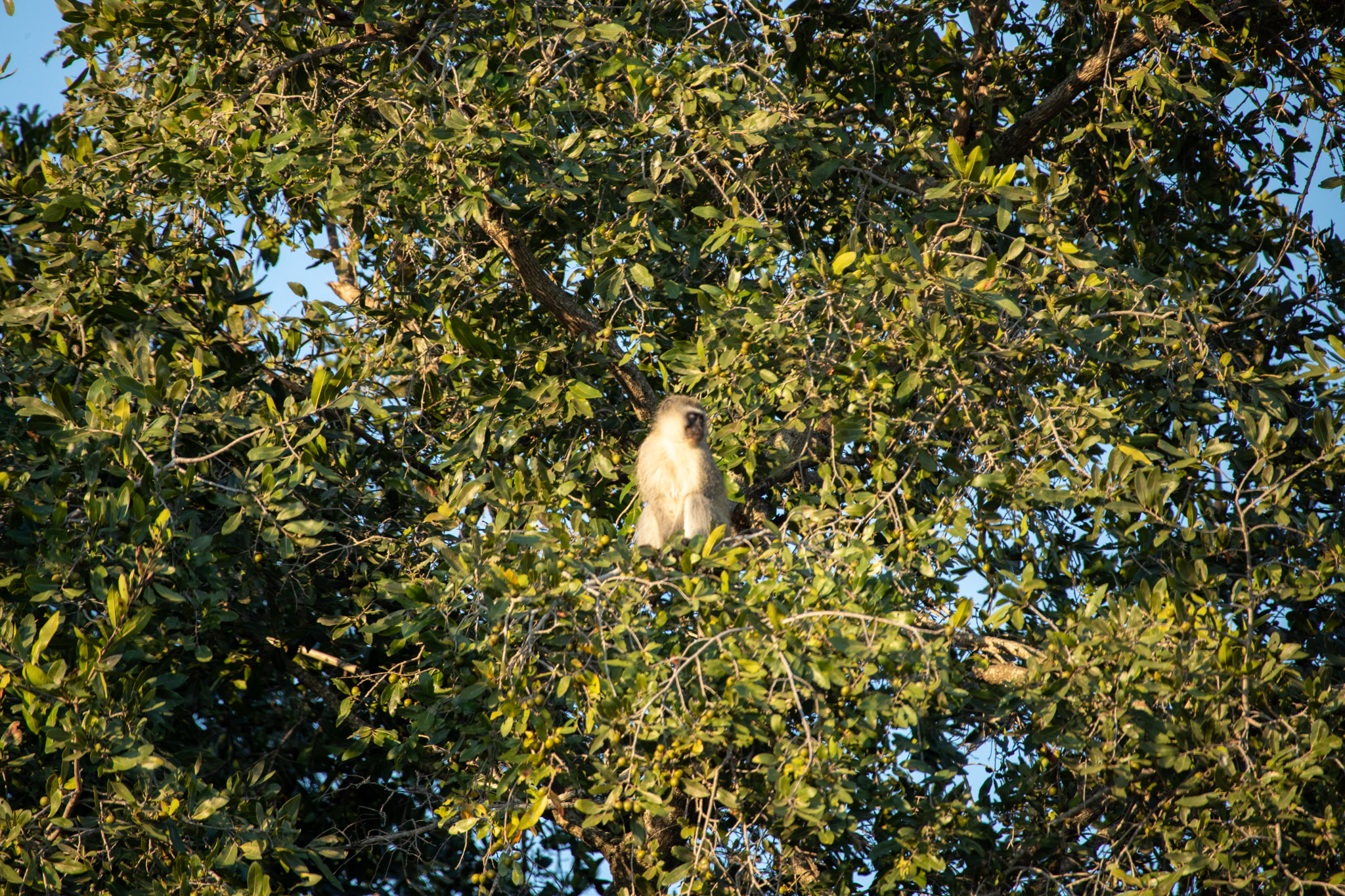 Nous décidons de retourner au camp après un bilan assez maigre, pas de fauves, mais notre matinée est quand même compensé par cette belle image de la famille d’éléphants. Il faut vraiment avoir de la chance et être au bon endroit au bon moment sinon on ne voit rien. Et pour cela on se dit que seule la chance peut nous aider car ce sont des animaux sauvages, ce n’est pas le zoo, on ne peut pas commander les animaux sur un plateau. Sur le chemin du retour, on tombe sur un singe qui fait le guet.