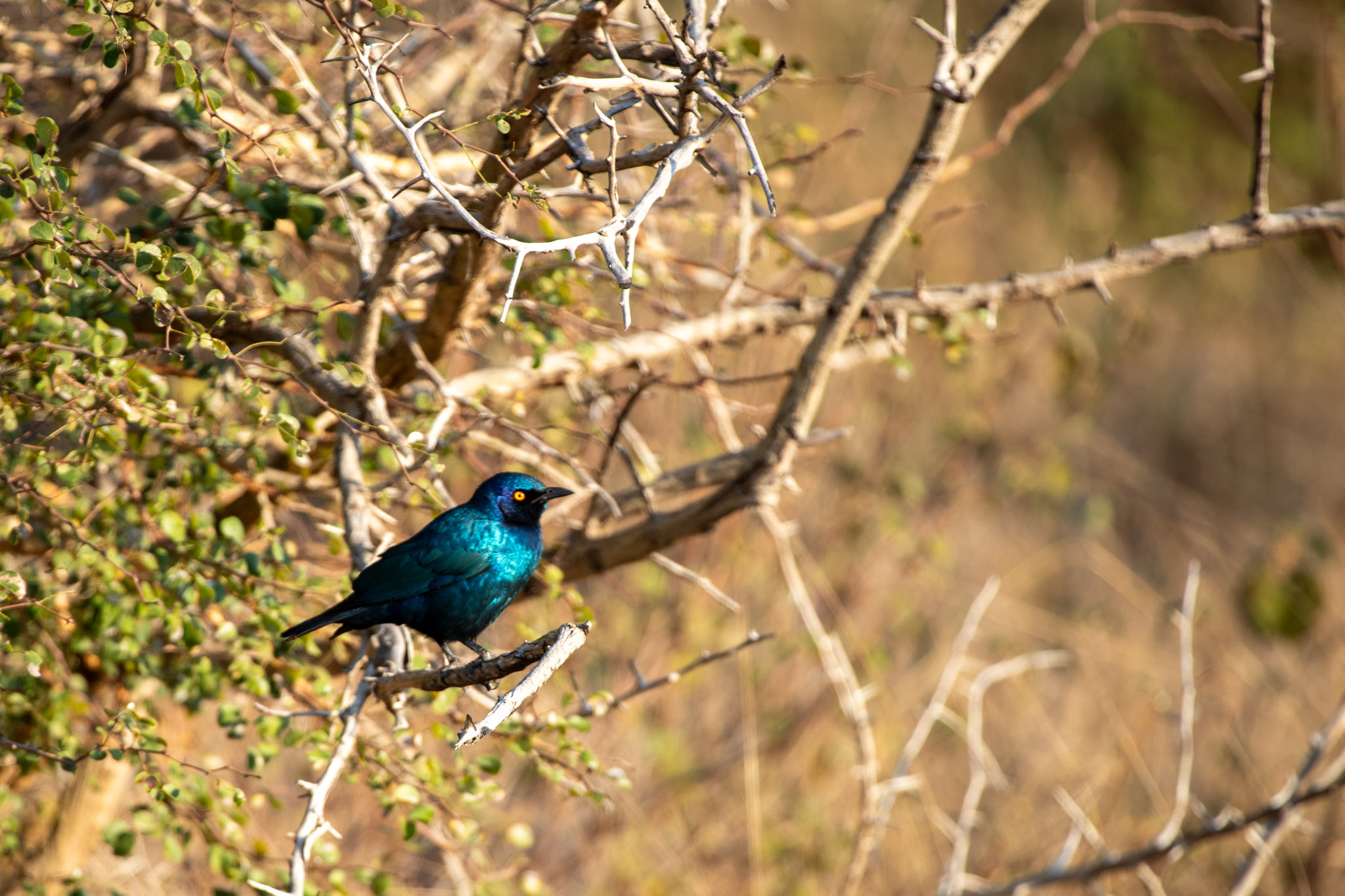 Un oiseau aux couleurs changeantes du vert au bleu est juste à côté de nous, c'est une espère d'oiseau que l'on rencontrera le plus lors du safari, il y en a beaucoup.