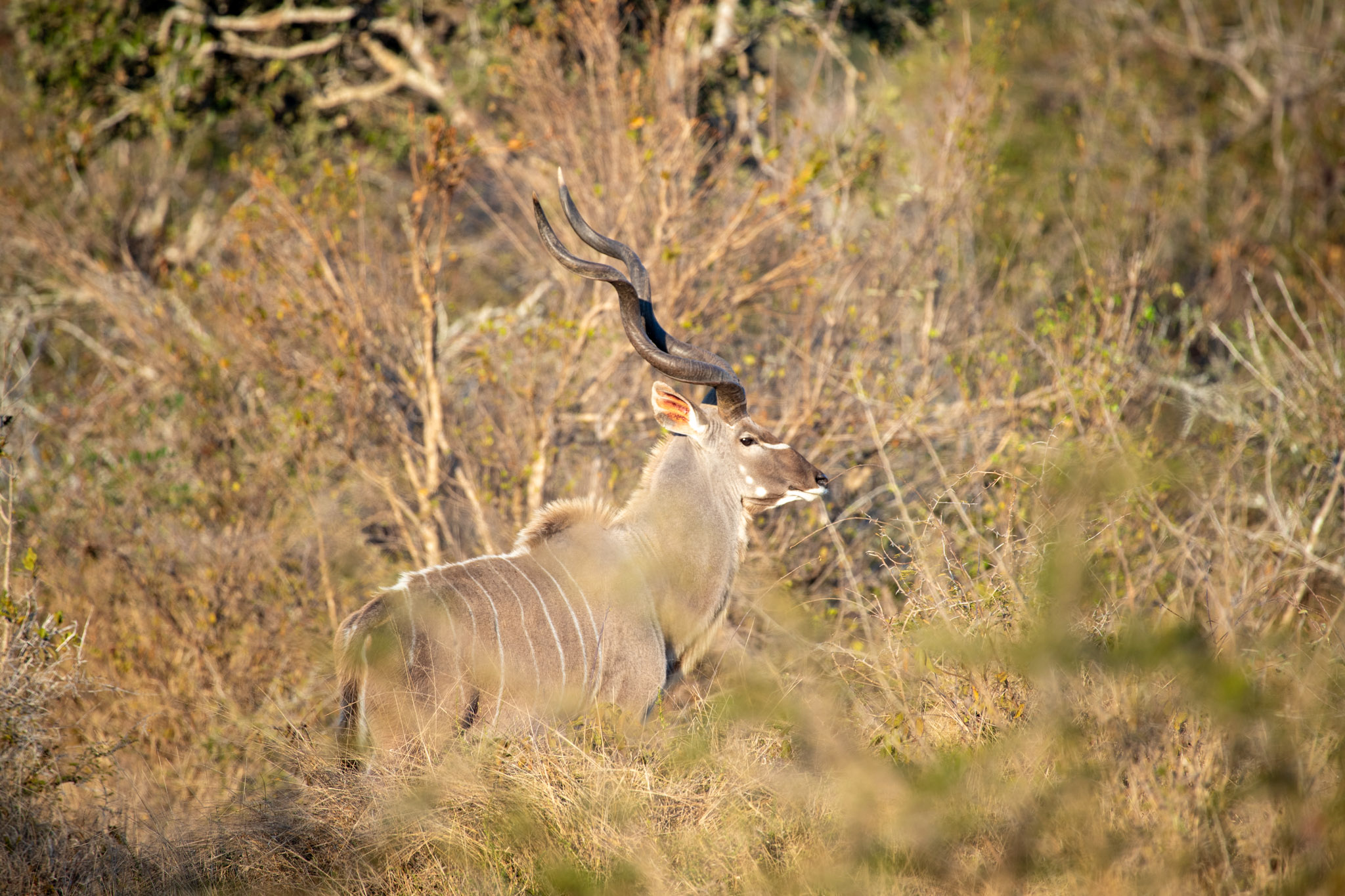 Un peu avant les portes de campement, on trouve un nouvel animal, un kudu avec ses impressionnantes cornes torsadées.