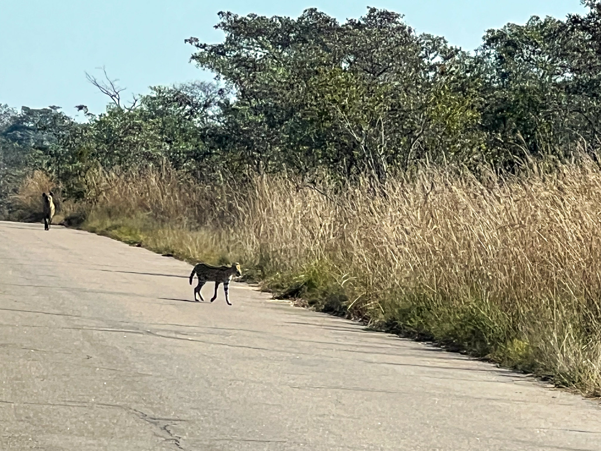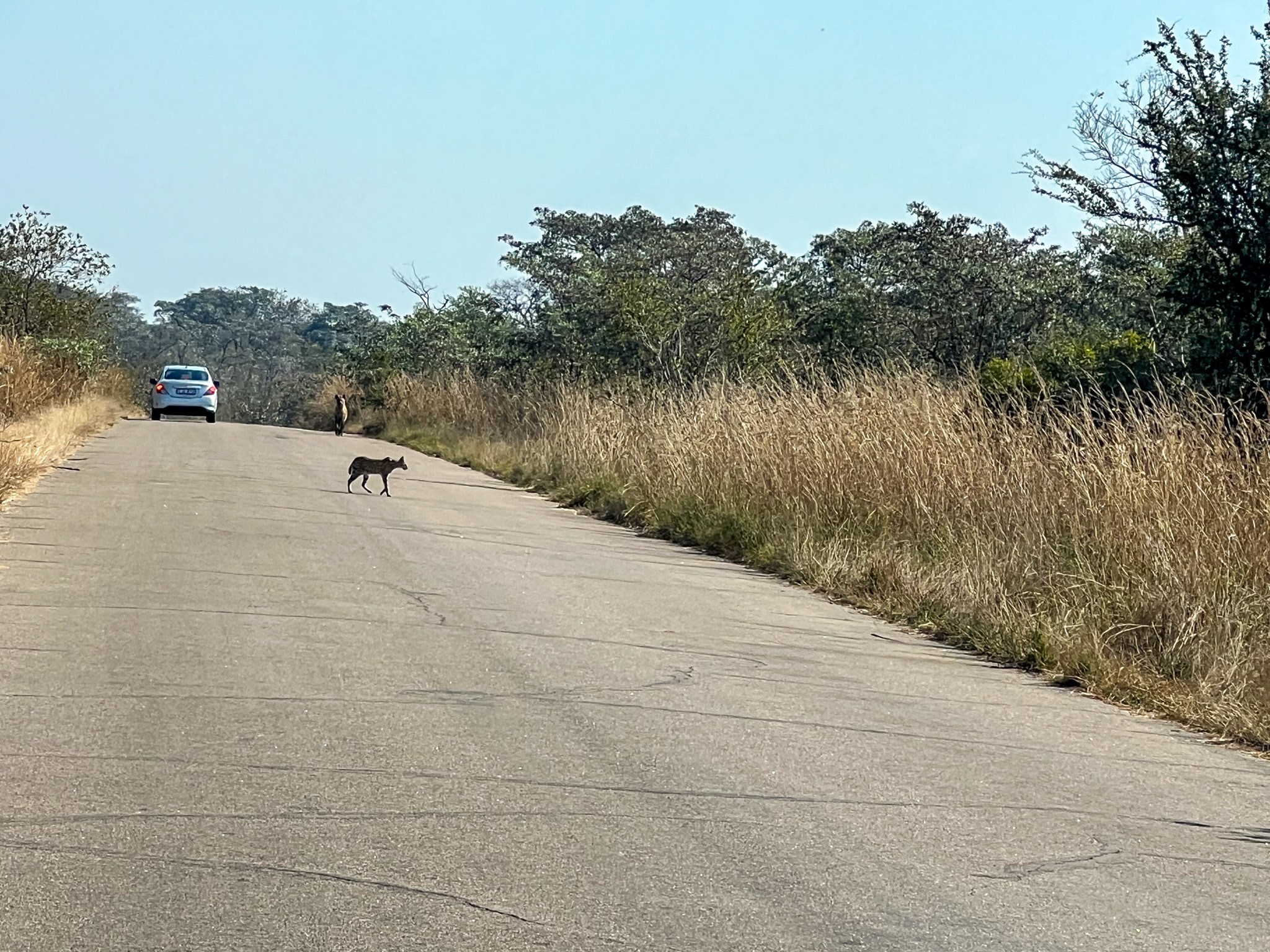 Juste à l’instant après que le guépard ait disparu dans les broussailles, c’est une grosse hyène qui fait son apparition, comme si la hyène était en train de suivre le guépard. En tout cas , en quelques fractions de secondes, on a une montée d’adrénaline incroyable. La hyène plutôt que partir dans les broussailles à la suite du guépard decide de venir vers nous et s’approche de la voiture, c’est un moment intense car on ne sait pas ce qui va se passer. Par réflexe, je referme un peu la fenêtre au cas où, je ne connais pas le comportement de cet animal sauvage, mais finalement la hyène se détourne et repart dans la brousse. Que d’émotion ! Et quelle chance ! Alors que l’on avait roulé depuis Skukuza sans beaucoup de succès, on est gratifié sur quelques mètres et en plein milieu de journée en plus.
