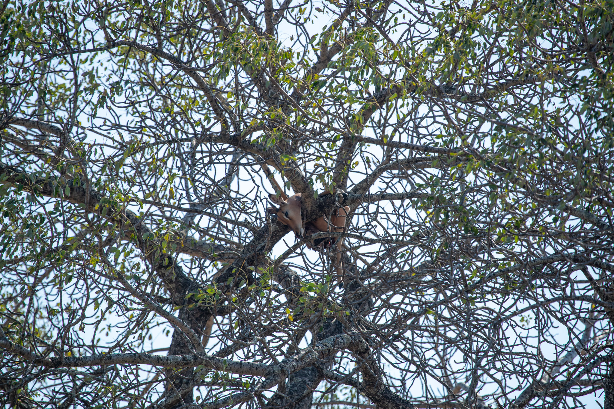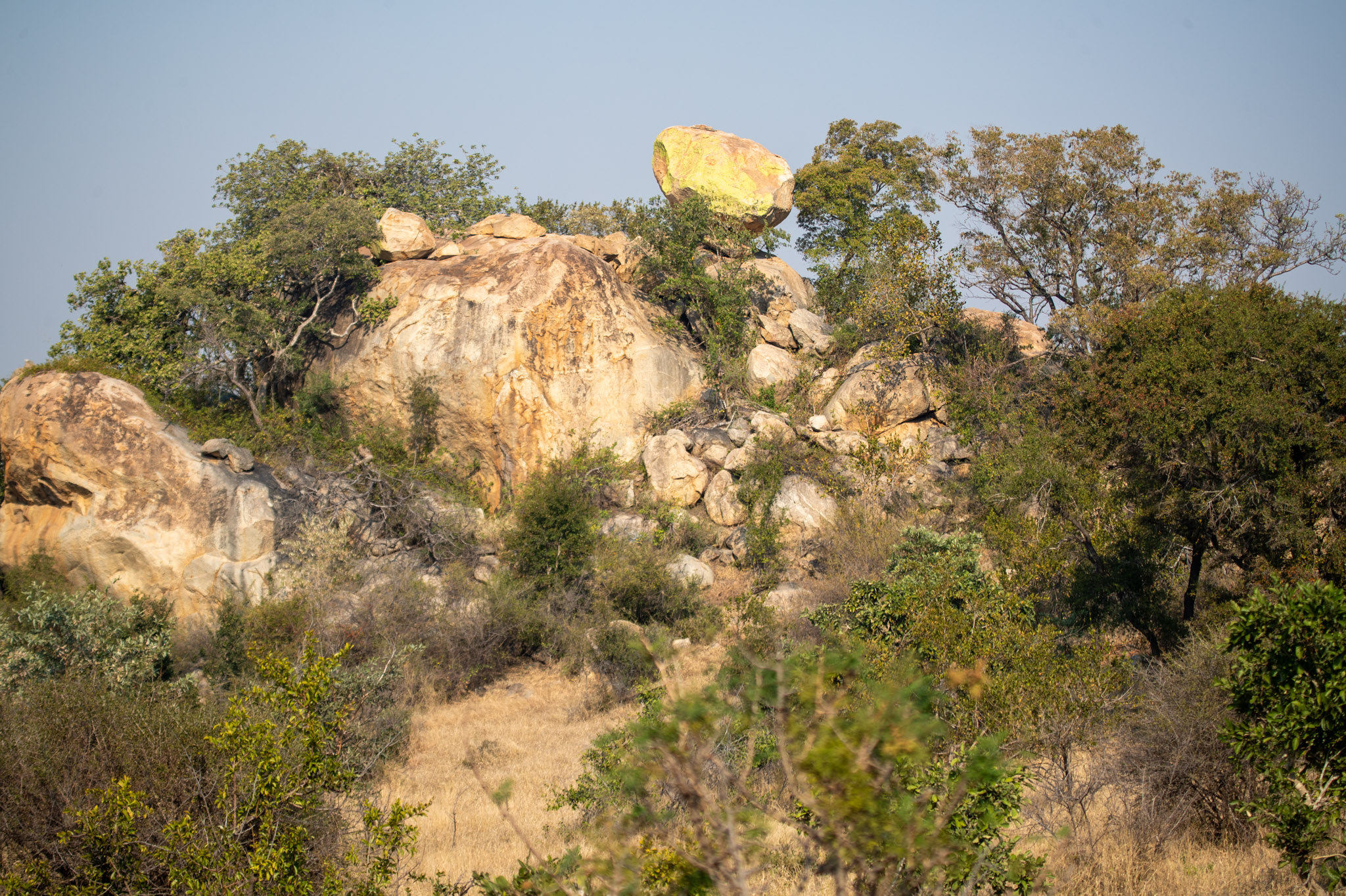 On est maintenant dans la zone pointée sur la carte comme abritant léopard et lions. La zone est magnifique avec des promontoires rocheux, la route serpente autour du relief. Néanmoins toujours pas de lion à l’horizon, mais un peu plus loin on est attiré par un attroupement de voitures garées le long de la route, de chaque côté, créant un embouteillage. Tout le monde semble regarder sur la droite en hauteur, le guide d’un des véhicules de safari pointe un gros arbre. Avec le zoom de l’appareil photo on peut voir plus précisément et on voit la moitié du corps déchiqueté d’un impala accroché aux branches. Rien d’autre. Probablement que le léopard a tué l’animal et l’a accroché la haut pour le finir plus tard. En tout cas pour le moment il n’y a pas de trace de léopard dans les parages. On décide de continuer notre chemin et on se fraye un chemin difficilement au milieu des voitures garées qui elles restent la. On se dit que l’on a peut être pas fait le bon choix mais derrière nous les places sont déjà prises, plus moyen de reculer.