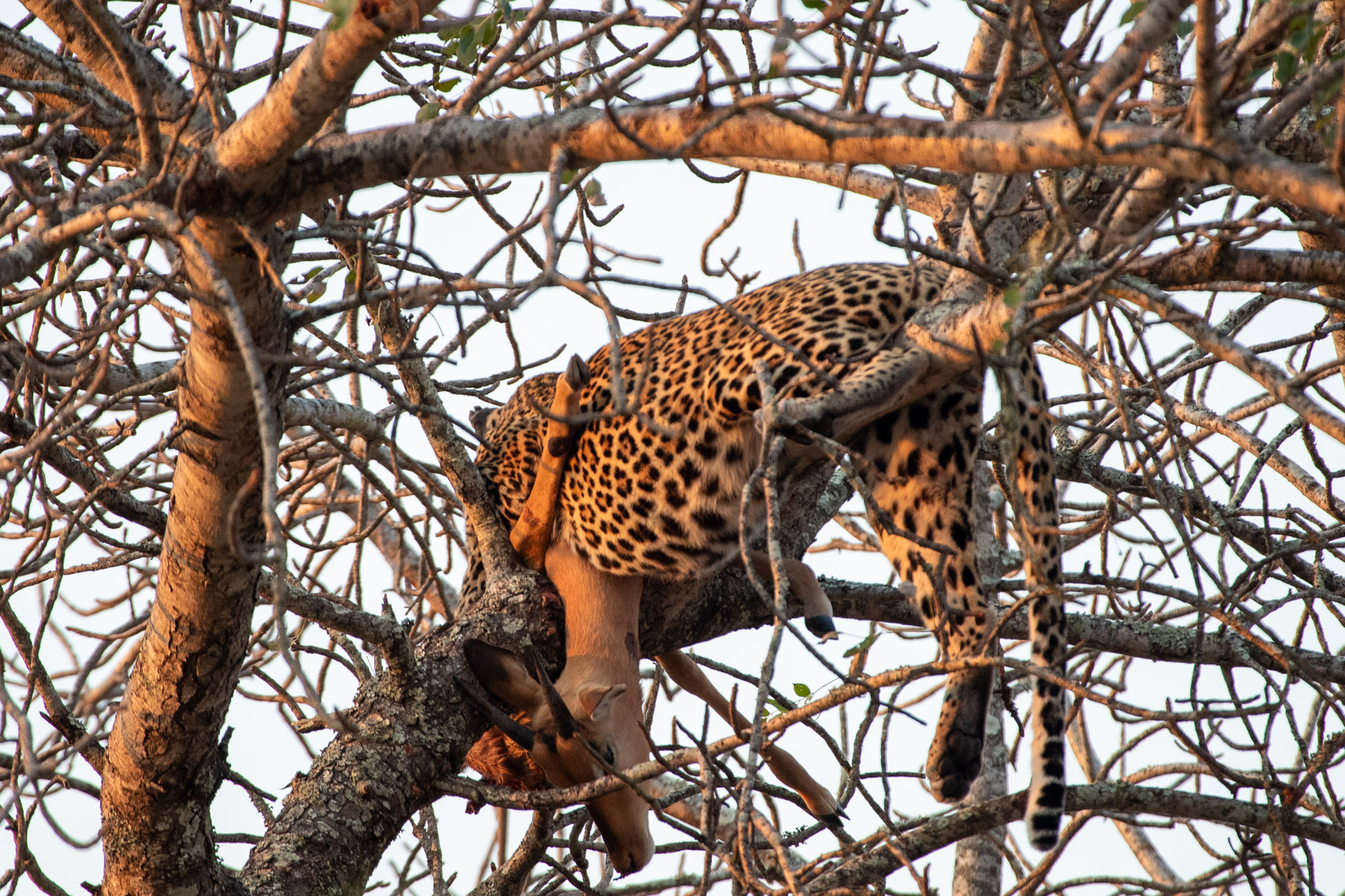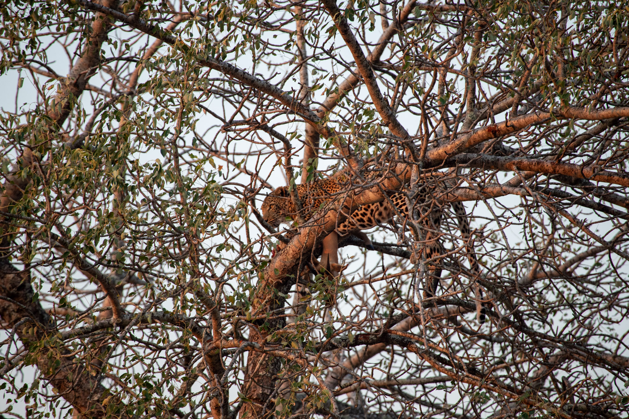 Et quelle chance le léopard est bien revenu. Il est là endormi avec son impala sous le ventre.