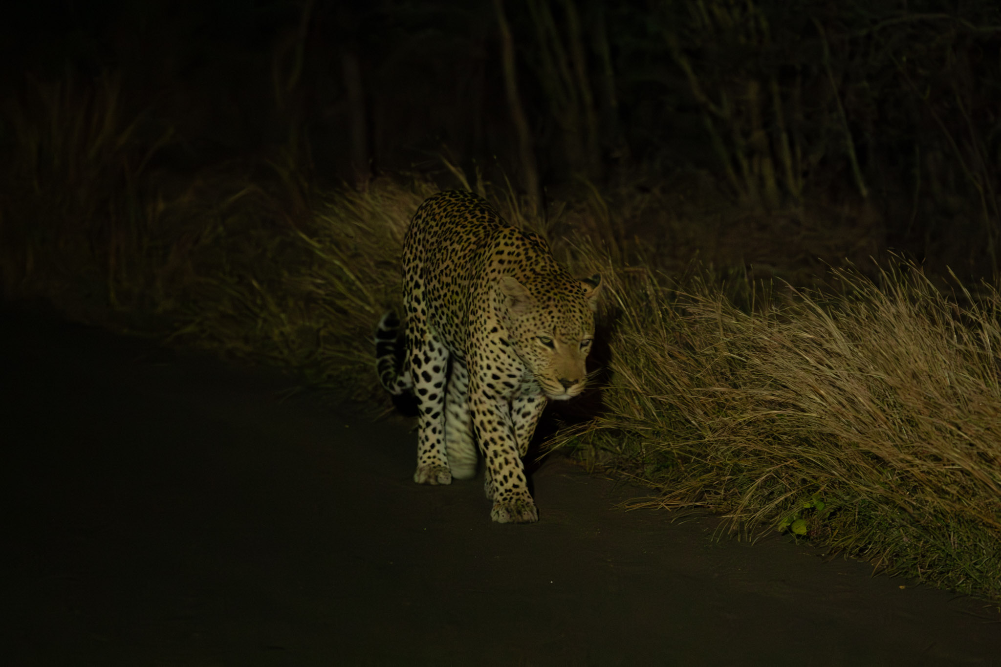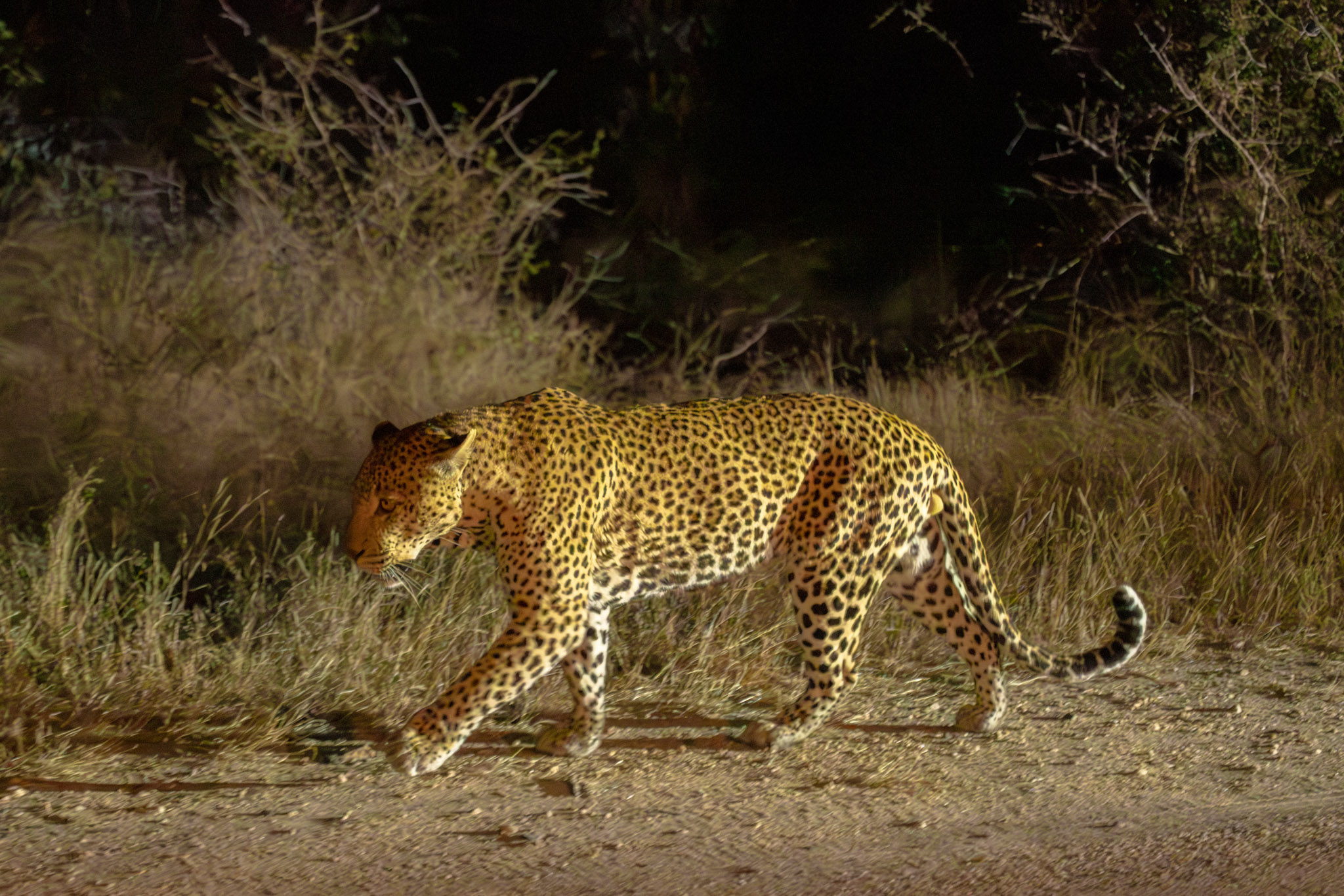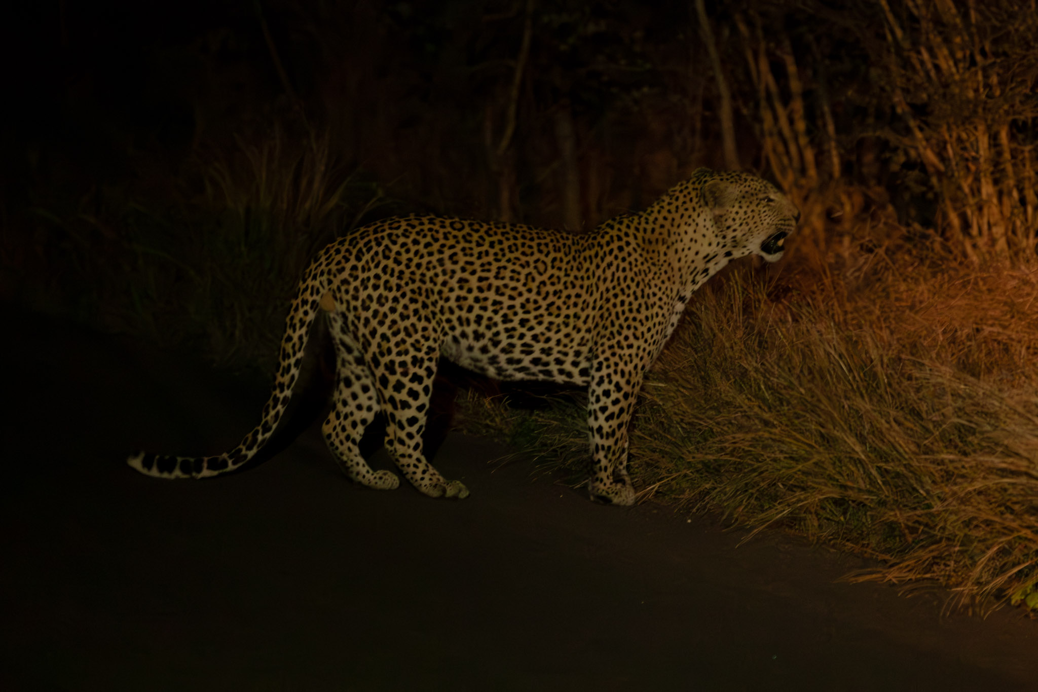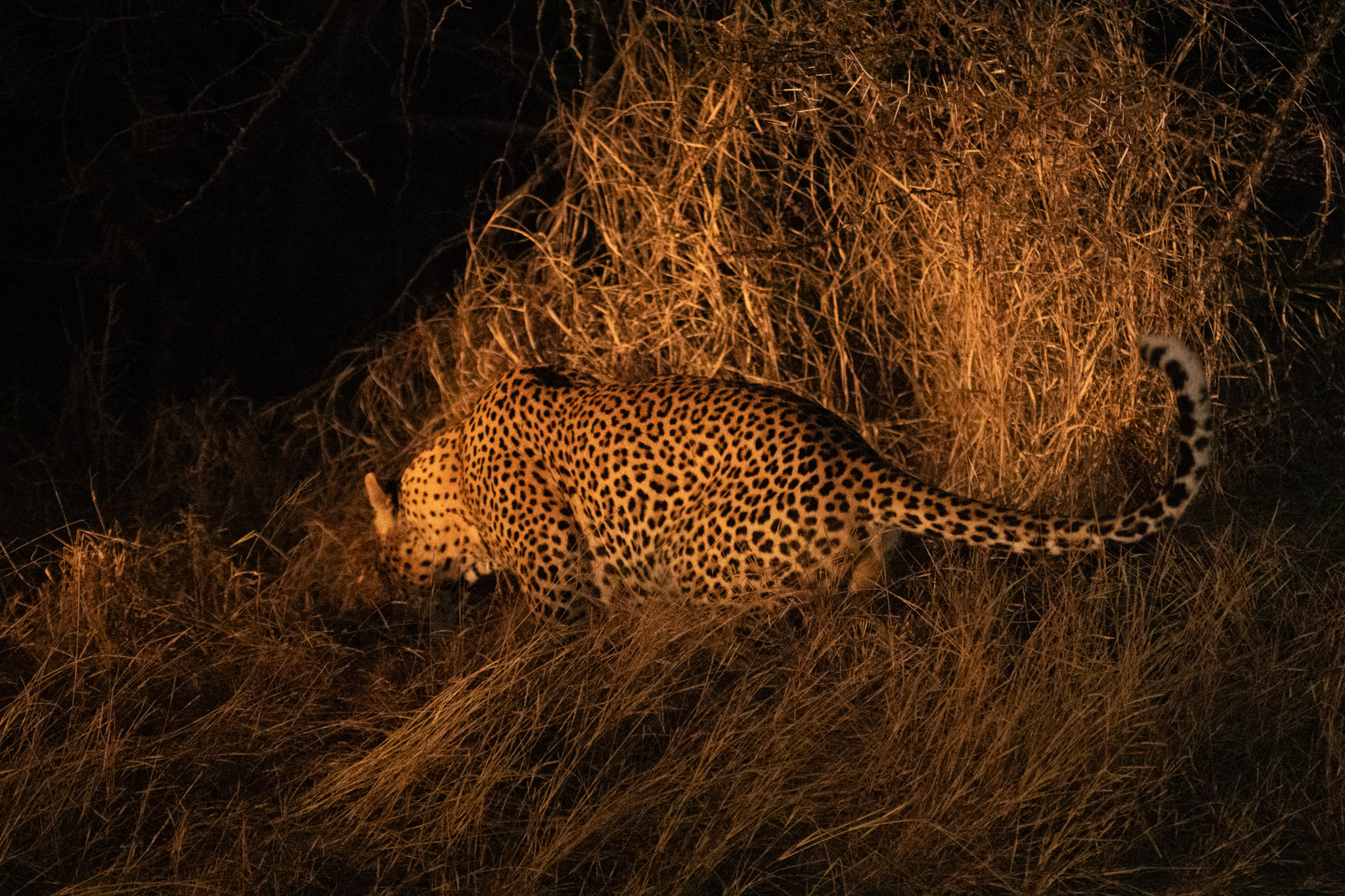 Ça y est l’heure du night drive est arrivé, on rejoint l’accueil où sont garées les voitures de safari. On est place plus en hauteur que dans les voitures standard par contre c’est à découvert et on craint de prendre froid. On s’est habillé chaudement en conséquence et on a même emmené la couverture d’appoint de la chambre pour la mettre sur les genoux. On est un petit groupe ce soir principalement composé de français. A peine sorti de la porte du camp, on aperçoit un léopard qui en train de chasser.