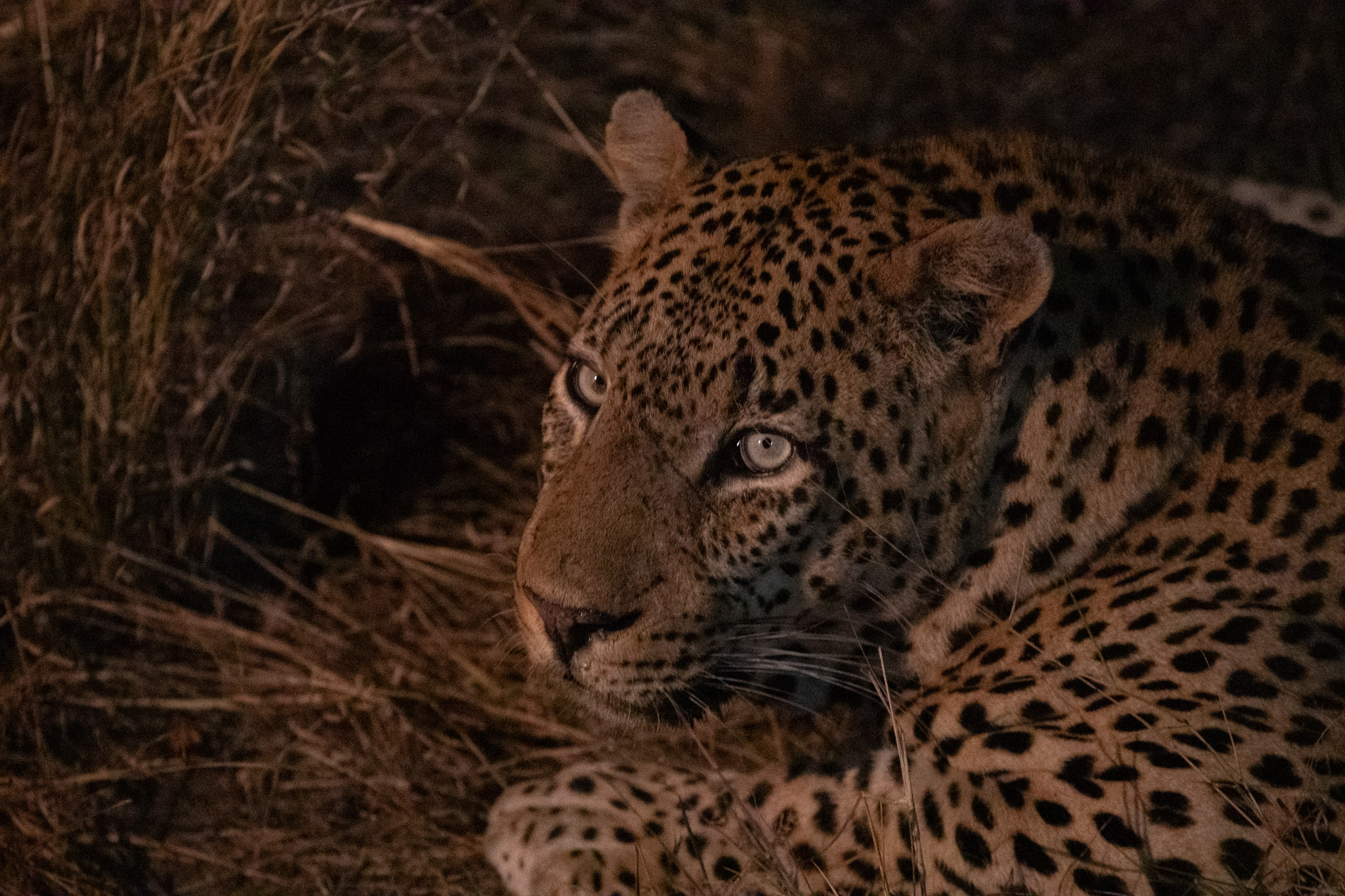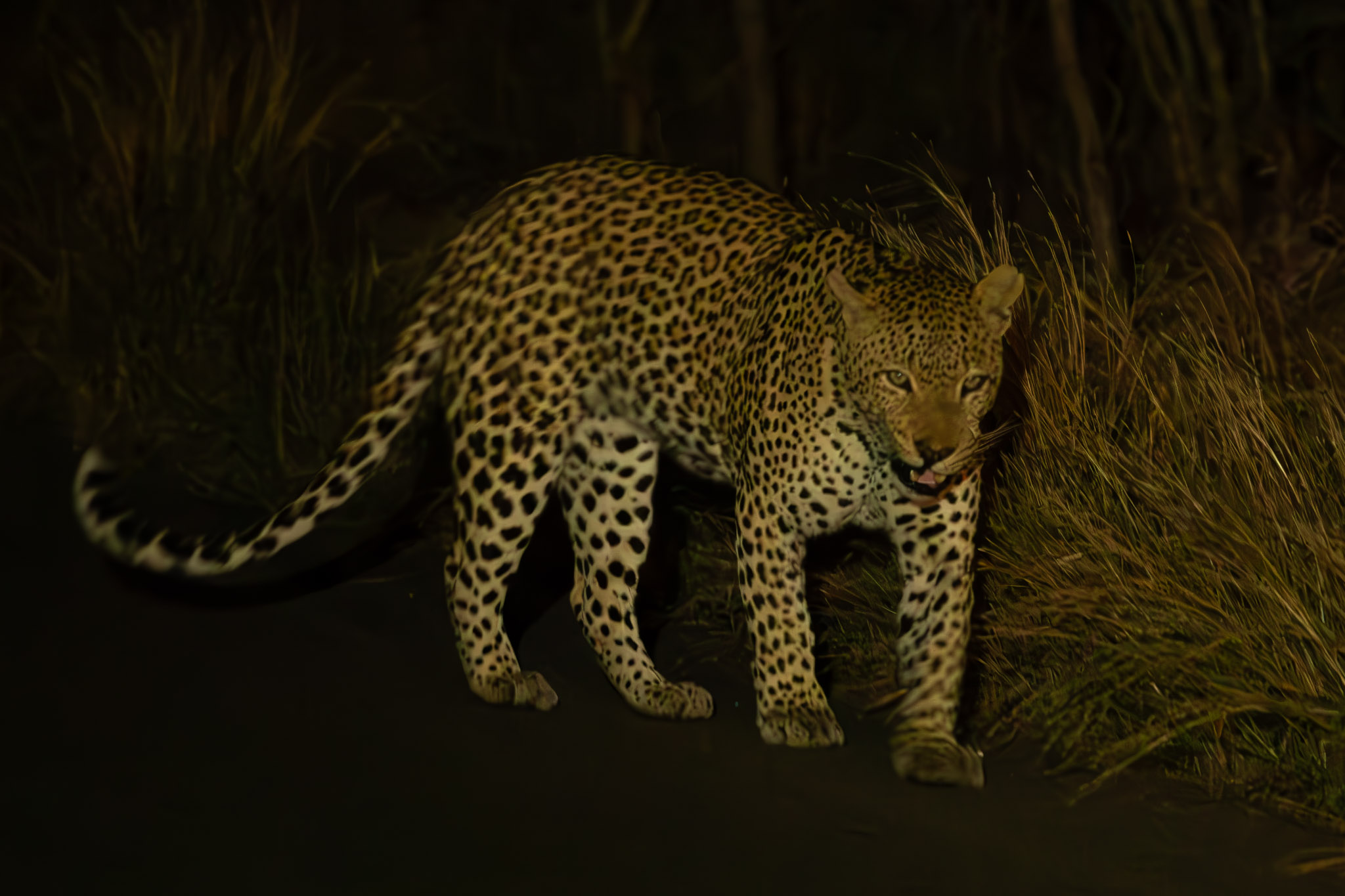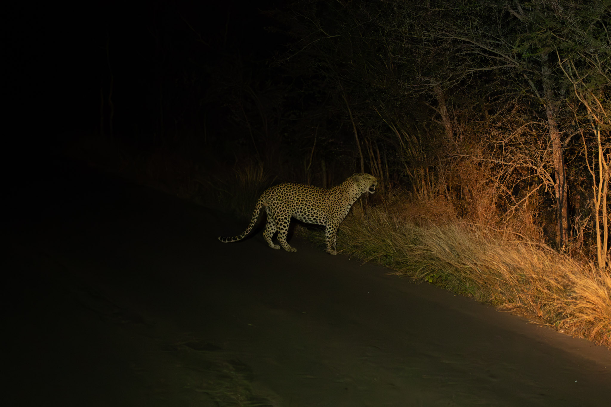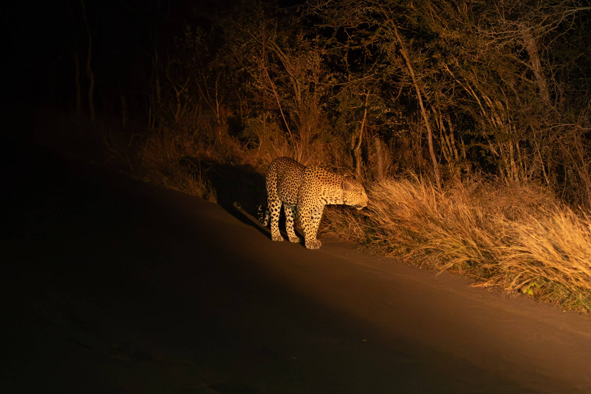 Ça y est l’heure du night drive est arrivé, on rejoint l’accueil où sont garées les voitures de safari. On est place plus en hauteur que dans les voitures standard par contre c’est à découvert et on craint de prendre froid. On s’est habillé chaudement en conséquence et on a même emmené la couverture d’appoint de la chambre pour la mettre sur les genoux. On est un petit groupe ce soir principalement composé de français. A peine sorti de la porte du camp, on aperçoit un léopard qui en train de chasser.