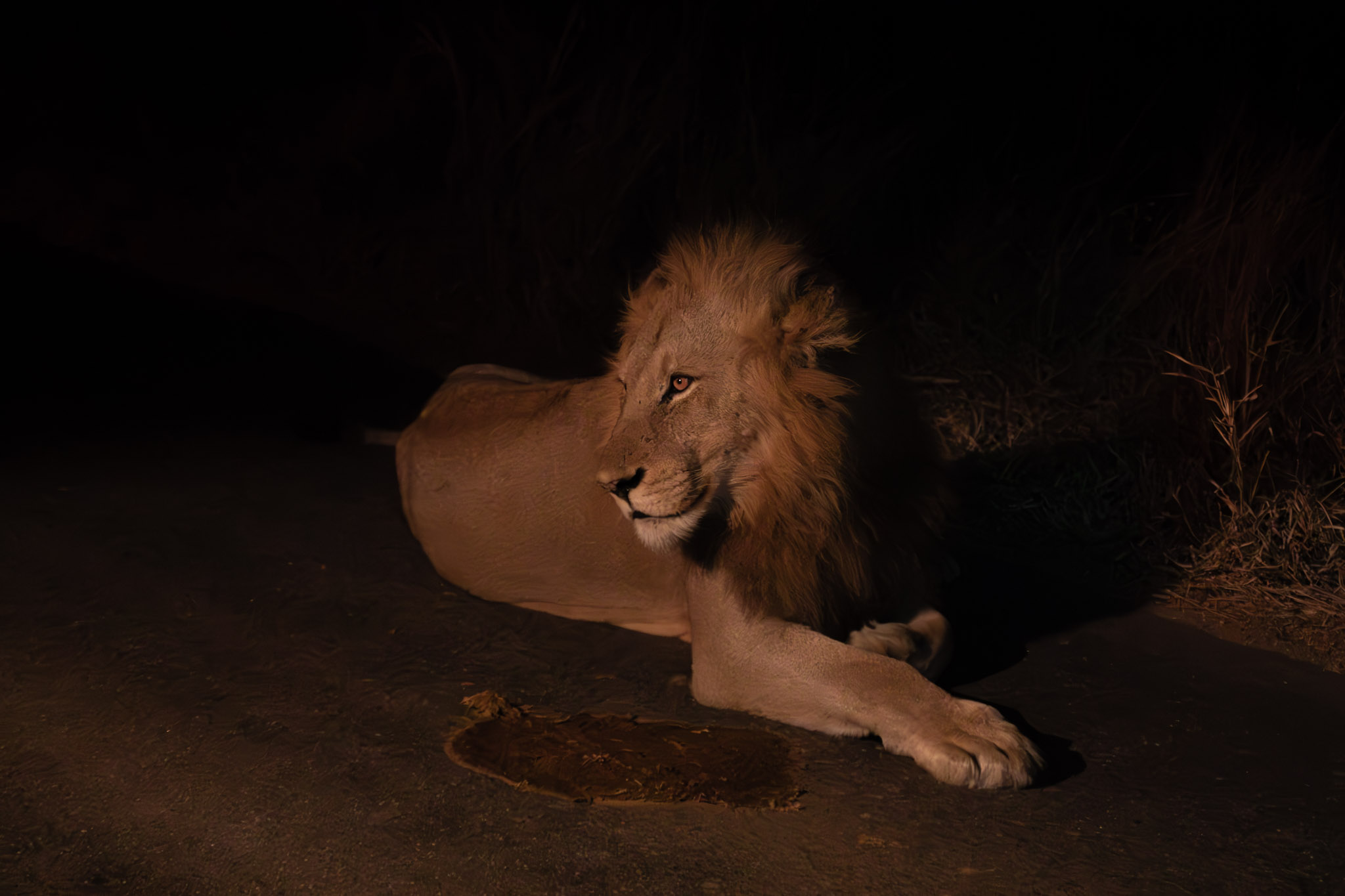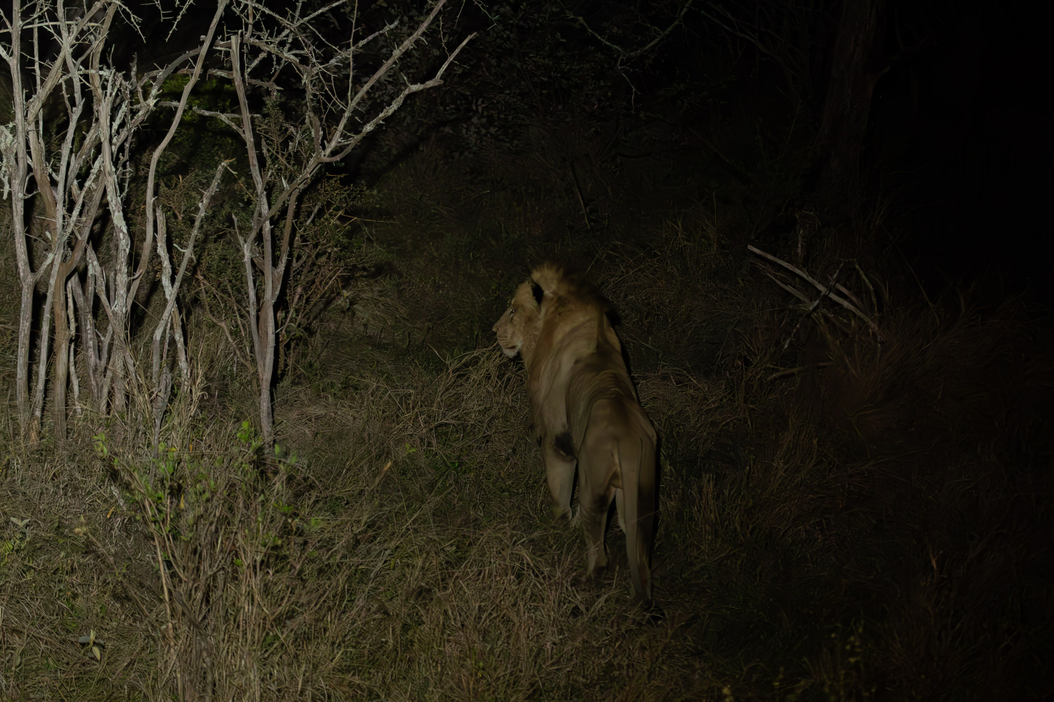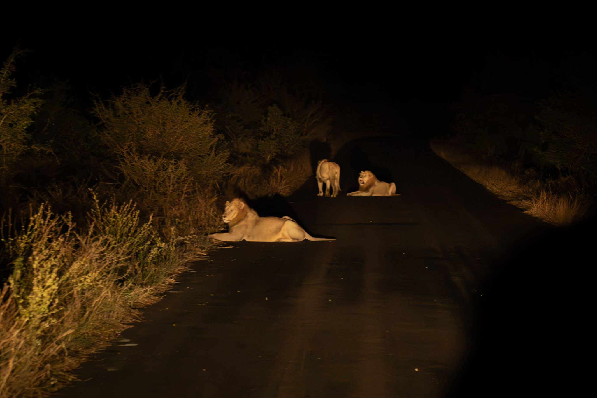 Le guide nous explique que les lions sont en train de préparer leur chasse nocturne et d’ailleurs certains disparaissent dans la nuit épaisse derrière des arbres.