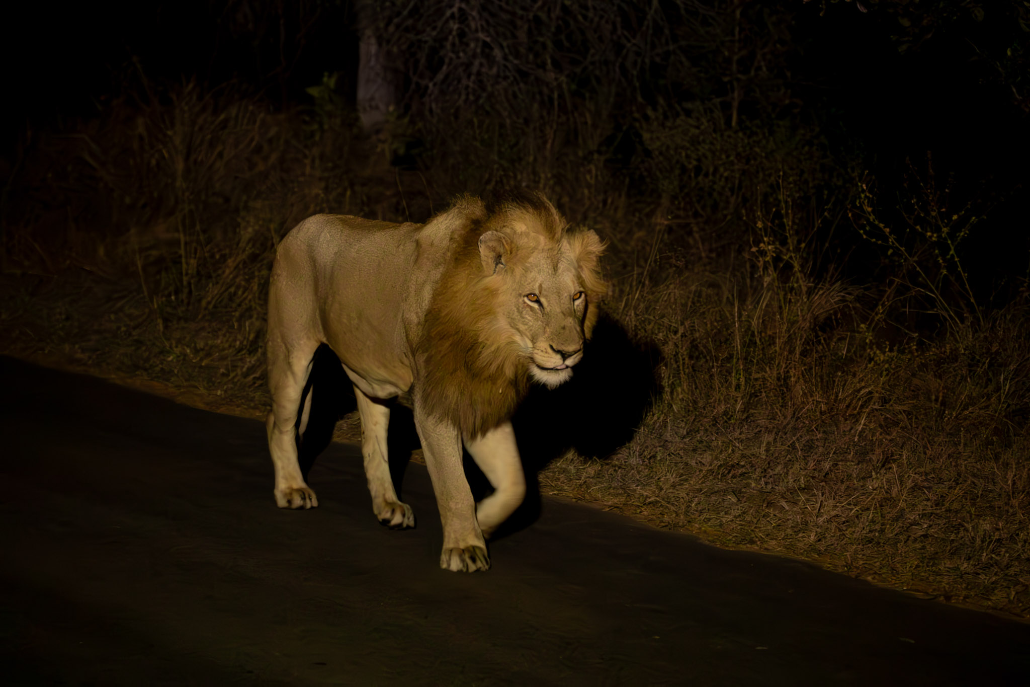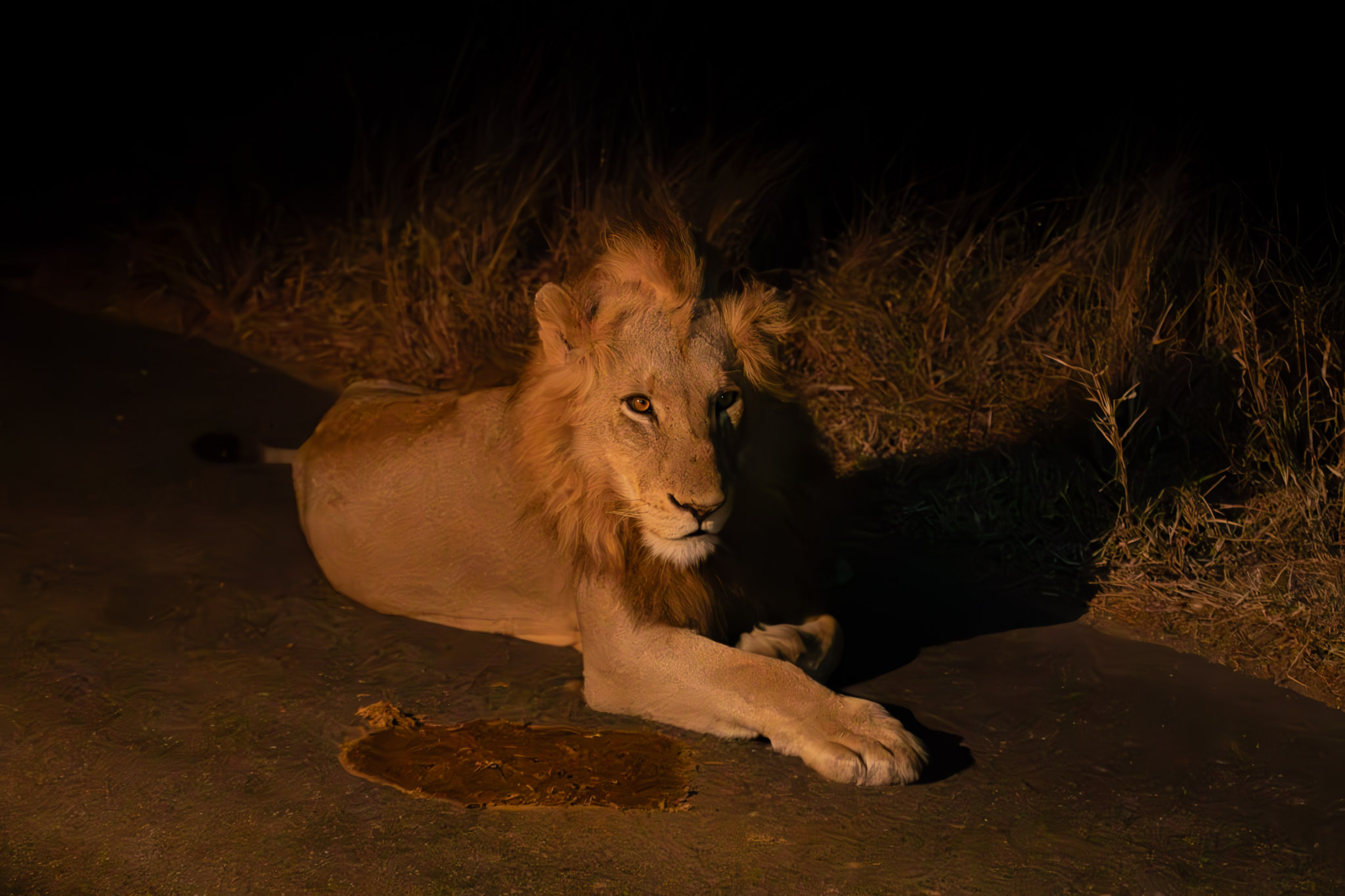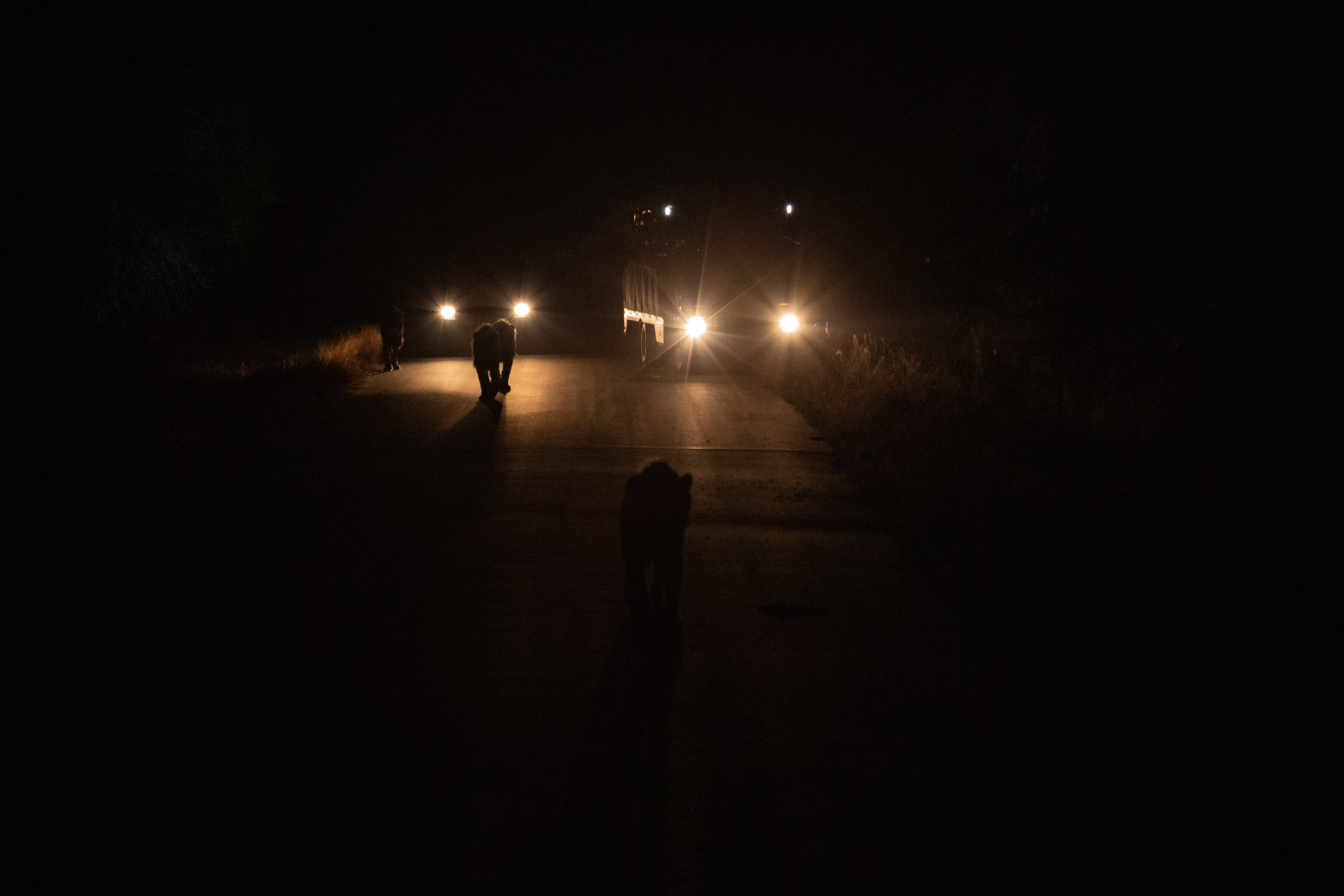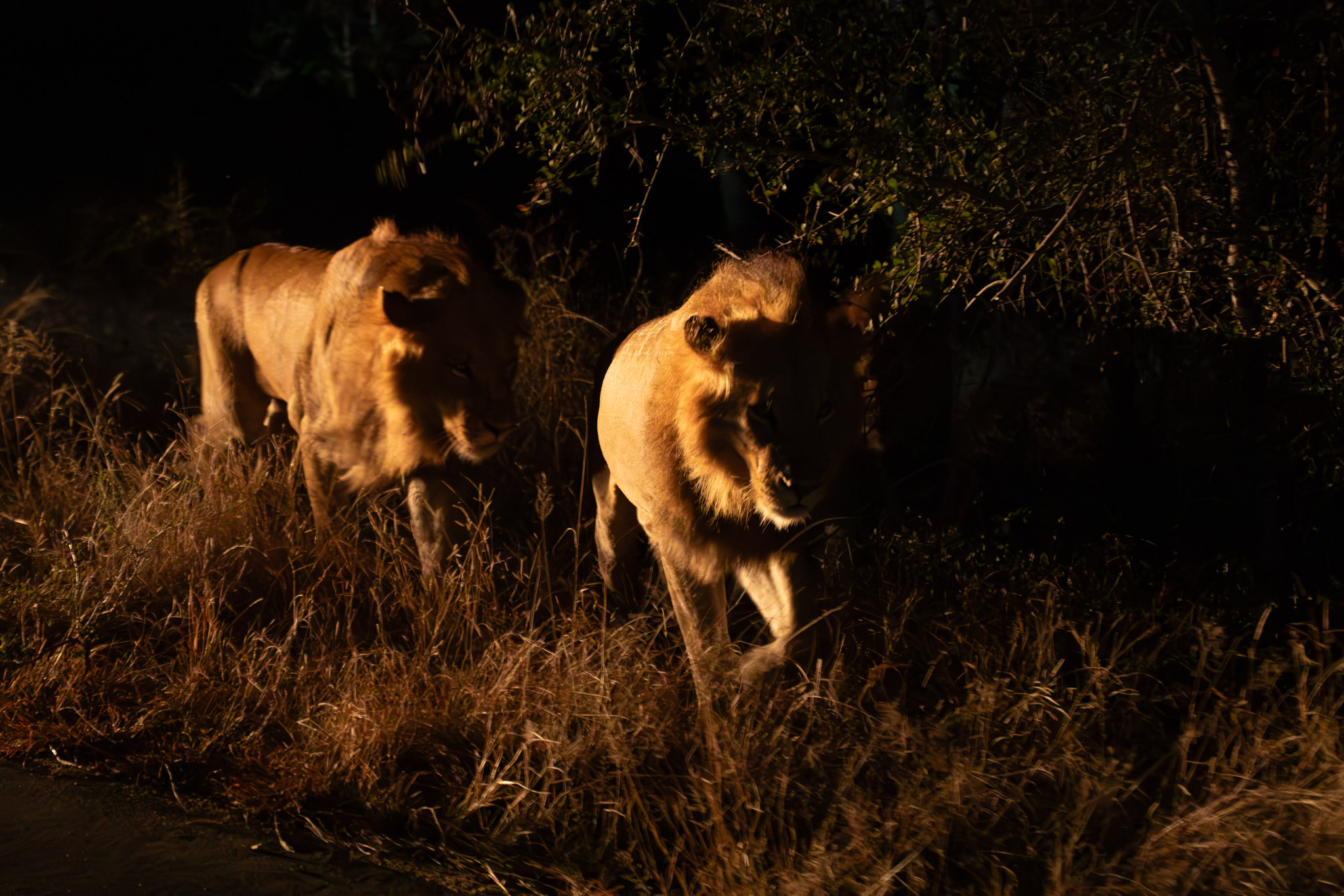 Le guide nous explique que les lions sont en train de préparer leur chasse nocturne et d’ailleurs certains disparaissent dans la nuit épaisse derrière des arbres.