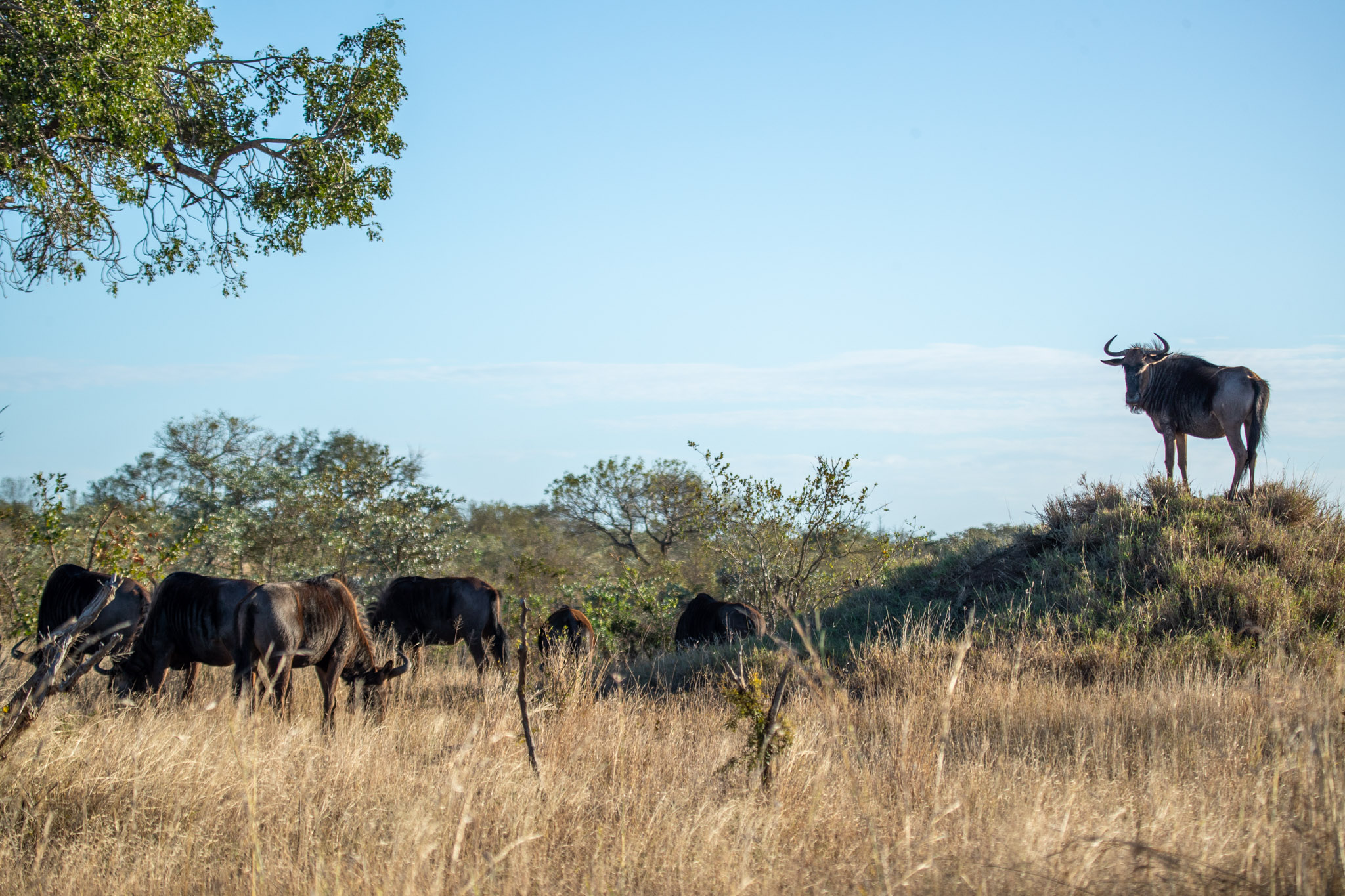 En continuant notre chemin, on tombe sur ce troupeau de gnous très intéressant. Un des gnous s'est installé sur un monticule de terre, et semble régner sur son clan. Il nous regarde avec attention.