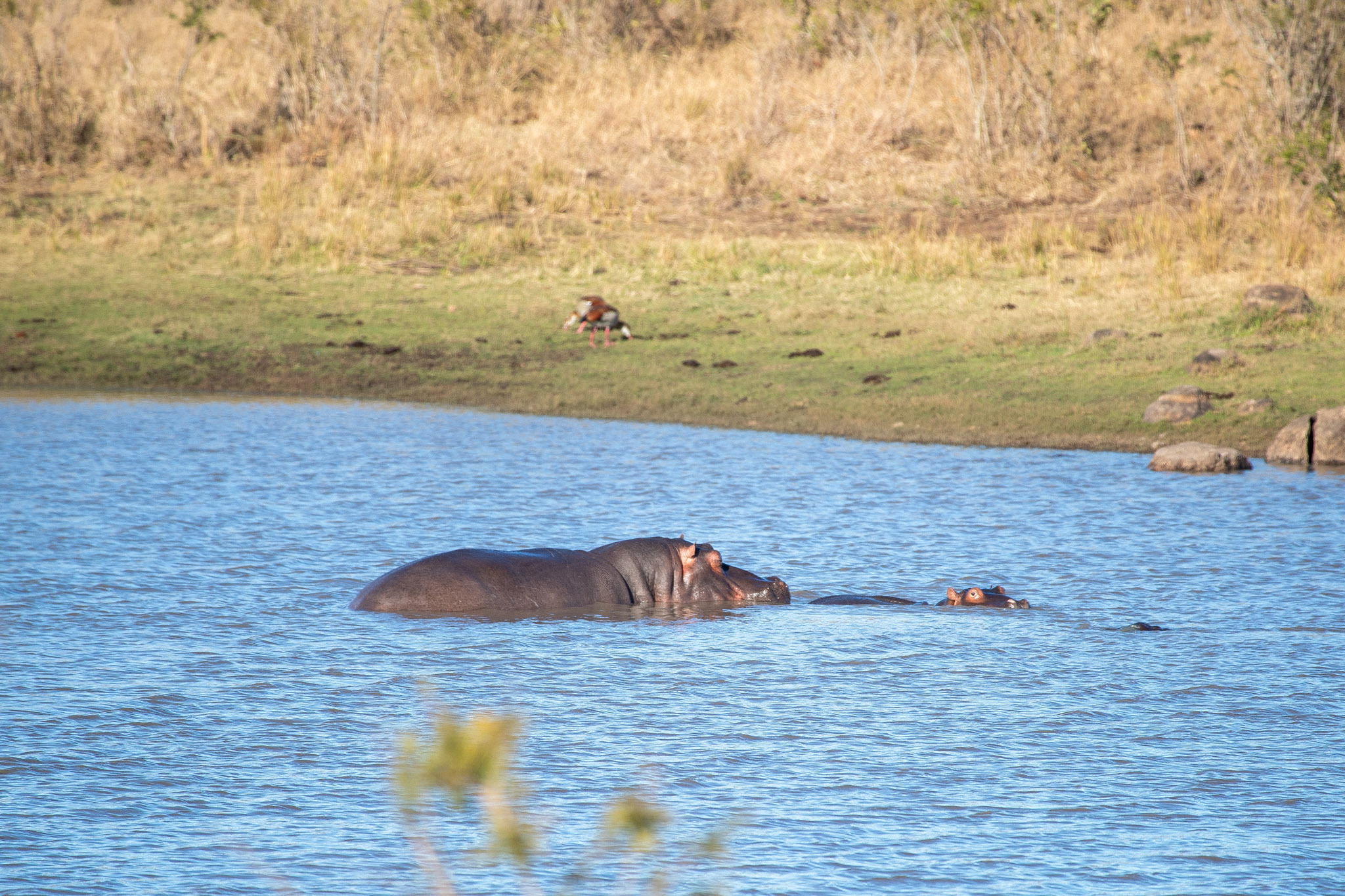 Lorsque nous retourne au plan d'eau malheureusement c'est trop tard, les hippopotames sont déjà en train de se baigner. On les a raté car il y a une heure le plan d'eau était encore vide. Finalement, ils ne sont pas encore complètement sous l'eau et on peut apprécier leur dimension de camion.
