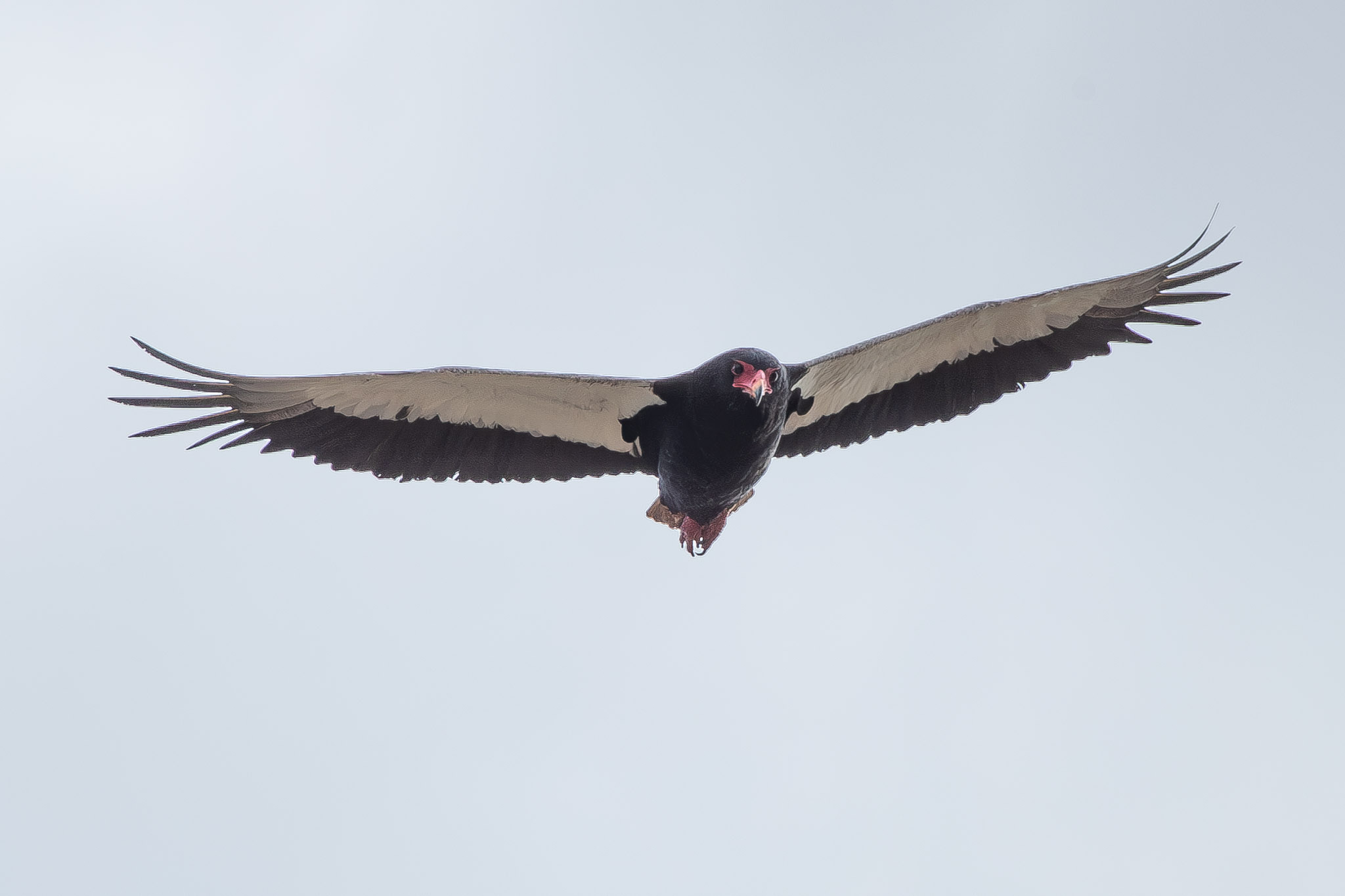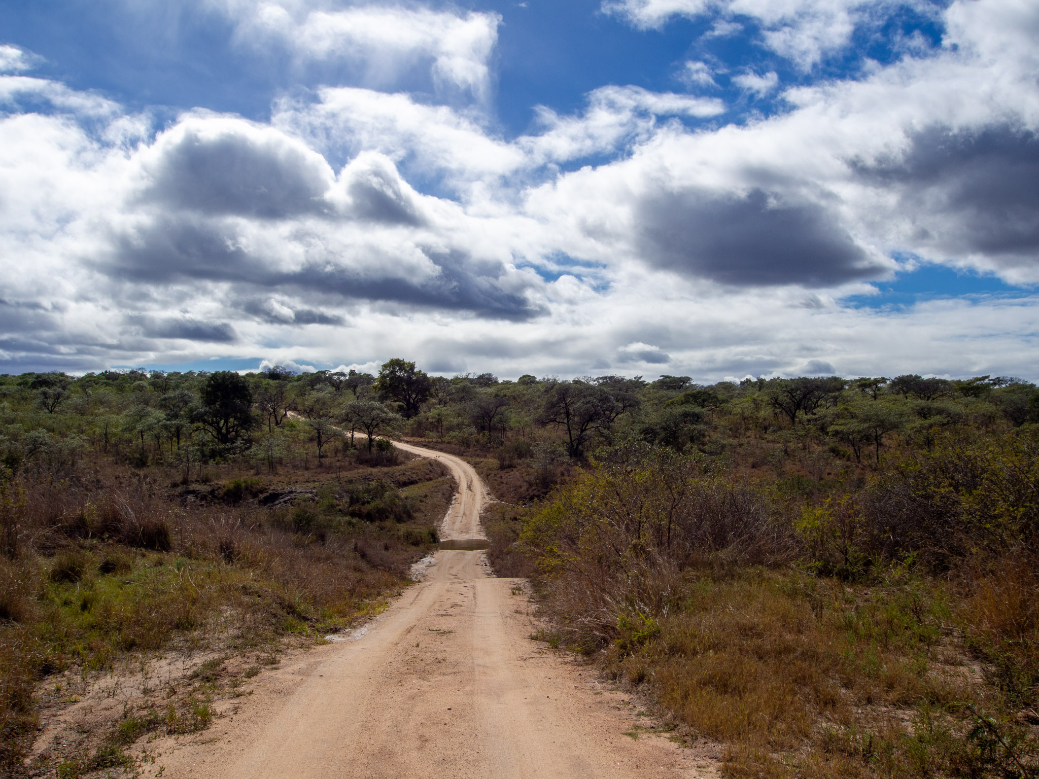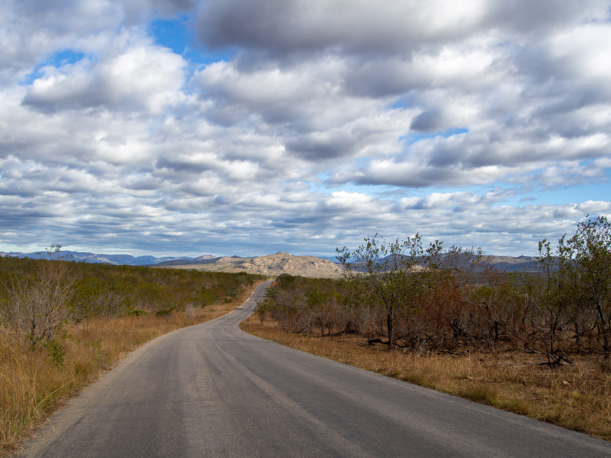 La route est belle dans le Sud du Kruger, les nuages ont une très belle forme et donne beaucoup de volume au ciel. Et en regardant le ciel, on voit un superbe aigle qui survole la voiture.