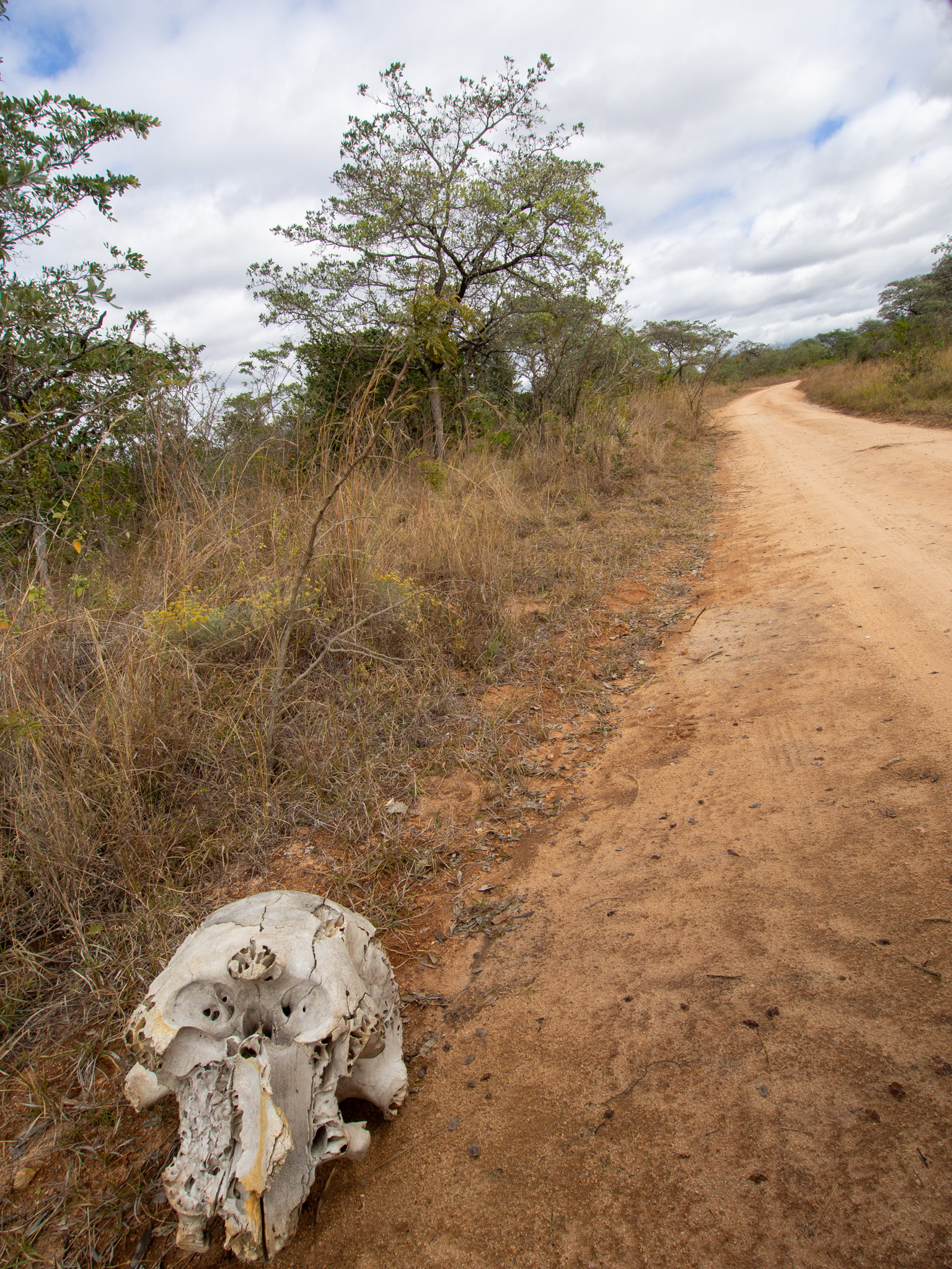 On s'amuse à rouler dans les flaques pour s'amuser, cela compense le manque d'animaux rencontrés. La quête est quand même pour le moment maigre. Si ce n'est cette tête d'éléphant qui git sur le bord de la route, vu son état, elle doit être depuis un bon moment.