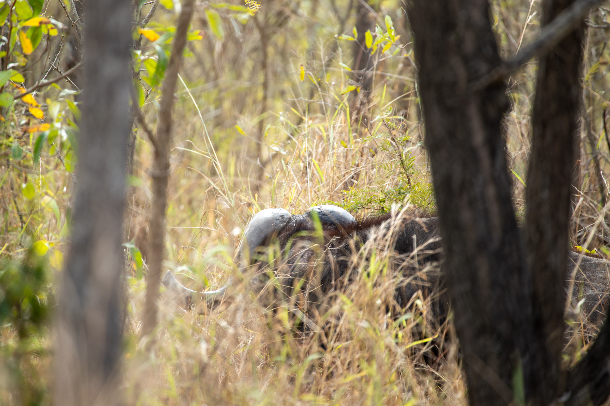 Assis dans l'herbe, on arrive à peine à distinguer un buffle. Il est bien camoufflé, et de dos mais c'est un bel animal, on n'en a pas vu de près depuis le début de notre séjour dans le Kruger.