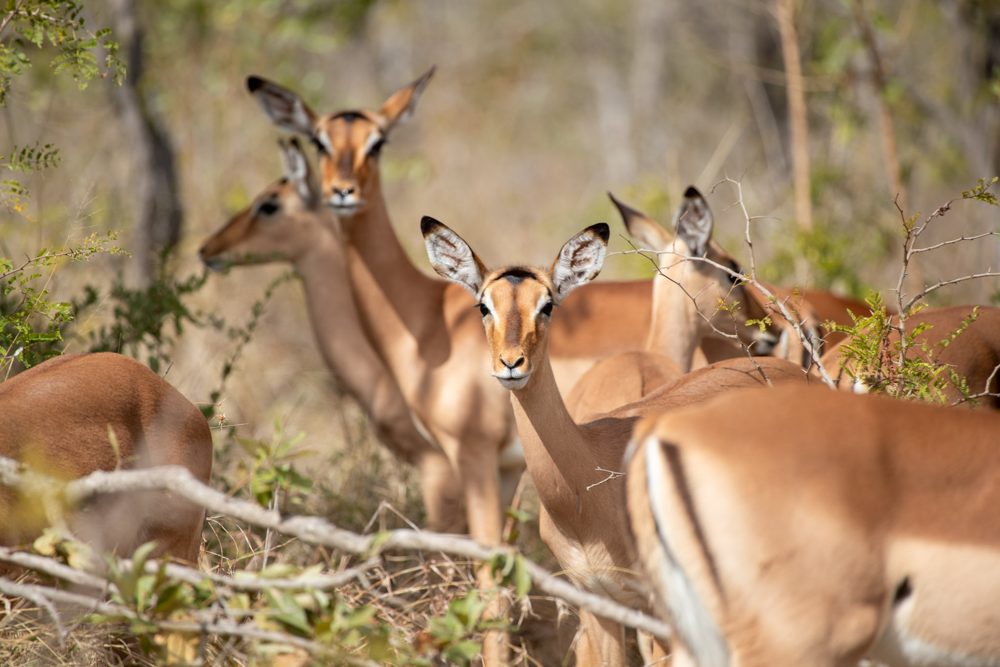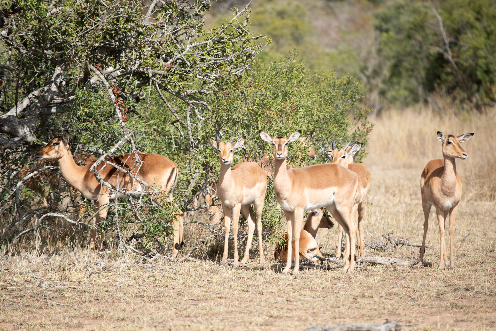 On retrouve encore un autre groupe d'impalas. Ces antilopes nous regardent fixement toutes en même temps.