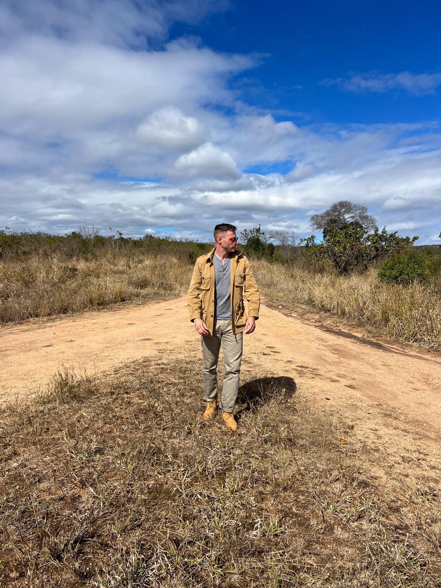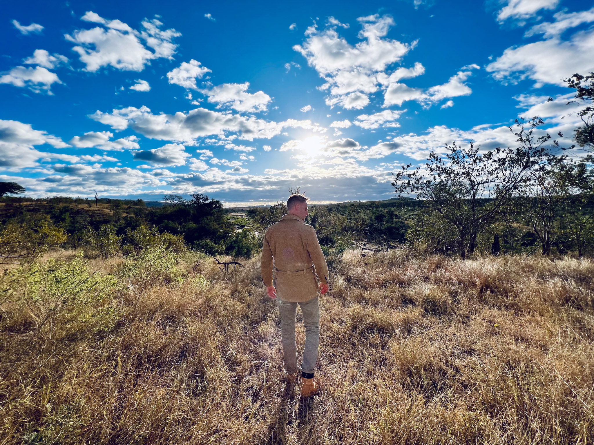 On traverse une zone plus ouverte, moins dense en végétation. On peut bifurquer sur une autre piste nous amène vers des panneaux d'information sur l'histoire du parc du Kruger et son fondateur. A cet endroit, il y a une clairière à découvert. On a vraiment besoin de faire un petit arrêt pour des besoins naturels, le prochain camp est quand même assez loin donc on se dit que l'on a pas de meilleur choix que de s'arrêter ici et sortir de la voiture. On reste bien attentif à ce qu'il n'y ait pas d'animaux dangeureux qui s'approchent. On sait que c'est interdit, mais là on a vraiment pas le choix... Puis finalement on en profite un peu pour faire une petite photo en dehors de la voiture.