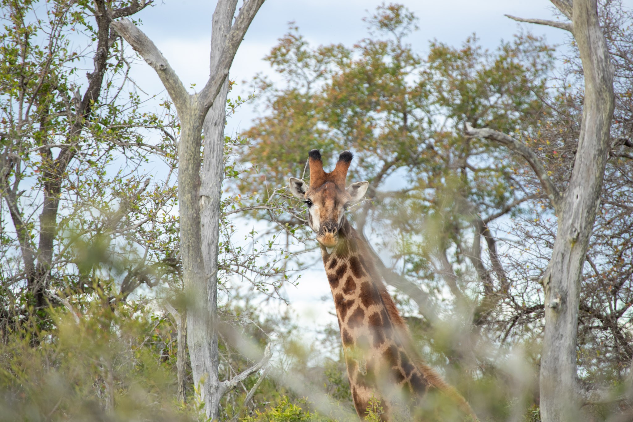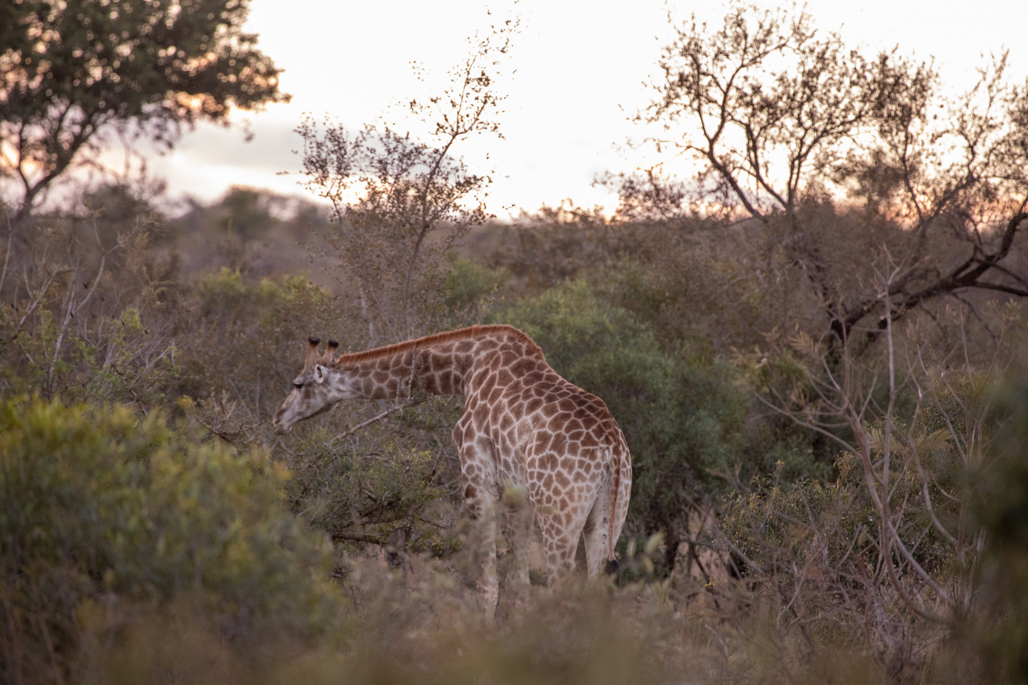 Enfin, nous tombons sur un des deux objectifs que l'on s'était donné pour ce jour la girafe et le rhinocéros. Une girafe mange les feuilles d’un arbre juste à côté de la route. Cela aura été difficile de voir des girafes pendant ce séjour en Afrique du Sud, étonnamment l’animal le plus rare pour nous.