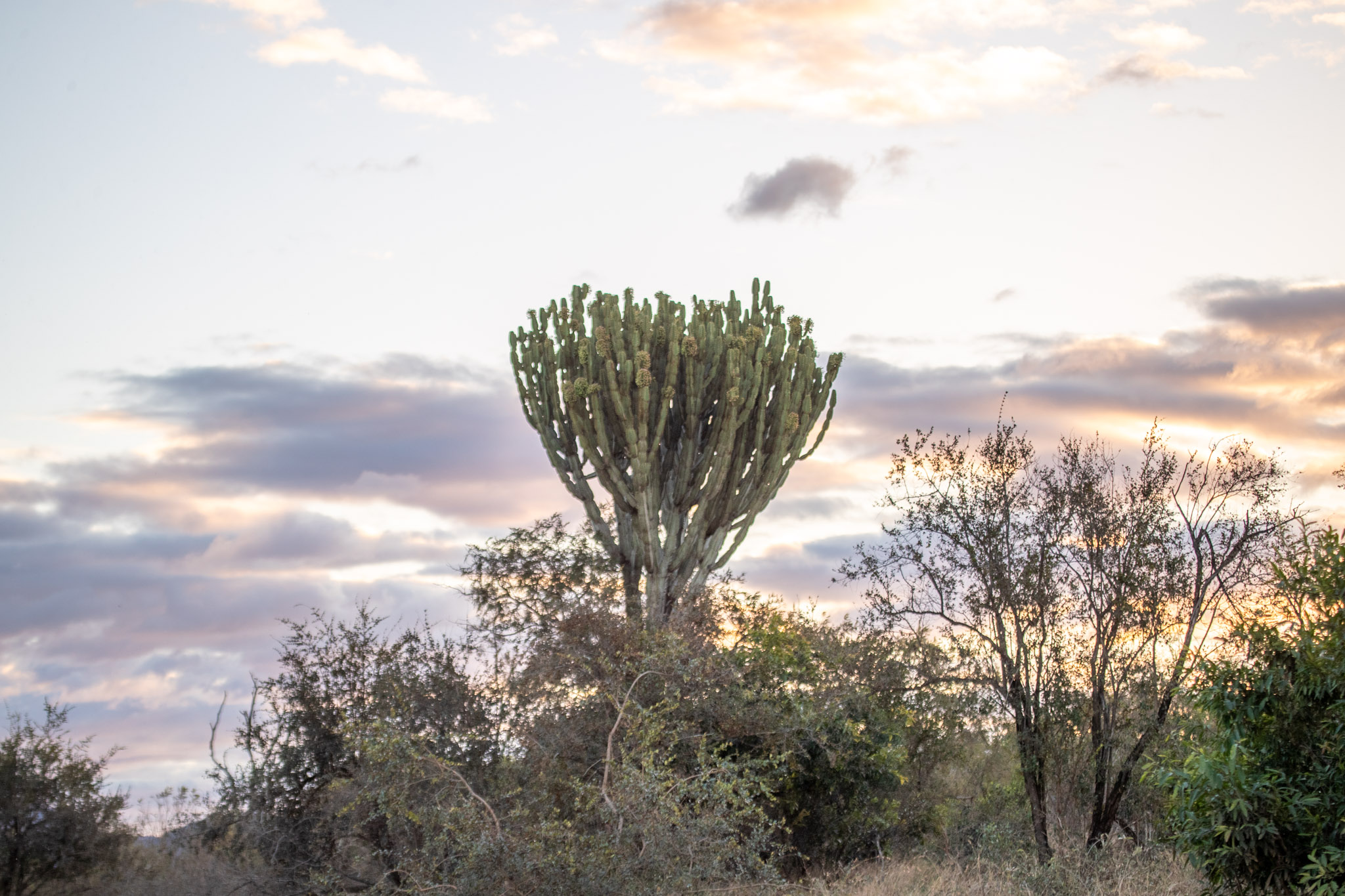 On croise maintenant une hyène qui traverse la route. On fait donc un nouvel arrêt, mais ça va trop vite, impossible de sortir l'appareil photo à temps. On ne voit que son postérieur et en plus c'est flou. En fin de journée, difficile de faire des photos bien nettes. On prend le temps de prendre en photo ce beau cactus avec les belles lueurs du soir si douces.