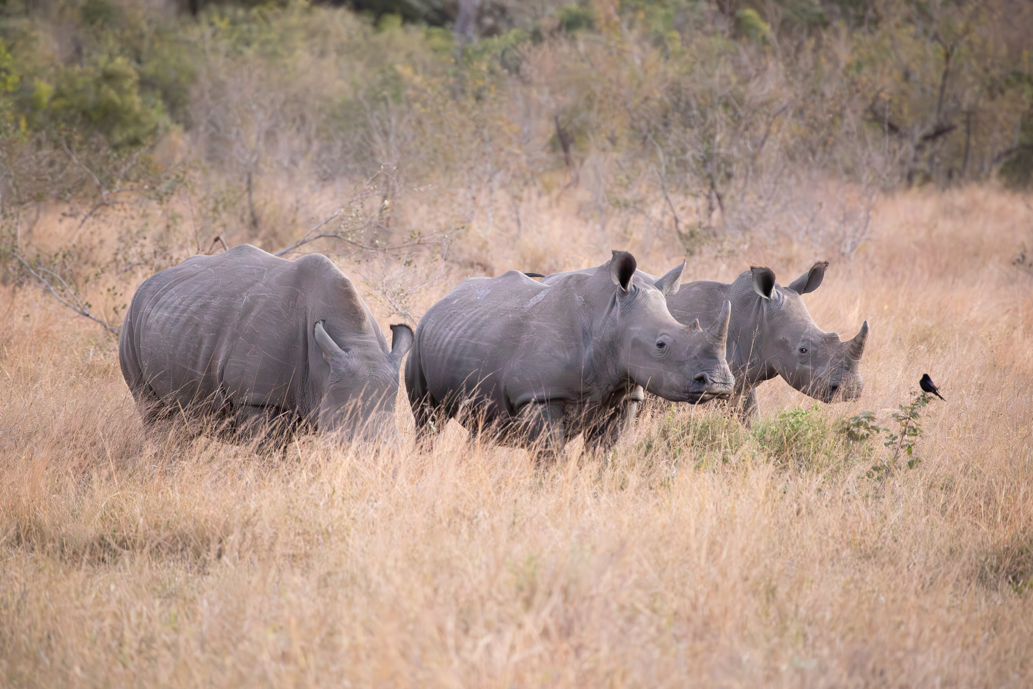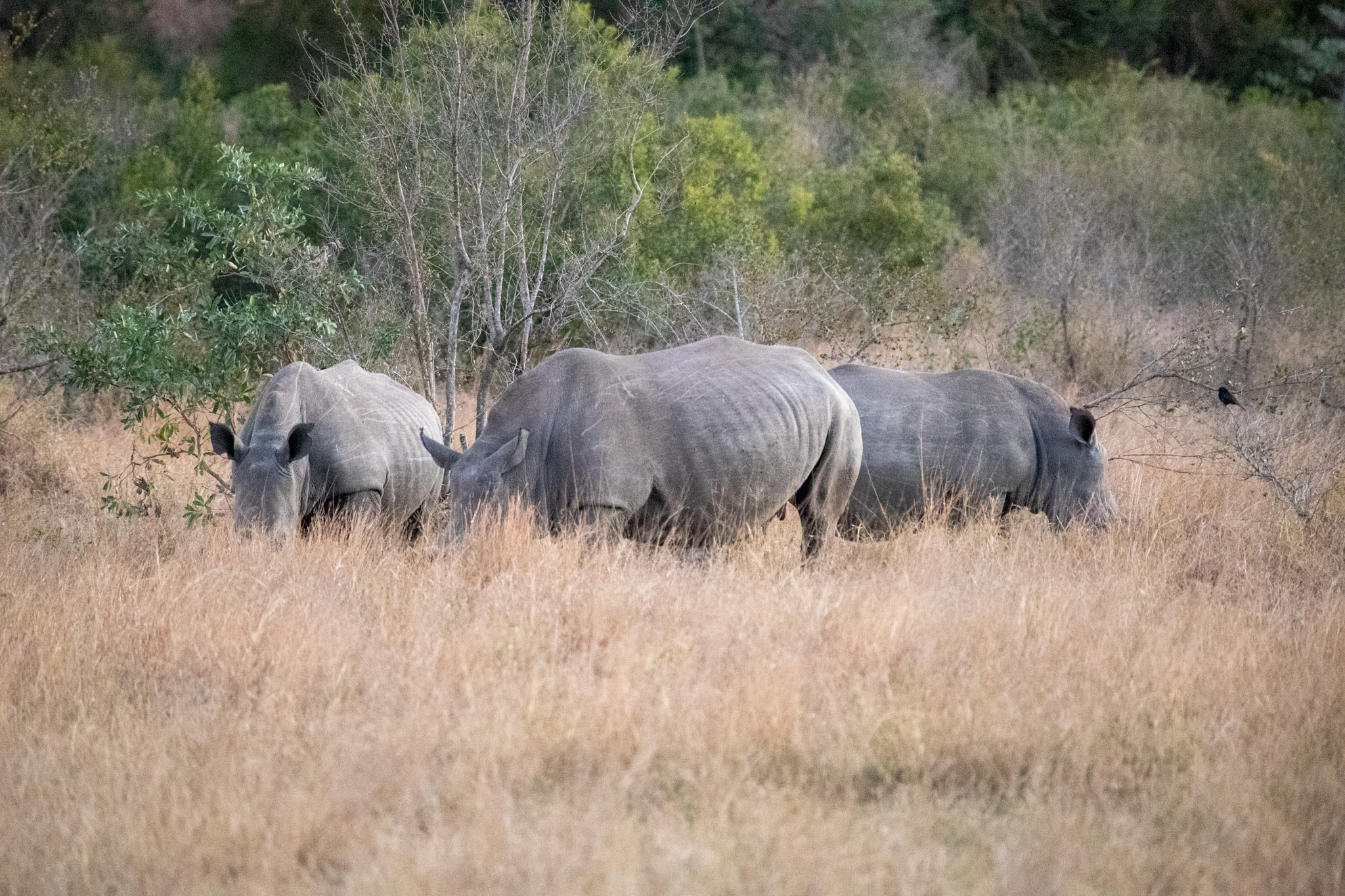 Ces trois rhinocéros sont assez proche de nous. Ce sont des rhinocéros blancs, on le remarque à leur bouche large et plate, ce sont eux les plus communs dans le parc du Kruger, il en reste environ 3000.