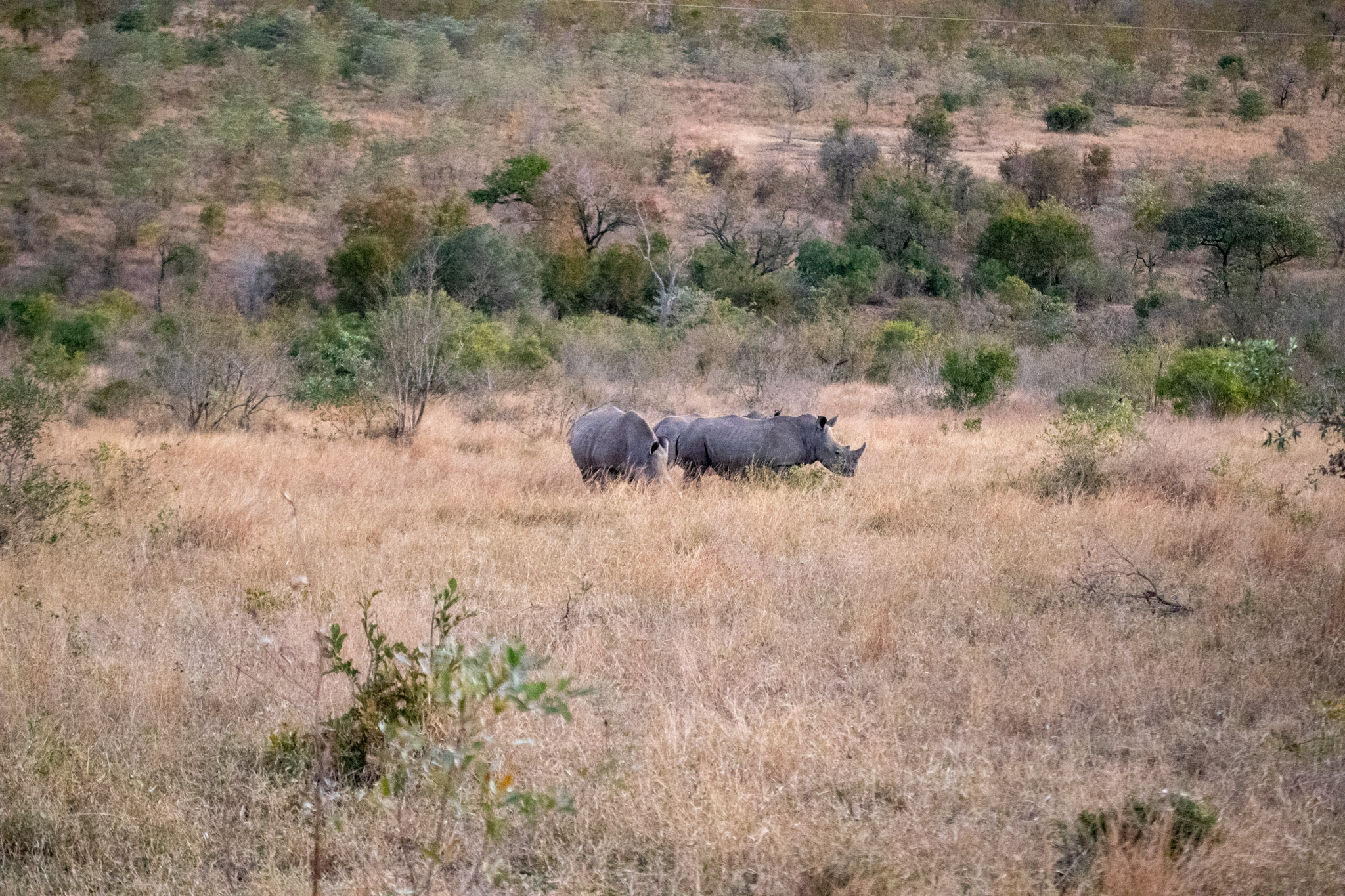 Et pour finir cette journée en beauté, on aperçoit trois rhinocéros en train de brouter en contrebas. Nos premiers rhinocéros! On est tellement excités !
