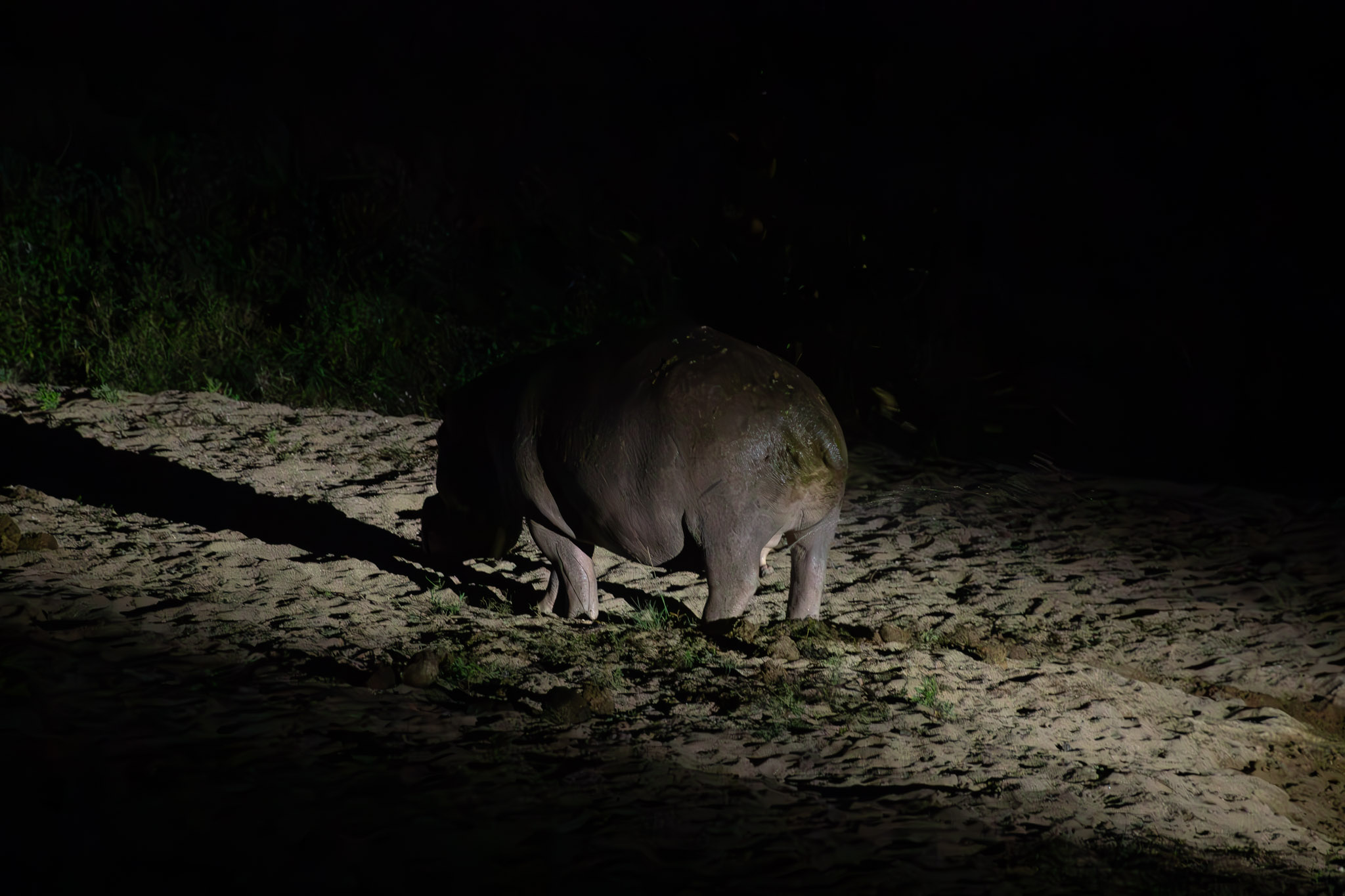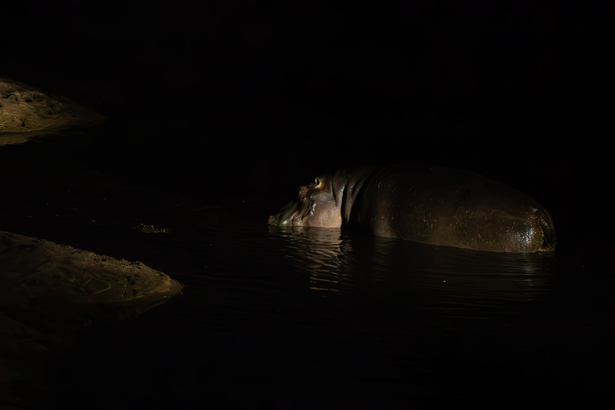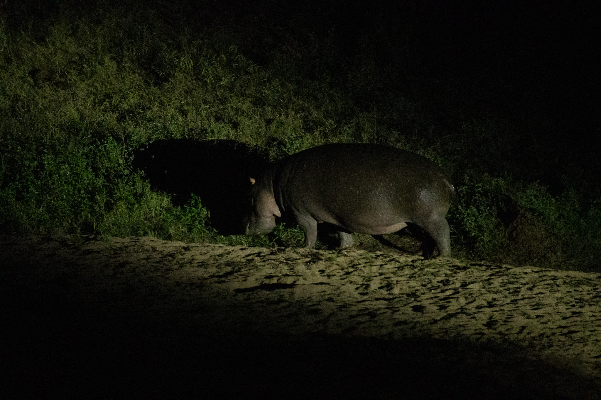 Jusqu’à maintenant on avait vu les hippopotames dans l’eau seulement et qu’en partie de leur corps. En cherchant sur internet on avait découvert que les hippopotames passaient la majeure partie de la journée dans l’eau et sortait le soir pour se nourrir. Autre fait intéressant qui nous an encore plus fait aimer cet animal, les mâles marquent leur territoire avec leur urine et caca et pour couvrir de leur odeur plus de territoire, ils utilisent leur queue comme les palles d’un ventilateur pour pulvériser aux alentours leurs excréments. On veut arriver au moment de sa sortie du bain pour voir cela de nos propres yeux. Assis sur un banc face au plan d’eau on attend, bercé par les cris des oiseaux posés dans les arbres autour. Une famille sud-africaine est à côté de nous, ils ont un projecteur ce qui permet d’éclairer le plan d’eau suffisamment. Puis comme prévu les hippopotames sortent finalement de l’eau.