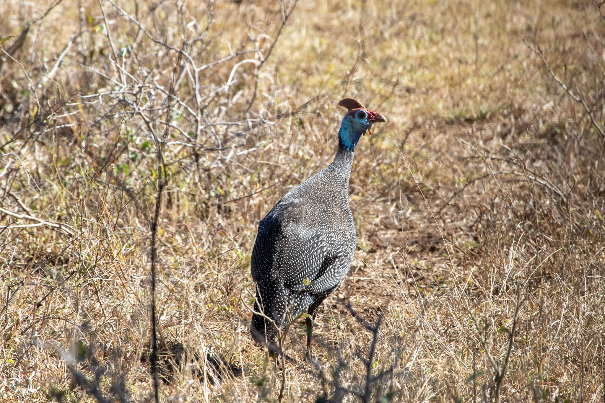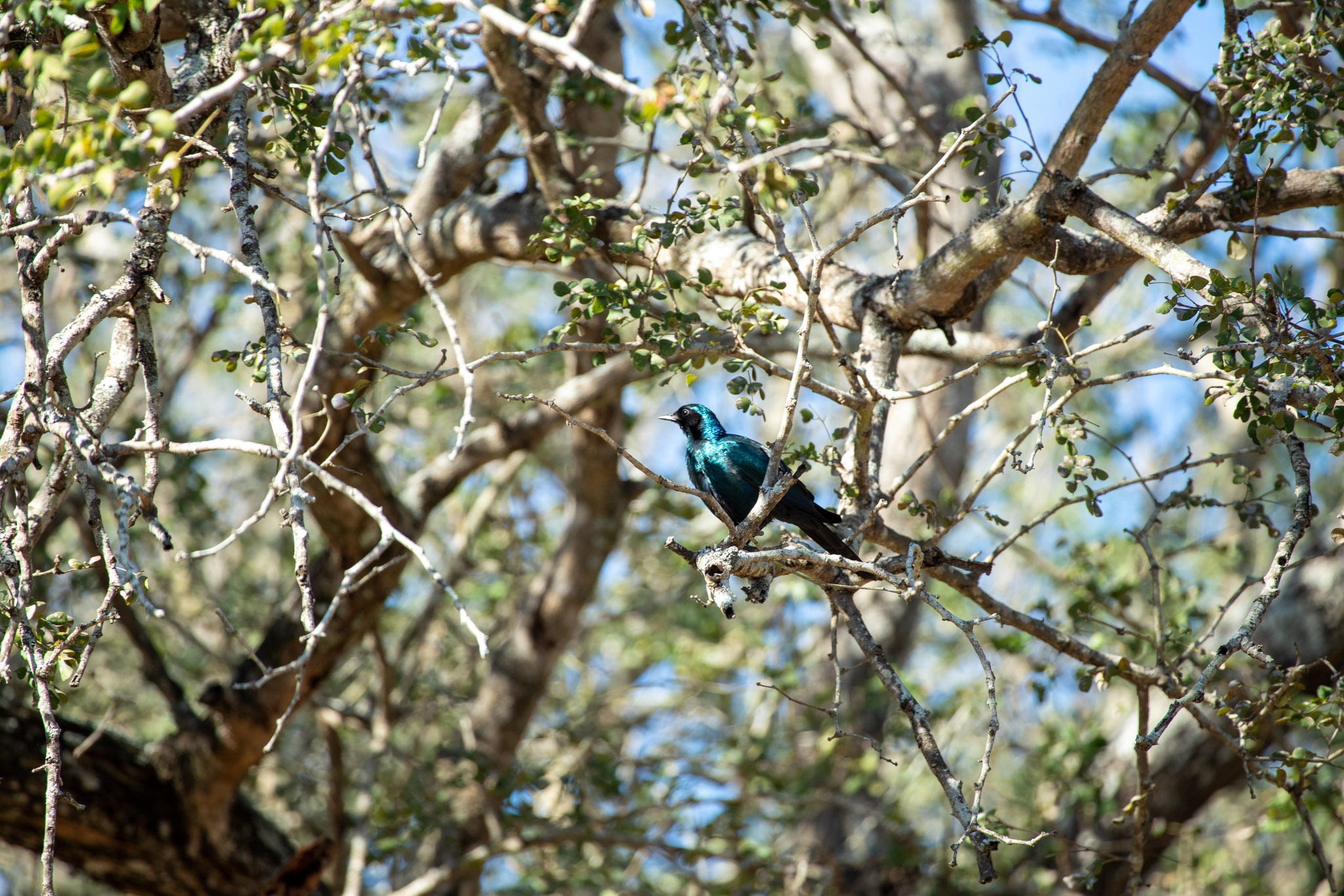 Dans les arbres, un oiseau avec le plumage magnifiquement lumineux nous attire, son bleu change en fonction des rayons du soleil, c'est très beau. Ce n'est pas le même oiseau que l'on a vu très souvent dans le Kruger et qui lui ressemble beaucoup. La différence est que celui-ci n'a pas les yeux oranges.