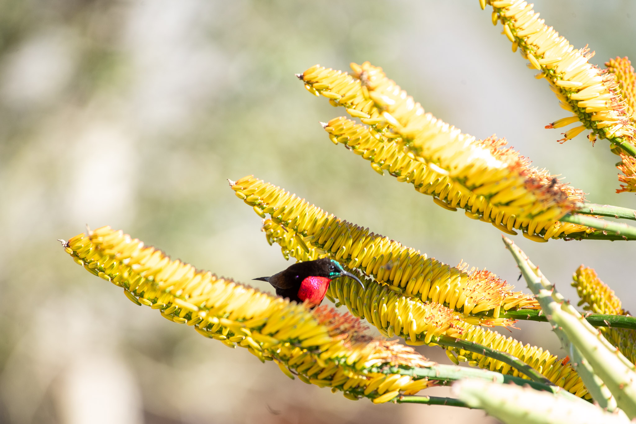 Un autre oiseau partage cet arbre, celui-ci a un long bec qui lui permet d'aller chercher de la nourriture tout au fond des fleurs, son corps est noir et le ventre d'un rouge intense.