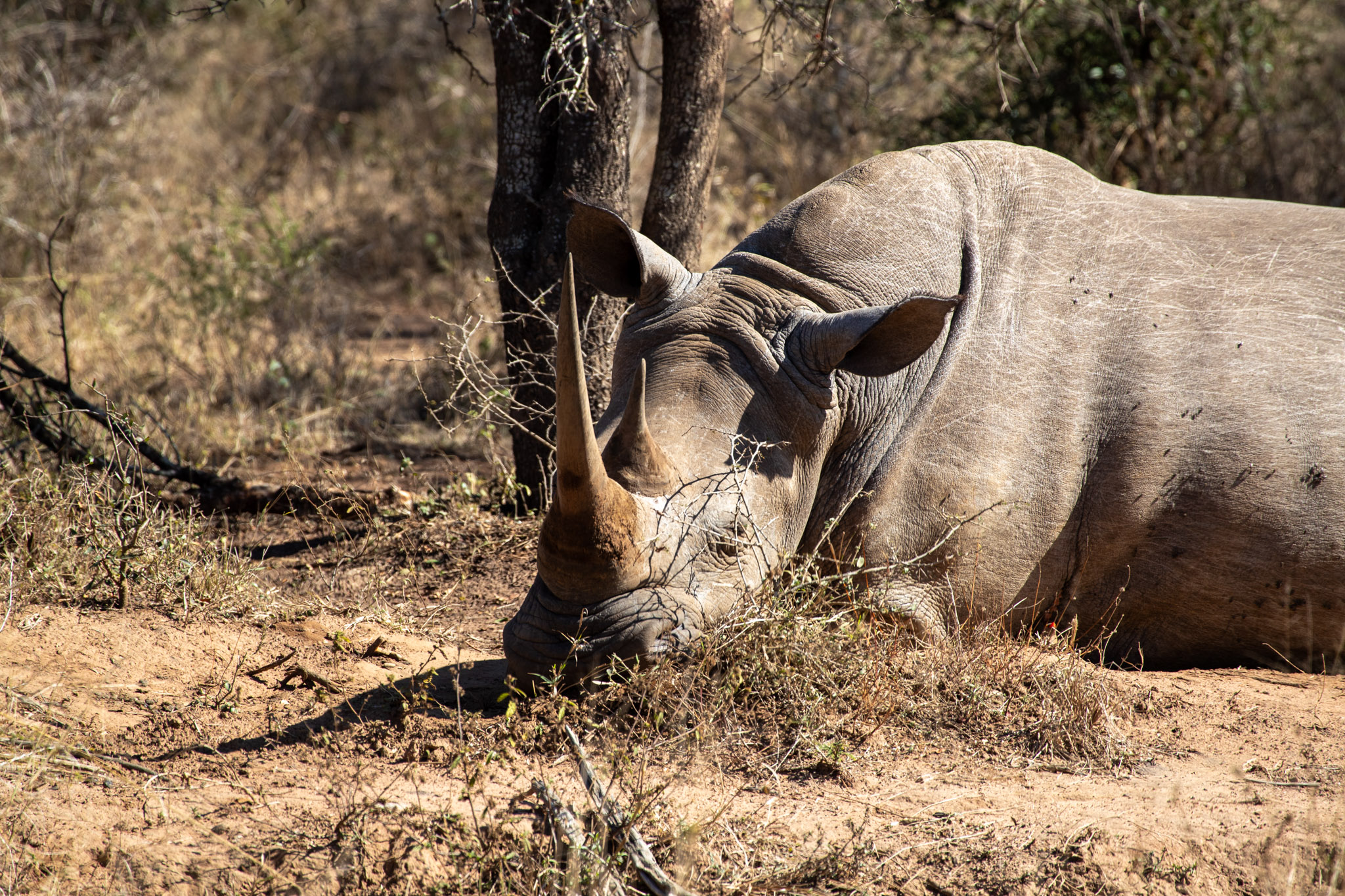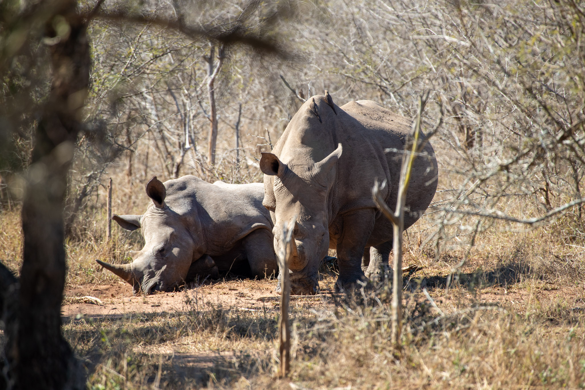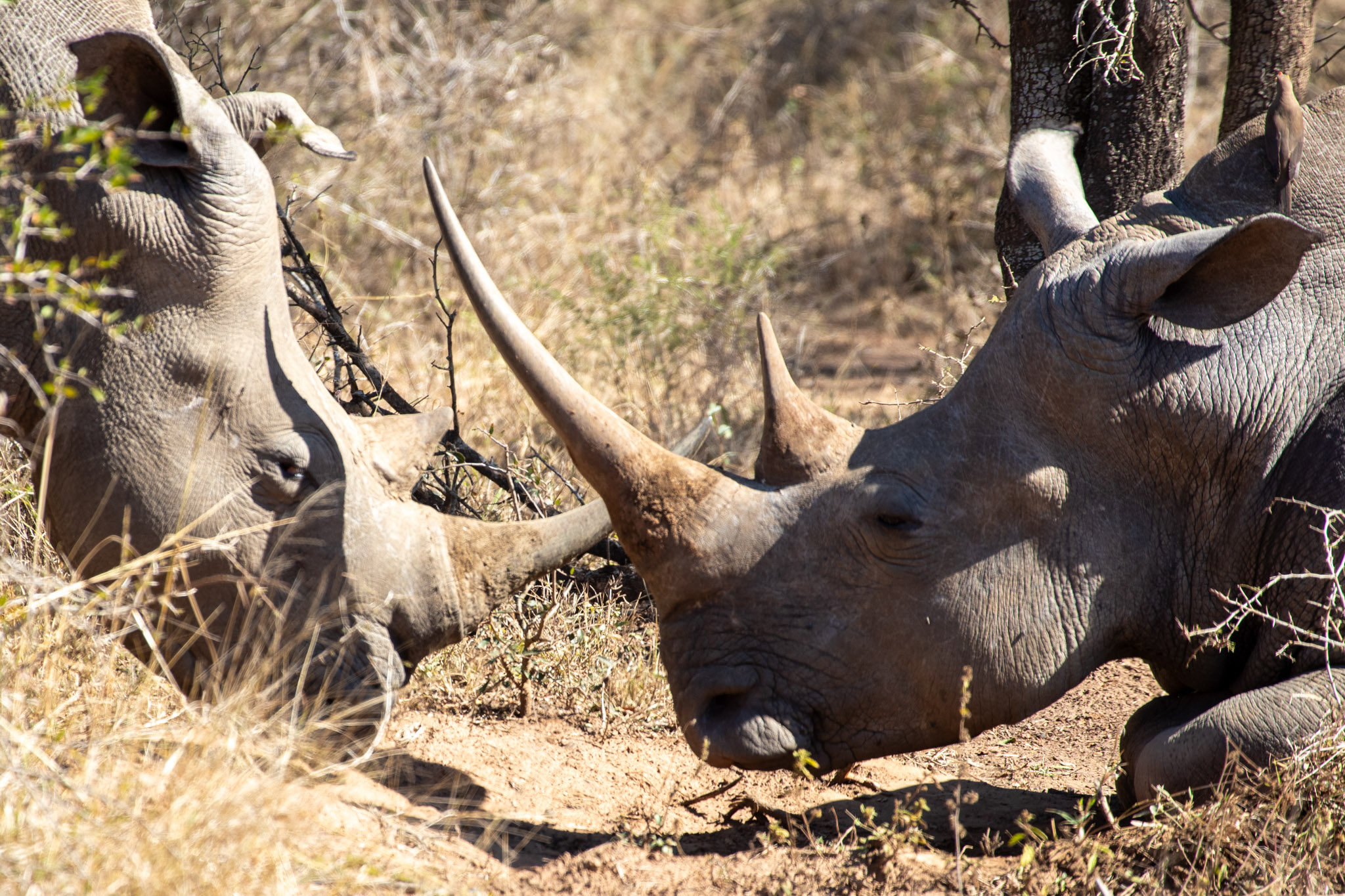 On croise sur le bord de la route deux rhinocéros femelles en train de dormir. On ne peut pas passer, ce serait risqué. On reste là donc bien installé dans la voiture surélevée. Le guide nous explique que ce sont deux femelles meilleures amies qui sont toujours ensemble. Elles ont une très longue corne.