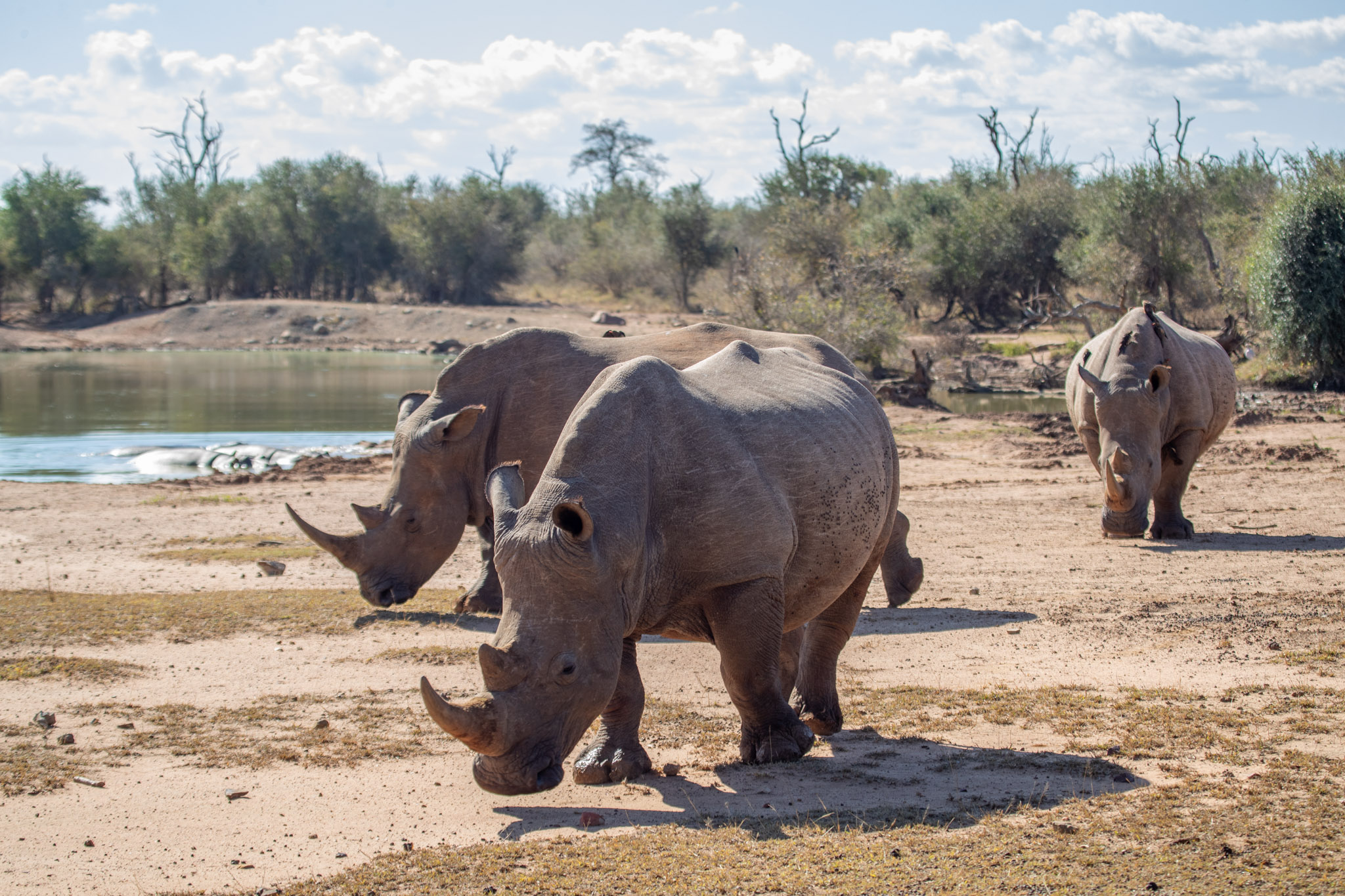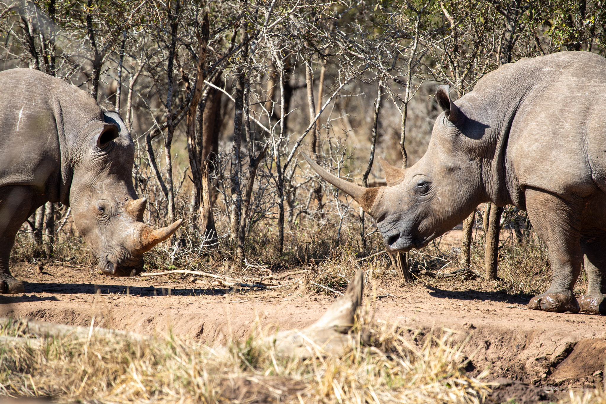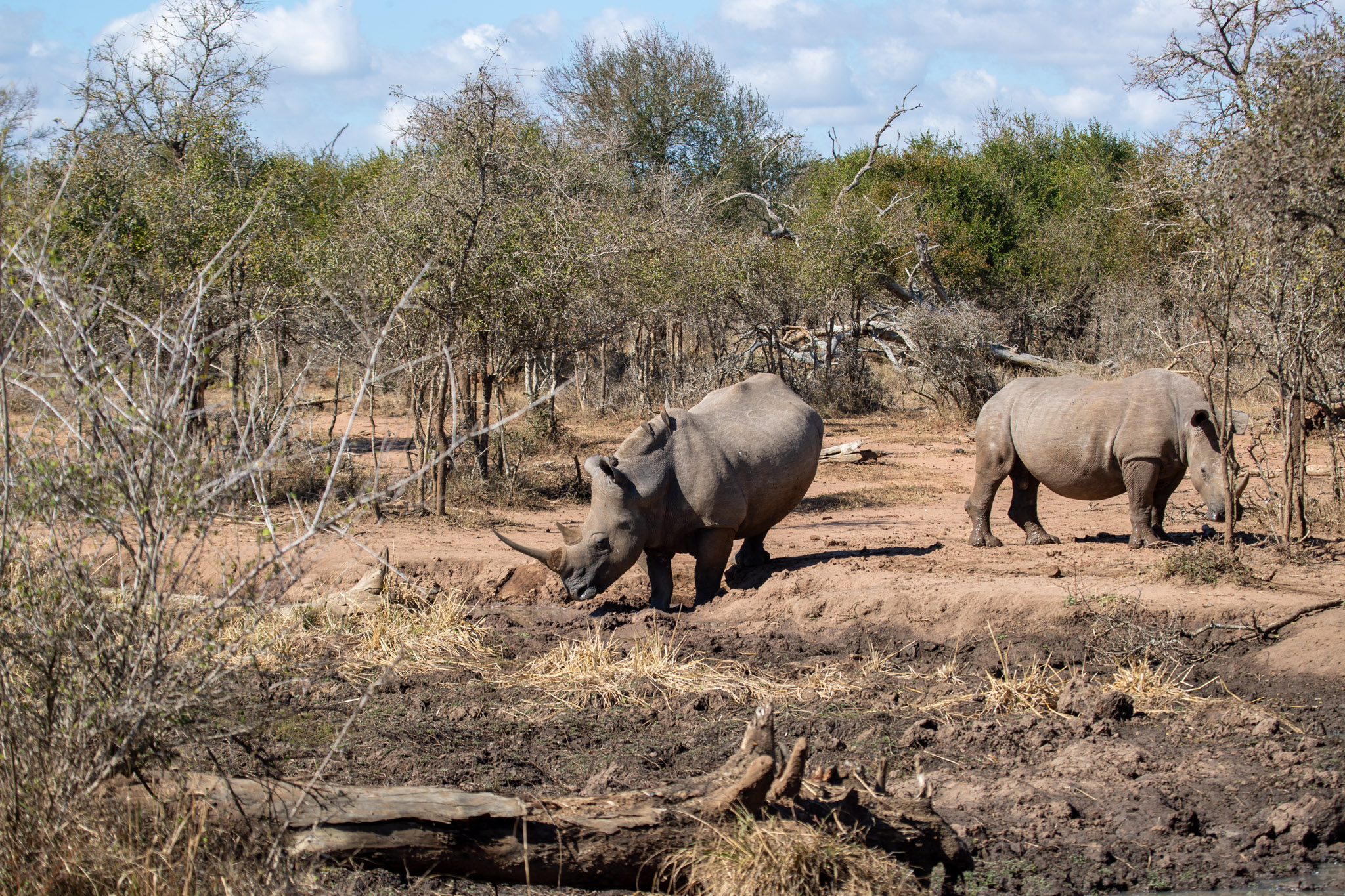 Ma copine s’endort à côté de moi car elle est très fatigué avec les grosses journées que l’on a cumulé dernièrement en se levant très tôt, couché pas trop tard et surtout peu d’exercice car beaucoup de voiture. Pendant qu’elle est profondément assoupie sur la chaise longue, j’aperçois deux rhinocéros qui viennent au plan d’eau. C’est génial, ils sont juste là devant nous.