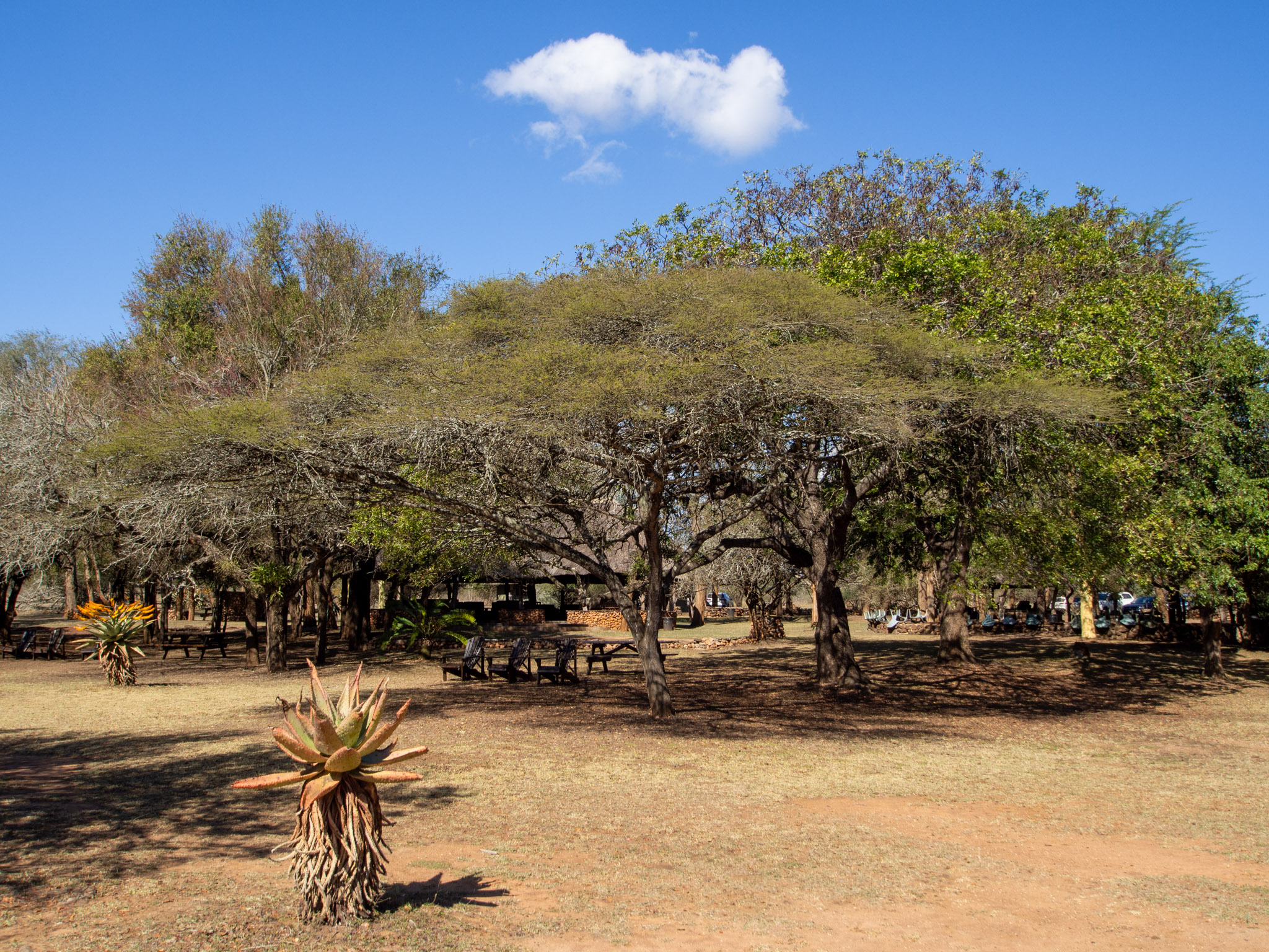 Après toutes ces jolies rencontres où on a pu voir les rhinocéros de près, ce que l’on n’avait pas eu au Kruger ce qui complète bien, on retourne au restaurant pour déjeuner et se reposer avant le bush walk de l’après midi. On commande les plats et on nous annonce qu’il faut attendre 40 minutes pour être servi. Pas de problème on s’installe face au plan d’eau avec une chaise longue en bois à l’ombre d’un acacia.