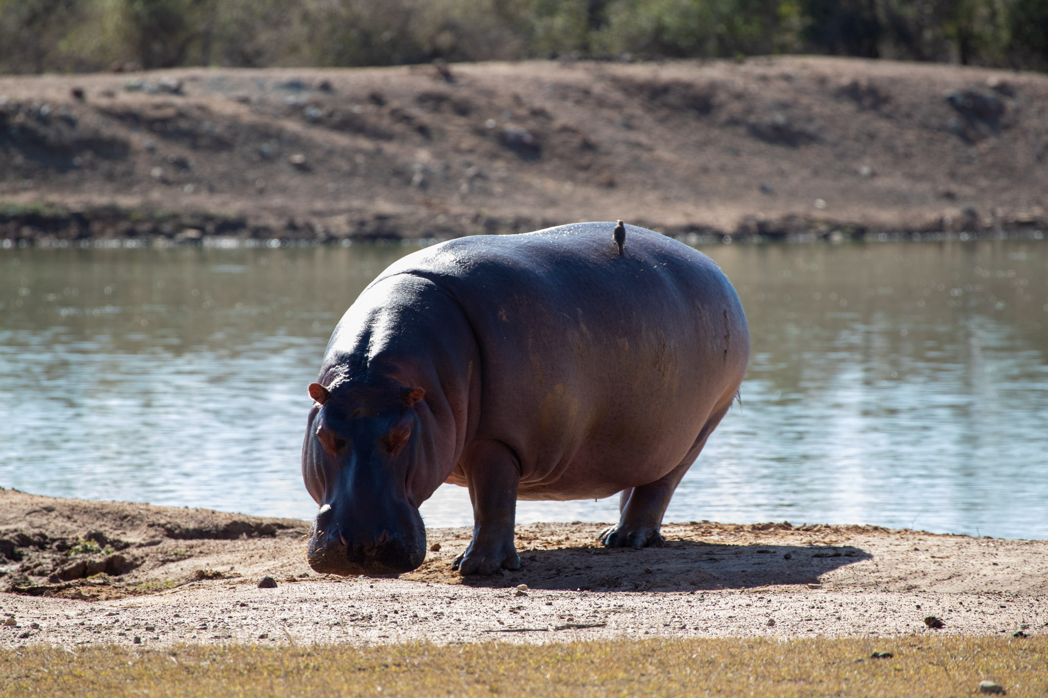 On se réveille dans ce magnifique cadre. On a entendu les lions toute la nuit autour de nous, c'est un très bel hébergement. Dans le plan d'eau, un hippopotame est déjà dans l’eau en train de barboter. Et on voit aussi une nouvelle espèce d’oiseau au bec original en train de pêcher.