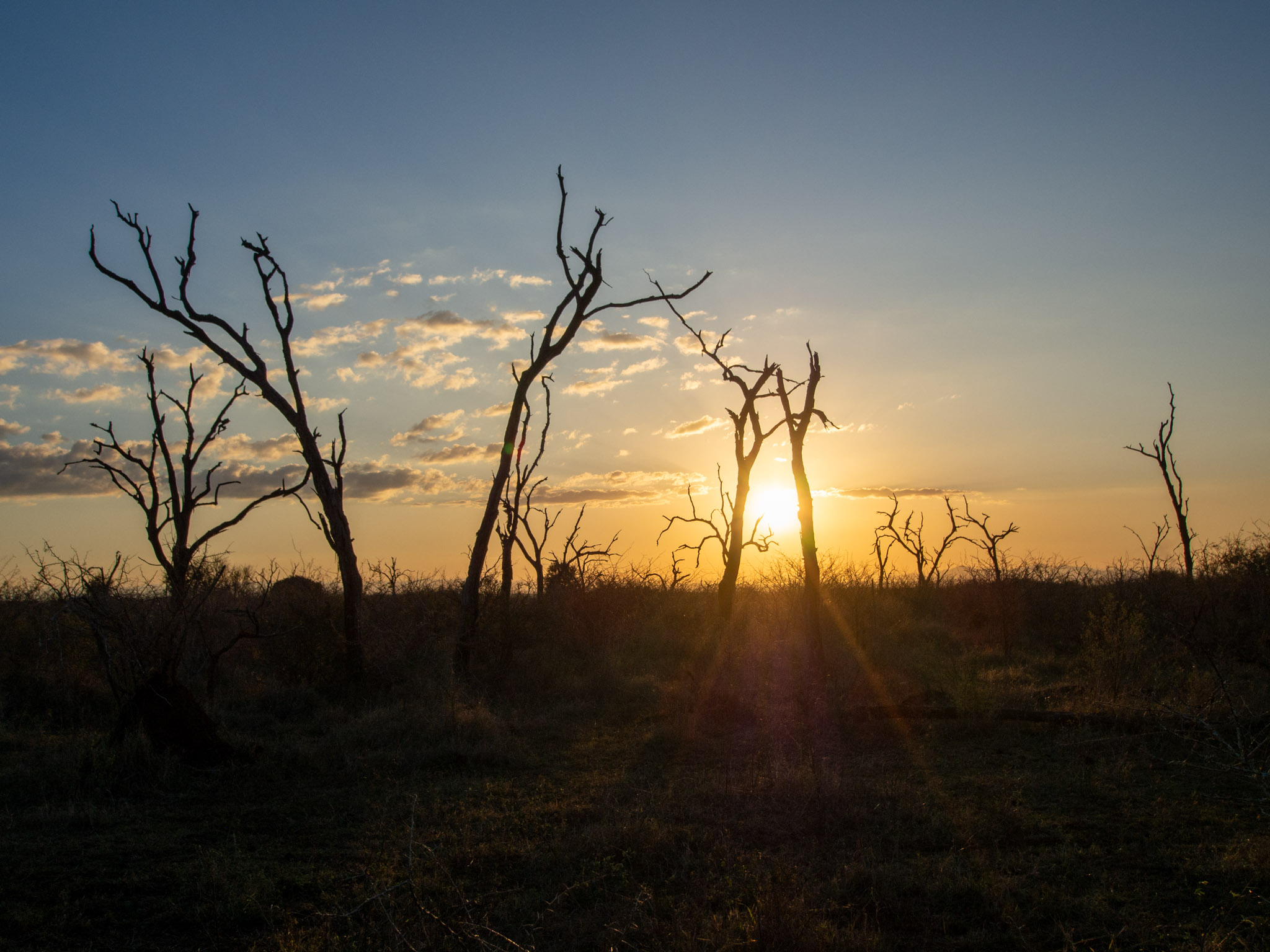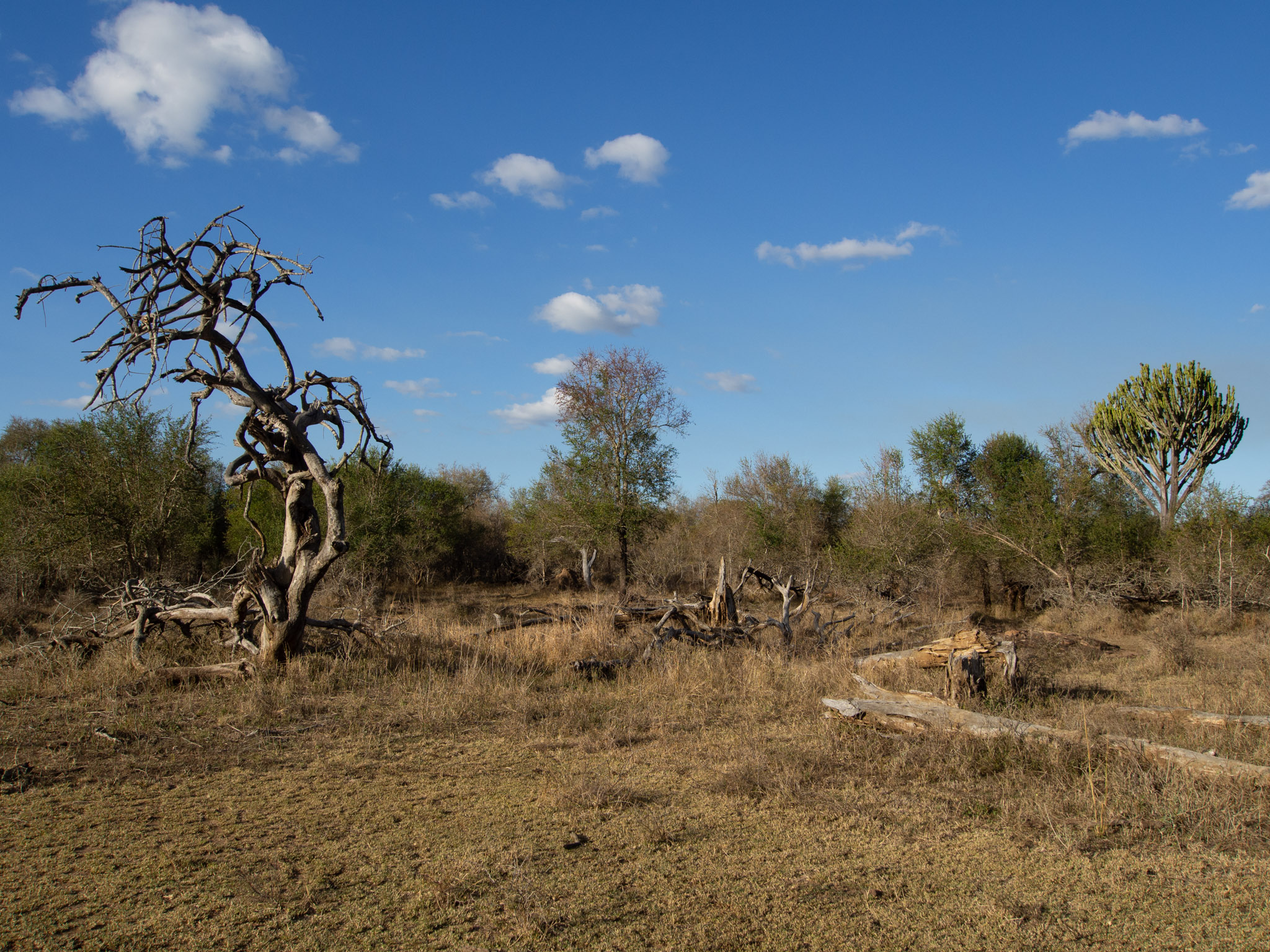 On continue notre tour en traversant une forêt d’arbres morts, les éléphants sont passés par là et ont tué tous les arbres. Cela fait partie du cycle de la vie, il faut un équilibre entre les éléphants et les arbres. Les arbres empêchent la végétation de pousser à cause de l’ombre qu’ils créent. Les éléphants ont le rôle d’éclaircir la forêt et de la renouveler. L’herbe qui pousse à la place des arbres nourrira d’autres herbivores qui attireront des prédateurs. Mais trop d’éléphants est aussi dangereux, il faut que la forêt soit capable de se renouveler et de nouveaux arbres de pousser pour éviter de la transformer en zone herbeuse exclusivement.