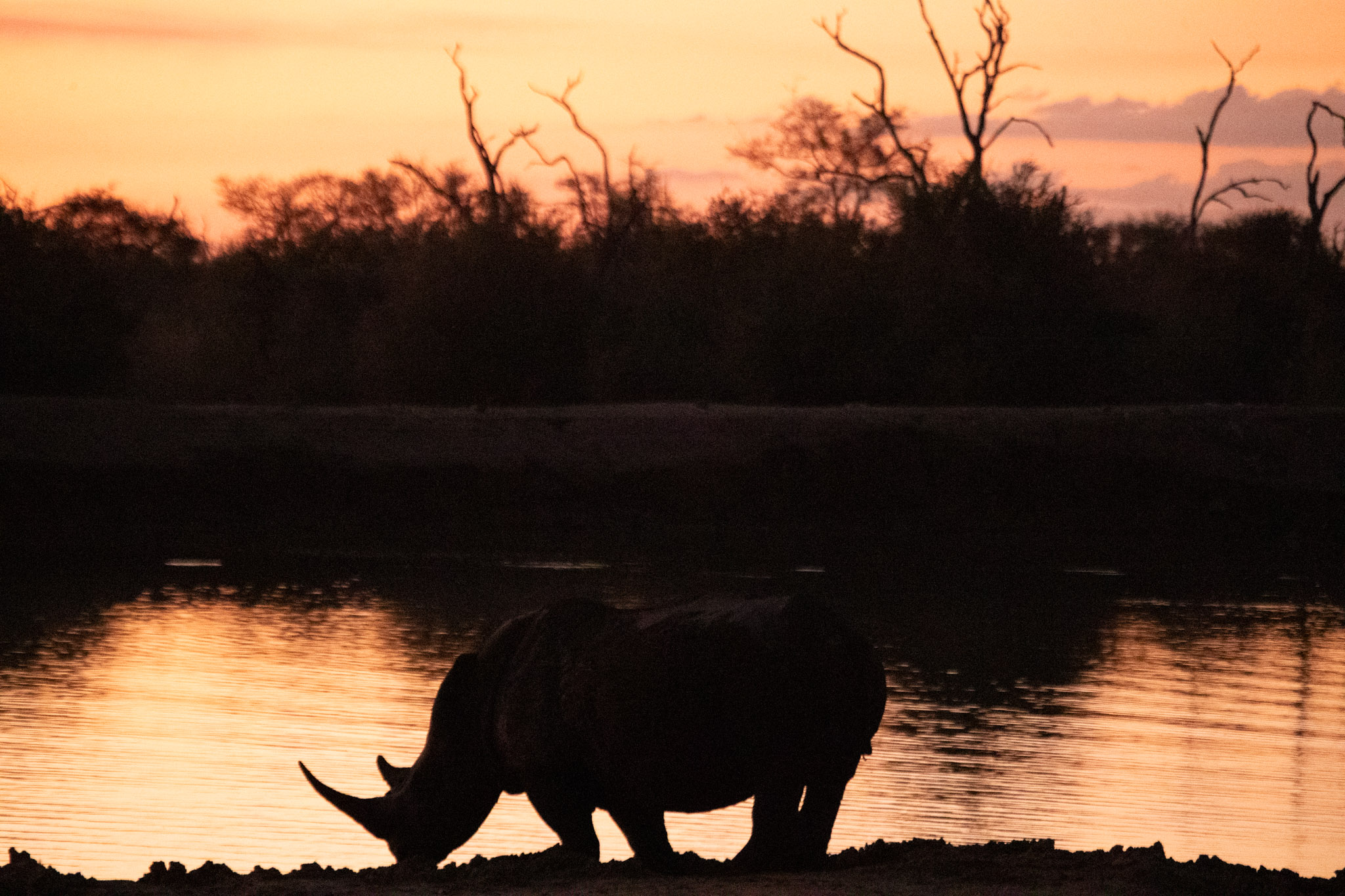Un rhinocéros vient passer devant nous pour boire devant nous, ce qui nous fait une magnifique image pour conclure notre séjour dans la réserve nationale de Hlane qui nous a vraiment plu.