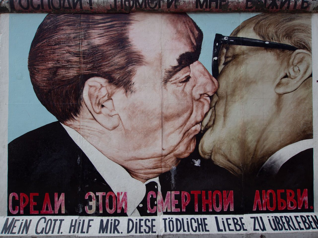 En substitution de notre visite de la Berlin TV Tower, on prend le big bus avec les enfants. Alors, je ne suis pas vraiment fan de ce genre de tours, j’avais déjà expérimenté à Barcelone et cette deuxième tentative confirme ma première impression. Le rapport qualité prix de ces big bus est pas terrible, le bus fait de longs arrêts et il fait une chaleur insoutenable en plein soleil, finalement le métro ou les bus de ville font des trajets similaires. Je ne recommanderai pas, même si les enfants sont contents de monter dans le bus à deux étages. Le bus nous dépose à proximité de East Side Gallery, une partie du Mur de Berlin qui a été peinte par des artistes avec des fresques reconnues internationalement dont celle du fameux baiser russe.