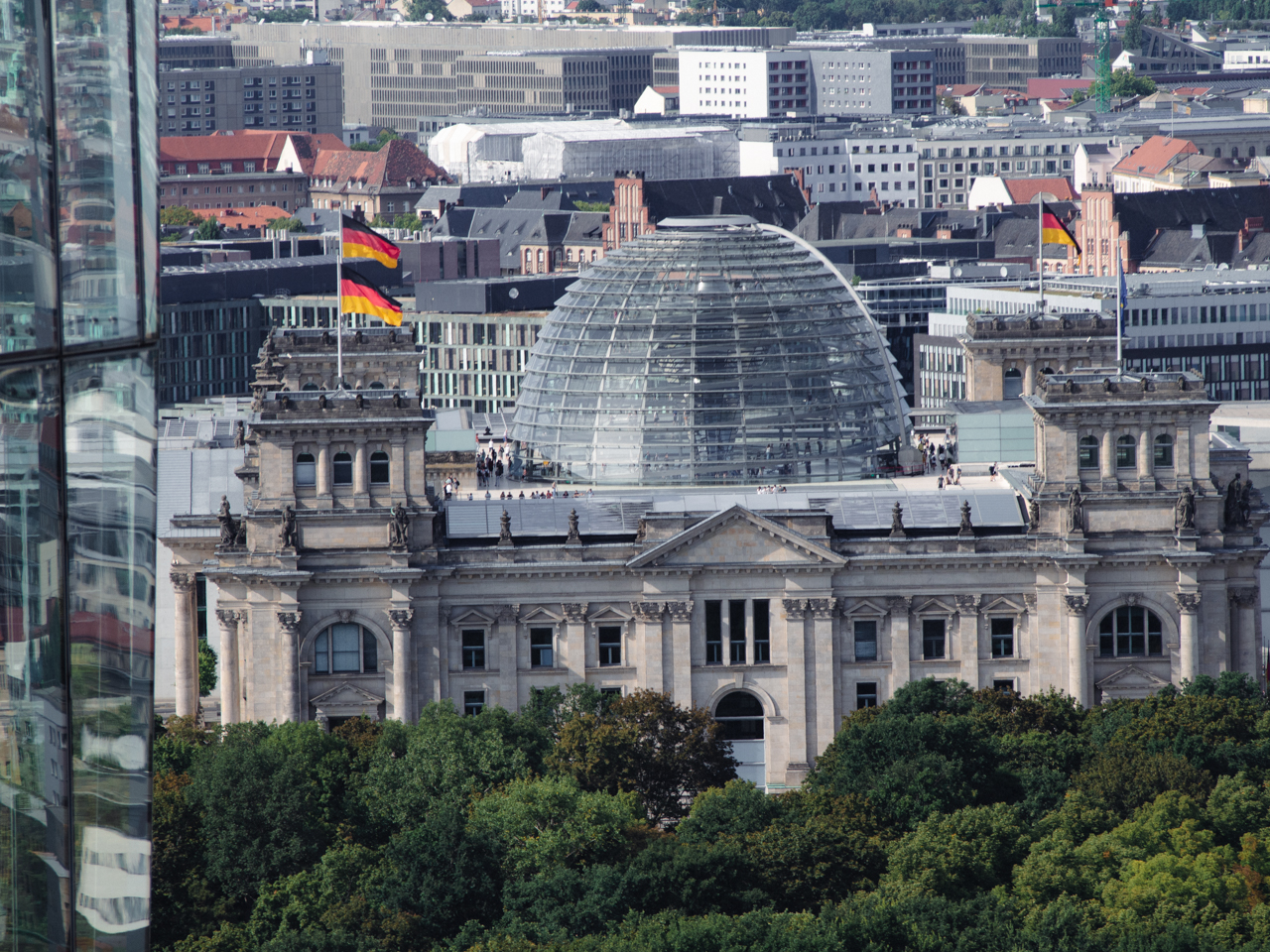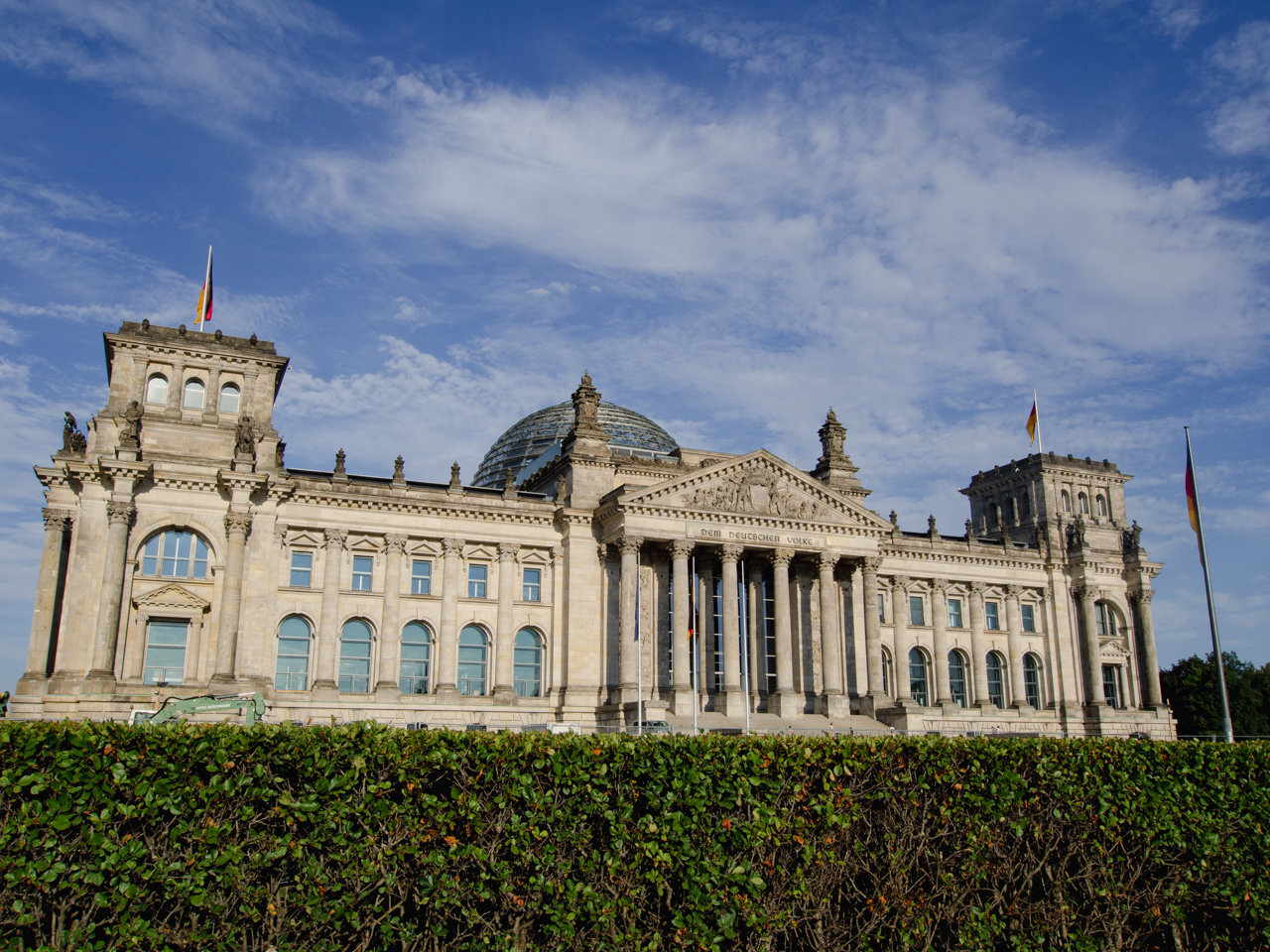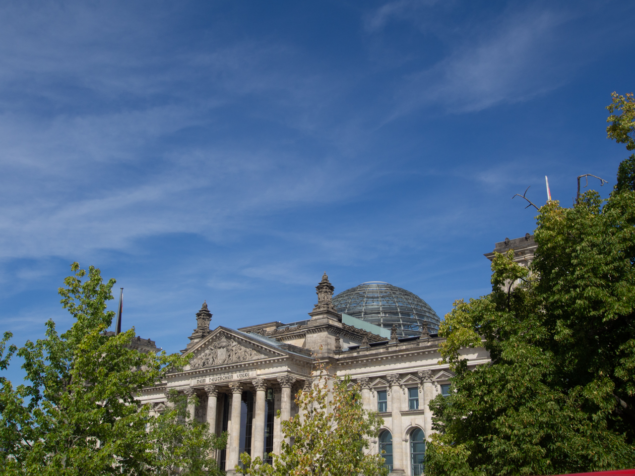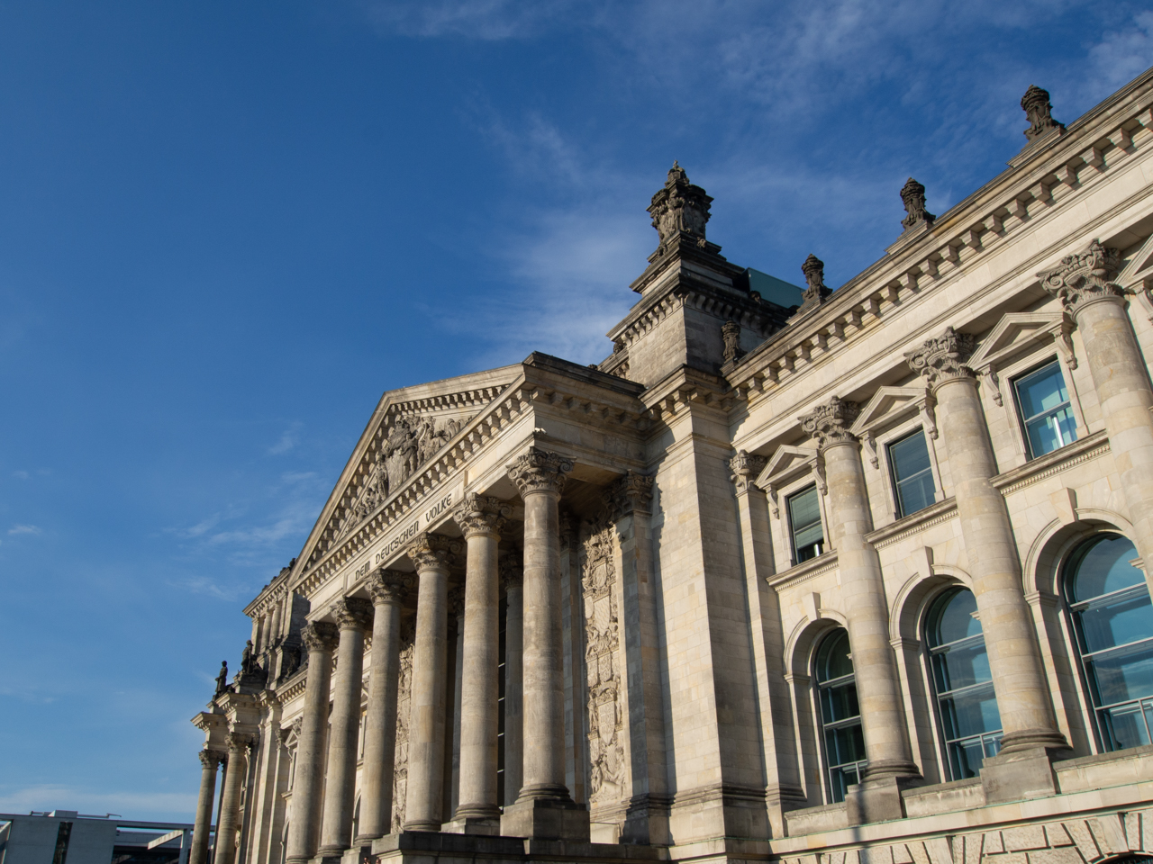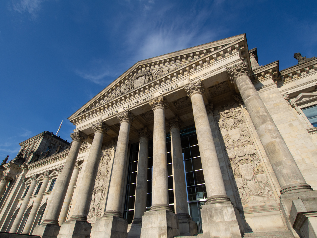 Sur le fronton du parlement d'inspiration classique, on peut lire une inscription en allemand, dem deutschen volke, qui veut dire pour le peuple Allemand.
