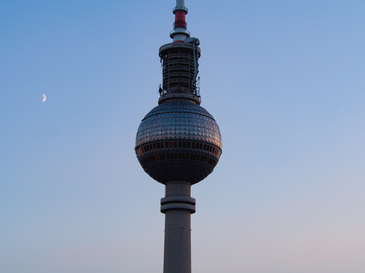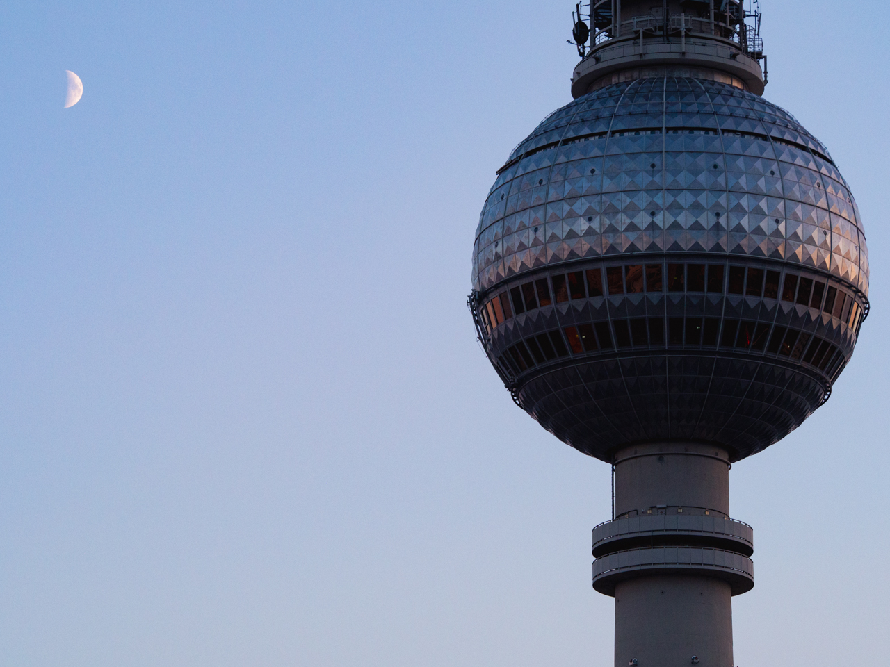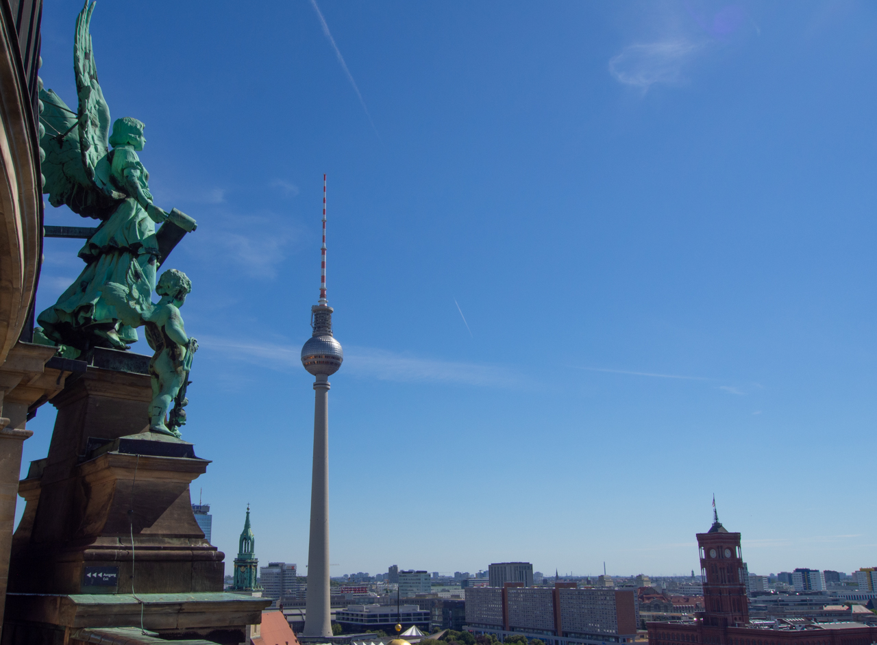 L’heure est arrivée pour monter dans la plus grande tour d’Allemagne. Construite par la RDA, elle devait démontrer la supériorité du modèle soviétique et devait donc être visible de chaque côté du mur et ses dimensions devaient être ambitieuses. A l'époque c'était déjà la quatrième plus haute structure du monde en 1969 à sa construction, et aujourd'hui 50 ans après c'est toujours la plus grande tour du pays. L’ascenseur nous élève en quelques secondes tout en haut dans la boule où se trouve l’observatoire. On peut tourner tout autour pour avoir une vue à 360° sur Berlin. On voit jusqu’aux confins de la ville, jusqu’à ce que le blanc des immeubles laisse la place au vert foncé de la forêt.
