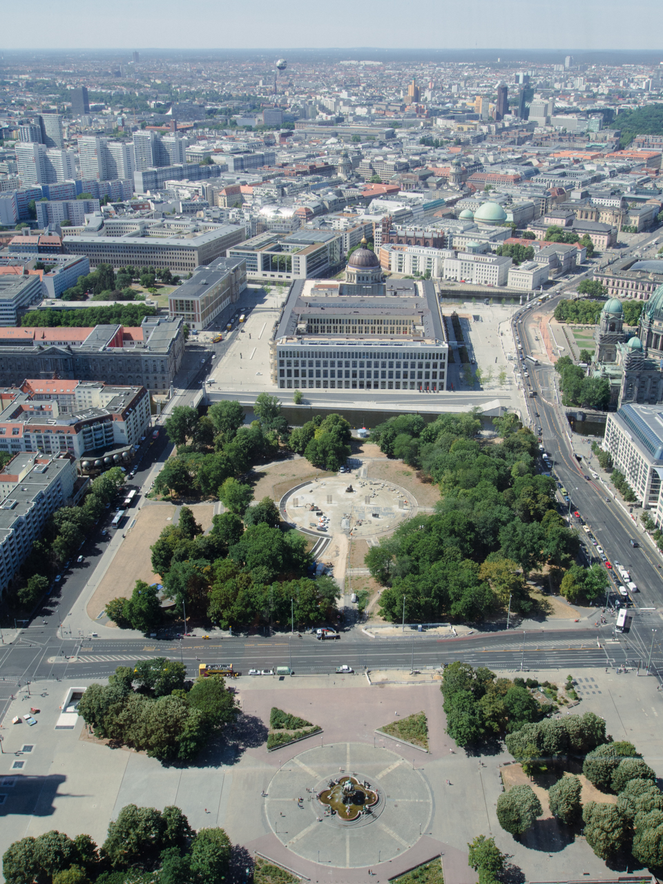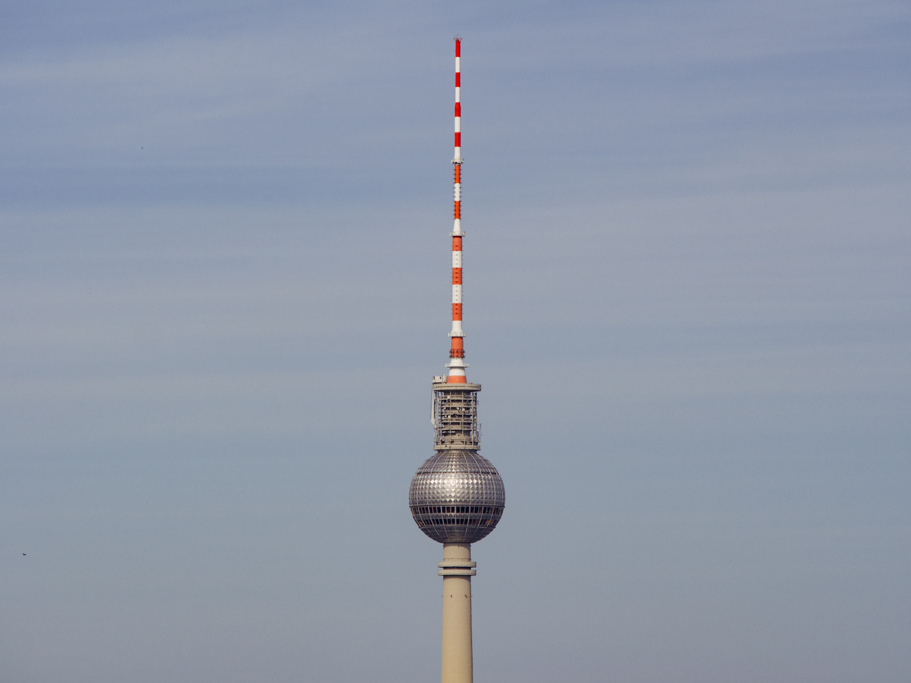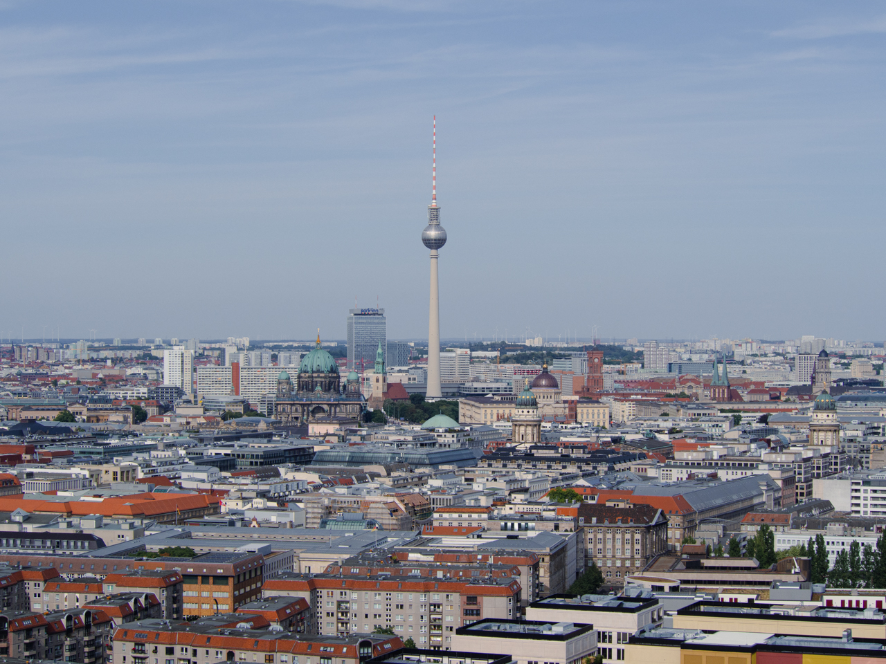 L’heure est arrivée pour monter dans la plus grande tour d’Allemagne. Construite par la RDA, elle devait démontrer la supériorité du modèle soviétique et devait donc être visible de chaque côté du mur et ses dimensions devaient être ambitieuses. A l'époque c'était déjà la quatrième plus haute structure du monde en 1969 à sa construction, et aujourd'hui 50 ans après c'est toujours la plus grande tour du pays. L’ascenseur nous élève en quelques secondes tout en haut dans la boule où se trouve l’observatoire. On peut tourner tout autour pour avoir une vue à 360° sur Berlin. On voit jusqu’aux confins de la ville, jusqu’à ce que le blanc des immeubles laisse la place au vert foncé de la forêt.