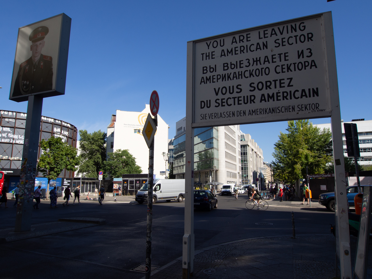 Nous finissons la journée sur cette belle expérience, je ne veux pas trop en demander aux enfants avec la chaleur, et on retourne à l’hôtel pour regarder un film. Voyager avec des enfants demande de ralentir le rythme et ce n’est pas si mal car cela nous oblige nous aussi à ne pas trop en faire et à se reposer. Le soir pendant qu’ils regardent leur film, je nous réserve les billets pour grimper en haut de la Berlin TV Tower, on se fera pas avoir deux fois. Ce matin nous commençons la journée par un incontournable, qui se trouve à quelques minutes à pieds de l’hôtel, le fameux Checkpoint Charlie. Ce checkpoint a été pendant les années de guerre froide le seul point de passage entre Berlin Ouest, le secteur américain et Berlin Est, le secteur contrôlé par les Soviétiques. Aujourd’hui, il n’y a plus de mur, plus de barbelés, plus de militaires, ni de checkpoint, cela pourrait être un croisement de rue comme un autre. Seule trace du mur, une rangée de pavés insérée dans le sol parcourt la ville pour rappeler où il se trouvait. Mais lorsque l’on arrive, on voit que la ville a quand même conservé la cabane des militaires, les panneaux ainsi que des explications avec des anciennes photos sont accessibles tout autour de cet endroit historique.