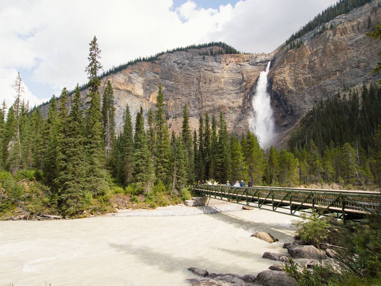 On accède aux cascades de Takakkaw en une dizaine de minutes, on traverse un pont au dessus d'une rivière à la teinte laiteuse.
