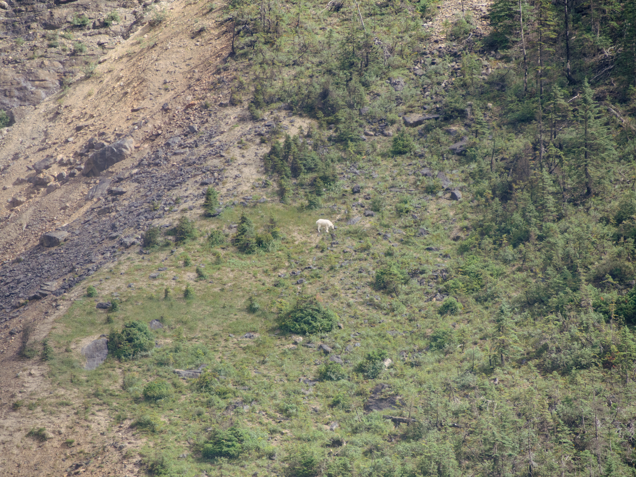 Un couple de personnes âgés passe à côté de nous demandent, vous l'avez vu ? Non quoi ? Ils nous montrent du doigt un point blanc à côté de la cascade. Une chèvre de montagne est en train de brouter l'herbe juste à côté des chutes et on ne l'avait même pas remarqué. Merci à eux de nous l'avoir montré. On remarque aussi que sur nos photos précédentes, cette chèvre était déjà là depuis le début mais on était tellement obnubilé par la cascade que l'on ne l'avait même pas vu. Avec le zoom 150mm on peut la voir d'un peu plus près mais c'est quand même encore un peu trop loin. C'est en tout encore un autre animal du bestiaire des Rocheuses Canadiennes que l'on aperçoit aujourd'hui.