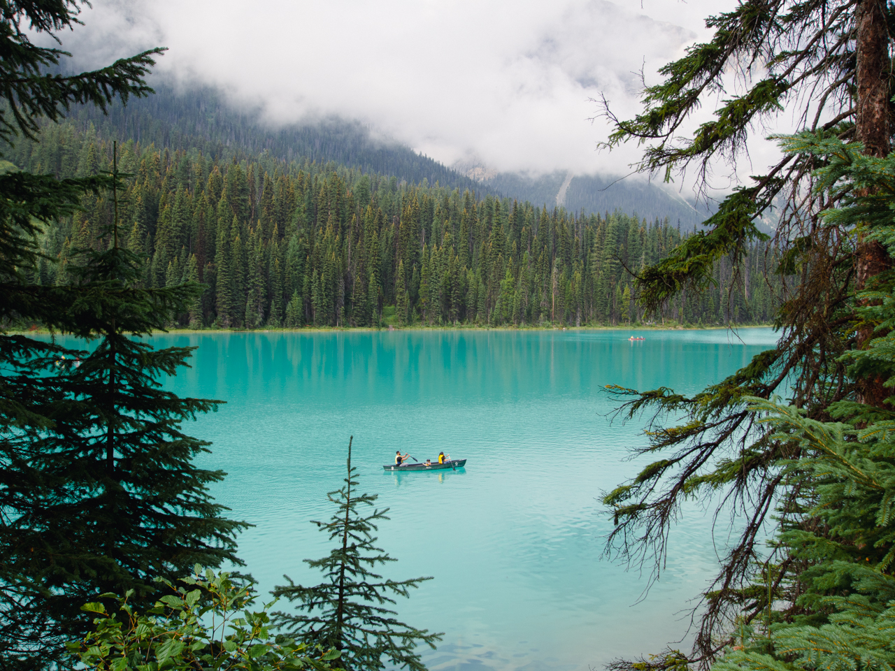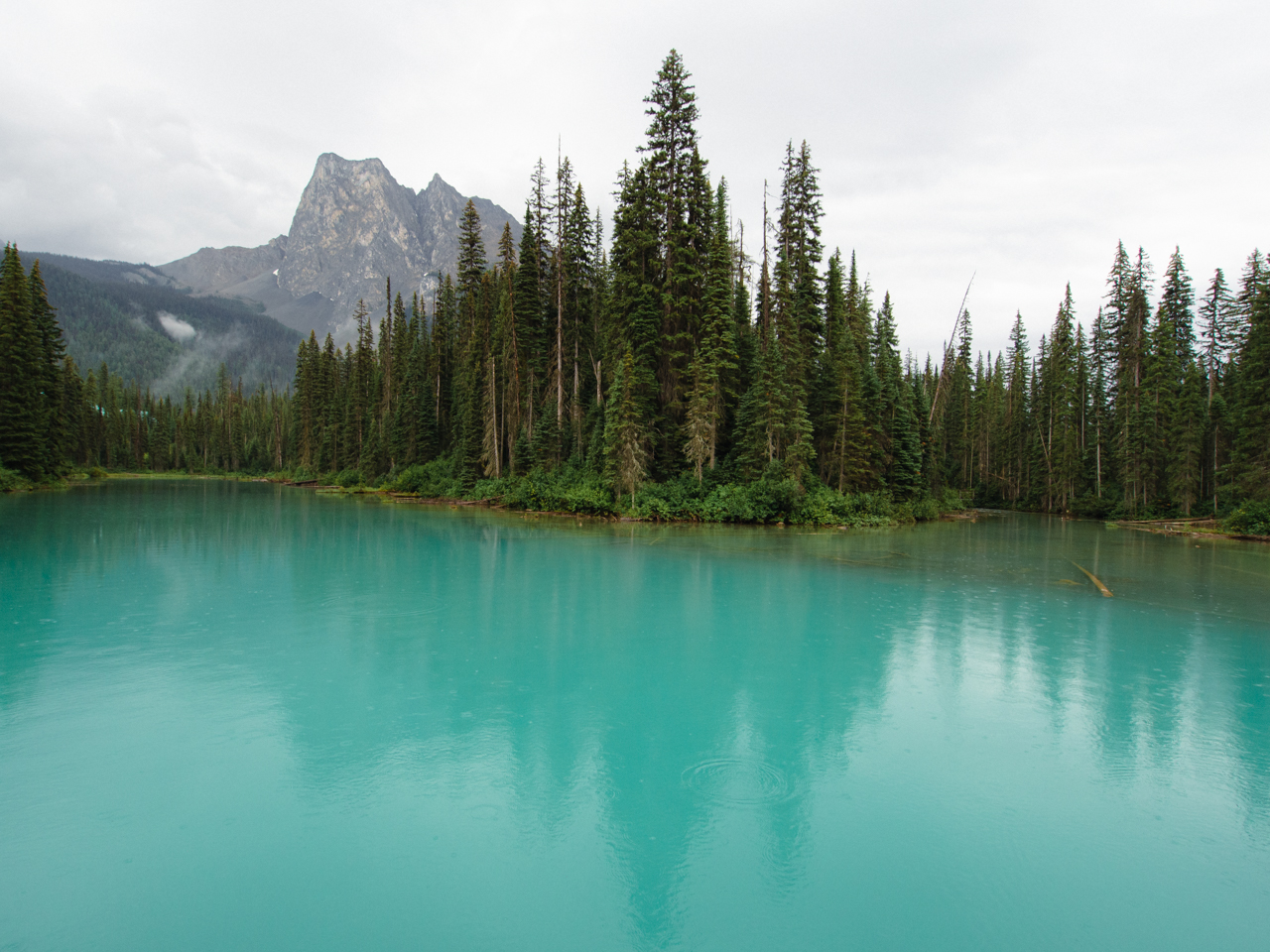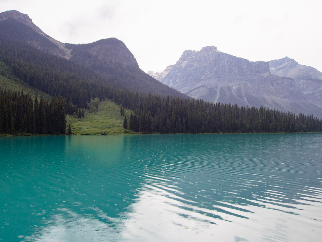 On continue notre exploration du parc national de Yoho avec une autre vallée. On retourne à la voie rapide puis on ressort quelques kilomètres plus loin. Alors que l'on avait eu de la chance avec la pluie jusqu'à maintenant, notre chance a tourné. On se prend une douche alors que l'on arrive sur le parking du lac Emerald. Le seul avantage c'est que l'on peut en profiter pour trouver une place au bord, alors que les voitures étaient alors garées très loin sur le bord de route ce matin. On reste dans la voiture le temps que cela se calme puis on sort avec les capes de pluie. Pas facile de marcher même avec les capes de pluie sans avoir les chaussures qui se remplissent d'eau. Mais même avec cette pluie, l'eau du lac a une couleur incroyablement turquoise, parmi les plus belles que l'on est vu.