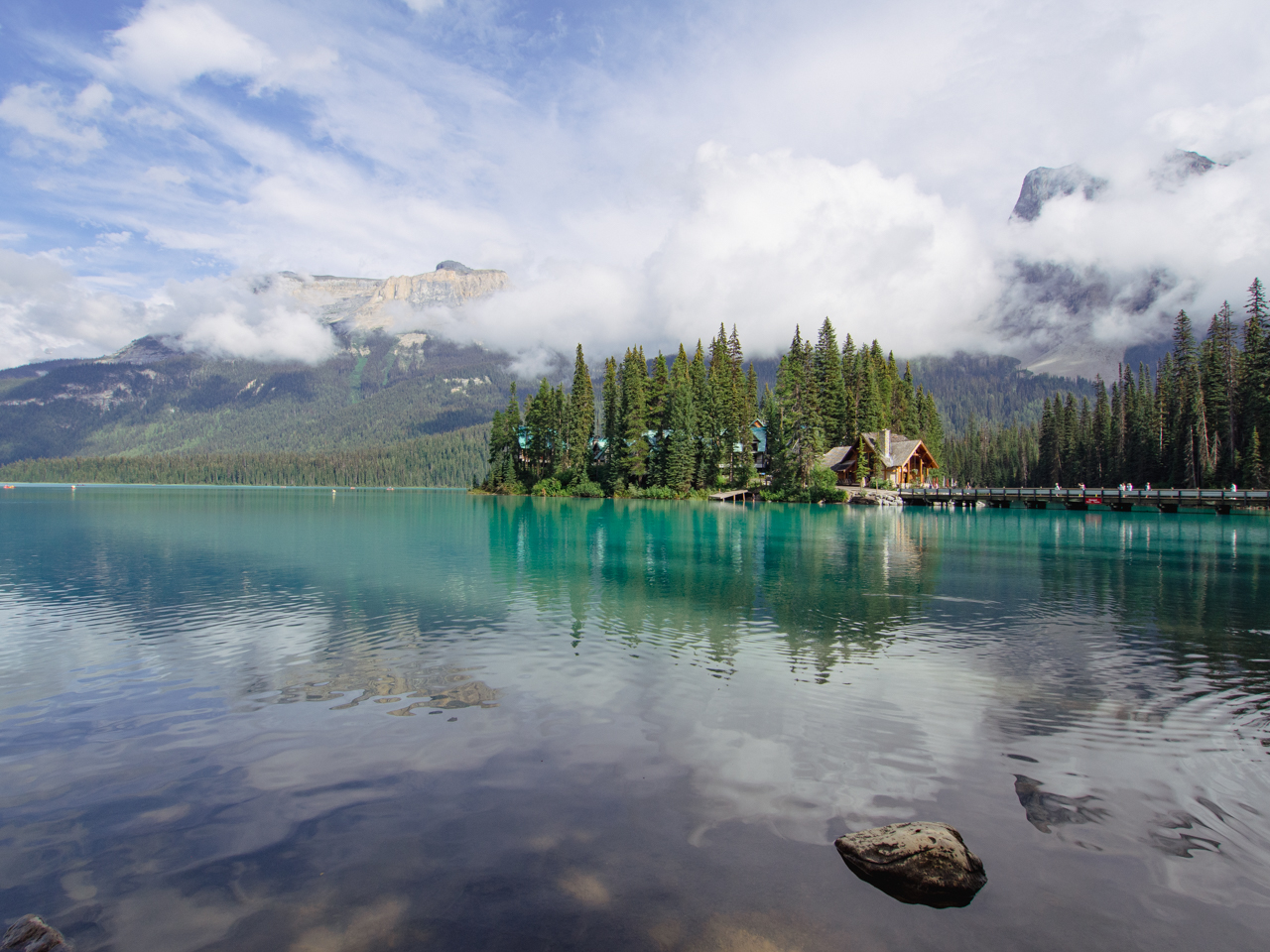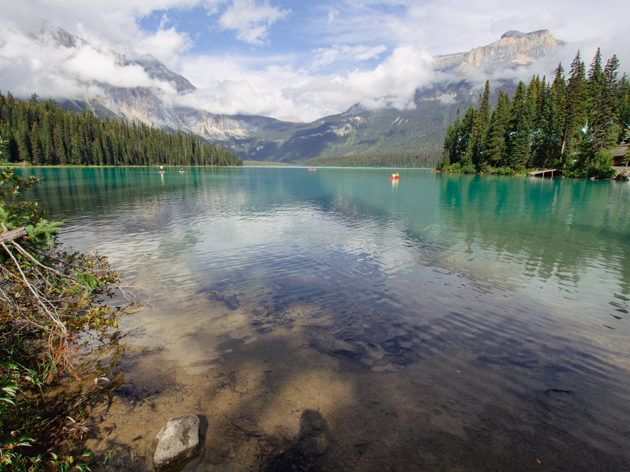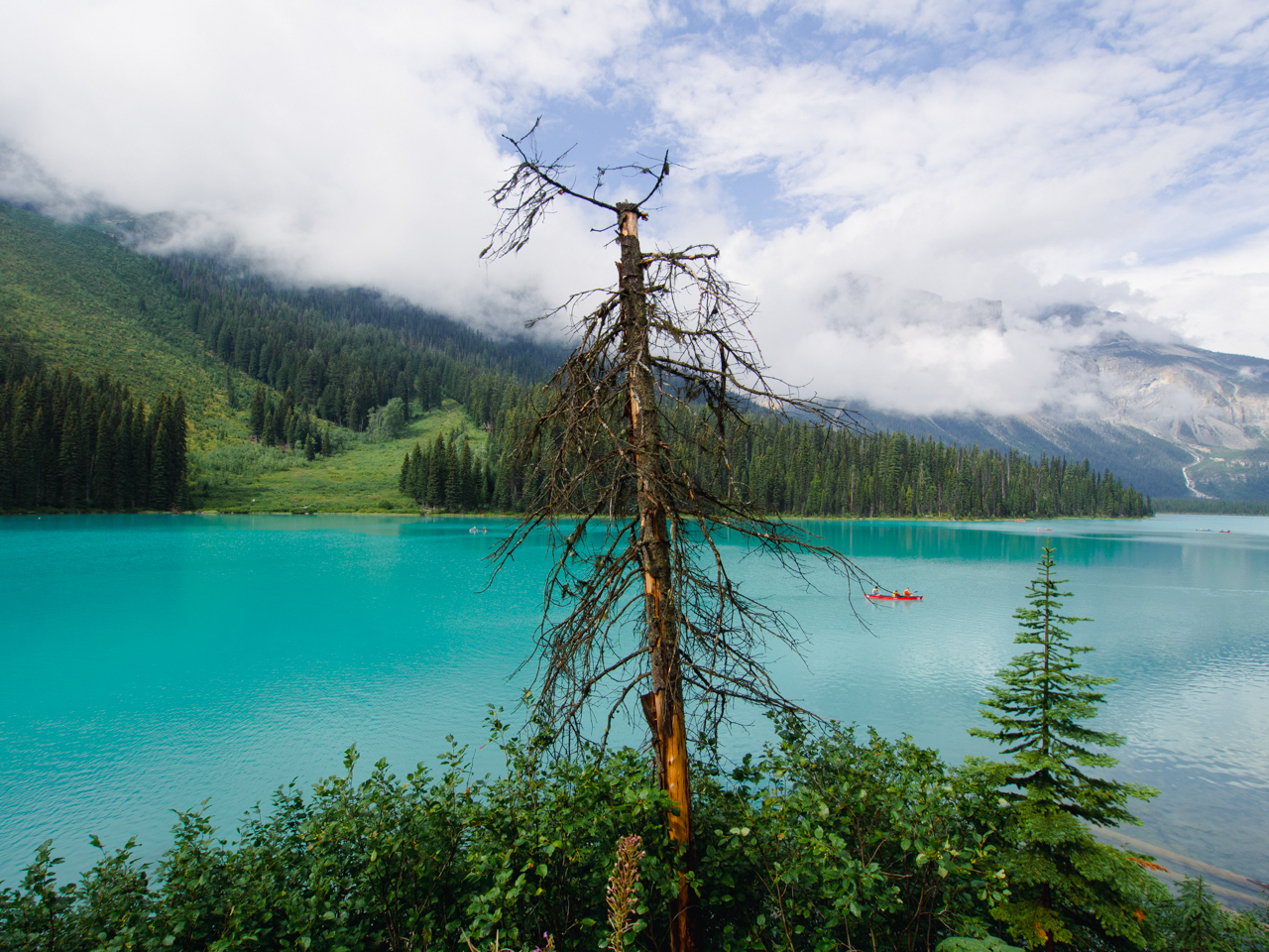 On continue notre exploration du parc national de Yoho avec une autre vallée. On retourne à la voie rapide puis on ressort quelques kilomètres plus loin. Alors que l'on avait eu de la chance avec la pluie jusqu'à maintenant, notre chance a tourné. On se prend une douche alors que l'on arrive sur le parking du lac Emerald. Le seul avantage c'est que l'on peut en profiter pour trouver une place au bord, alors que les voitures étaient alors garées très loin sur le bord de route ce matin. On reste dans la voiture le temps que cela se calme puis on sort avec les capes de pluie. Pas facile de marcher même avec les capes de pluie sans avoir les chaussures qui se remplissent d'eau. Mais même avec cette pluie, l'eau du lac a une couleur incroyablement turquoise, parmi les plus belles que l'on est vu.