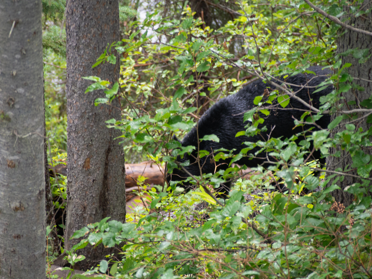 Alors que je suis sur pont de la teahouse je vois un groupe de touriste agglutinés et tout excités. Je m'approche pour écouter ce qu'ils disent car ils semblent regarder tous dans la même direction, certains ont des jumelles. En m'approchant, j'entends le mot "bear". Serait ce enfin le moment où nous verrons le roi de la forêt canadienne, l'ours ou le grizzli, l'un ou l'autre d'ailleurs, depuis le temps que l'on espère en croiser un. J'envoie un message à ma copine pour qu'elle me rejoigne en prévision de la découverte. Elle me rejoint et je lui dis que je ne vois rien, qu'il semble être caché sur l'autre rive, que des touristes l'ont vu mais après rien. On se décide à explorer car une route passe au-dessus de cette rive pour rejoindre l'hôtel. On repère l'endroit et on rejoint le bord de la route et là bingo. Un bel ours noir est tranquillement en train de faire sa vie en contrebas. On ne s'approche pas plus, mais on se délecte du paysage. C'était vraiment un de nos objectifs de ce voyage de voir des ours en liberté. Celui-ci sera le seul est l'unique spécimen.