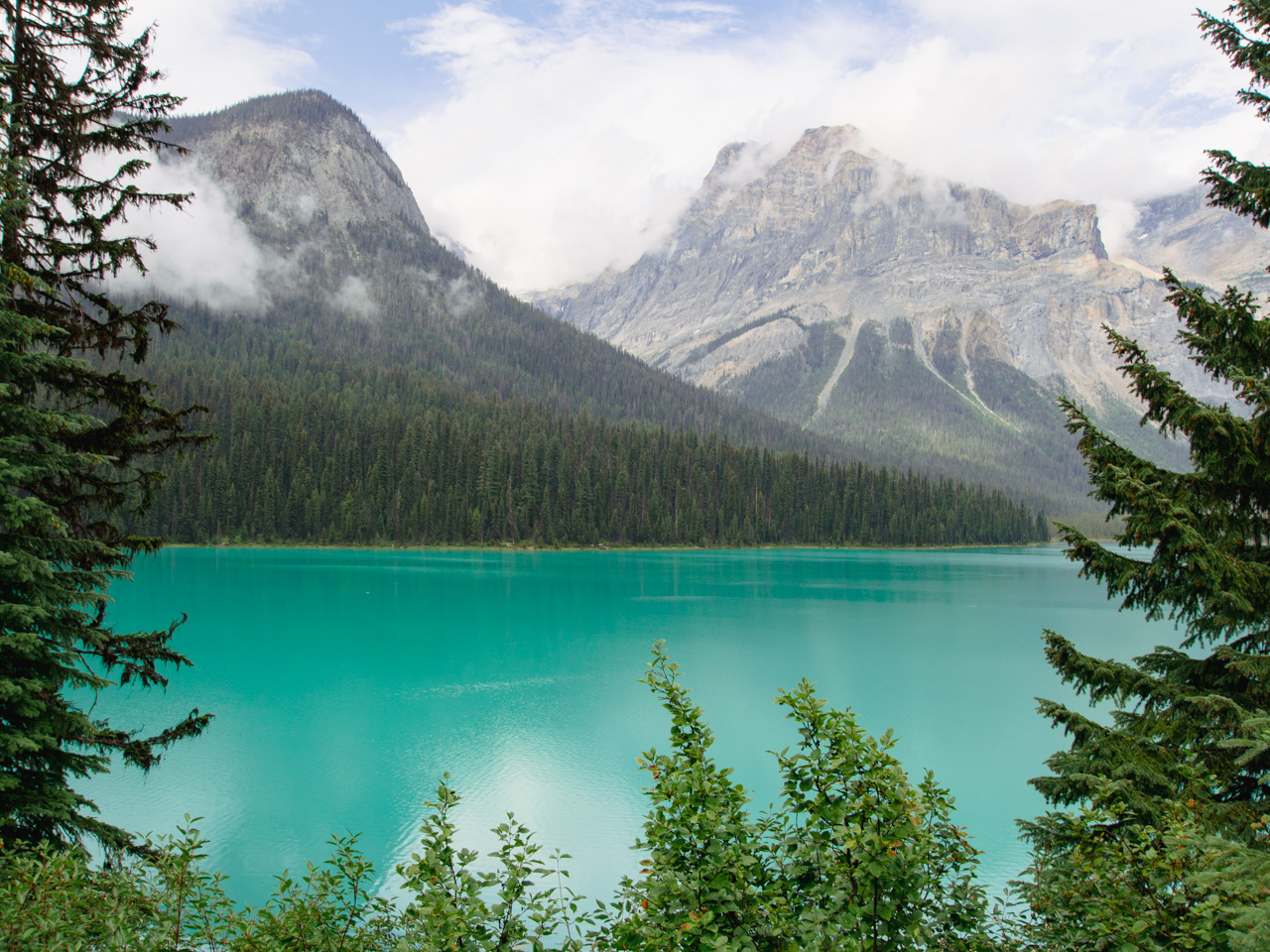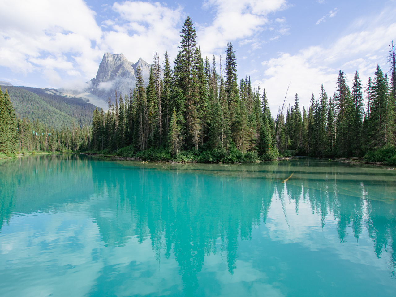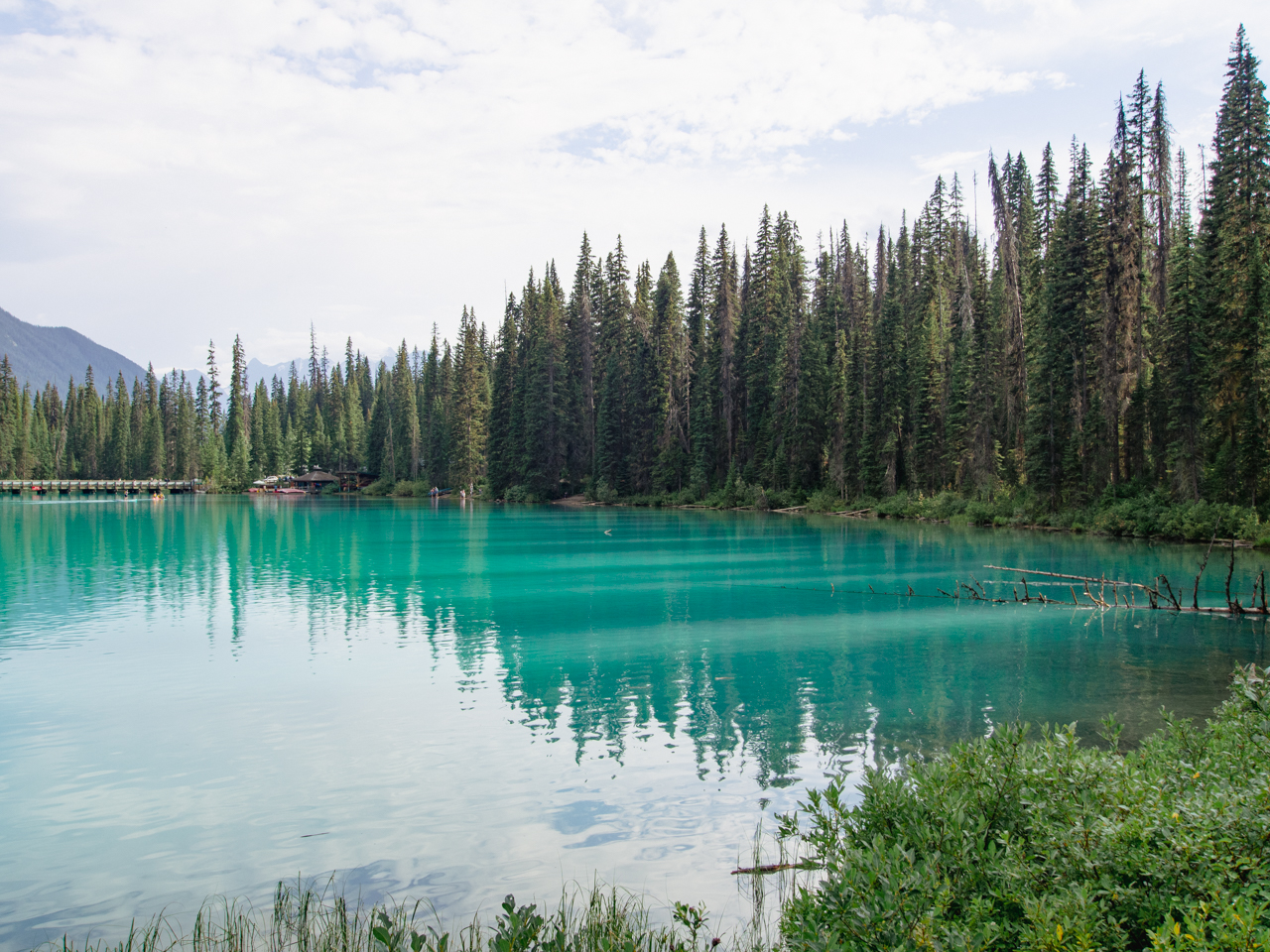 On marche sur les rives du lac dans une forêt préservée de conifères, on peut découvrir de nombreux points de vue différents sur le bleu du lac et les montagnes de Yoho NP.