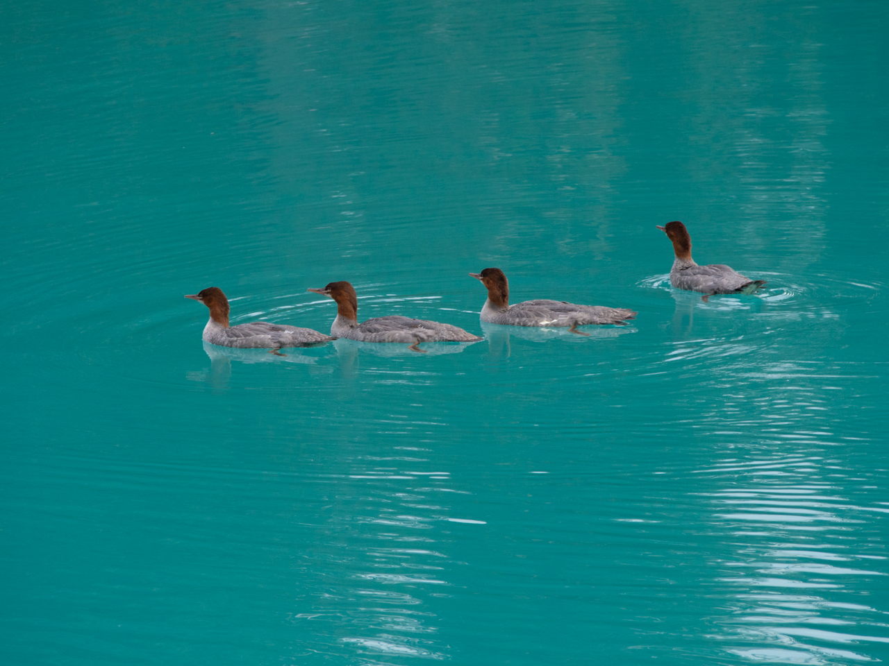 Une famille de canards sort la tête de leur cachette et profitent comme les humains des rayons du soleil. L'eau du lac est vraiment étonnante, comme le nom du lac l'indique, couleur émeraude.