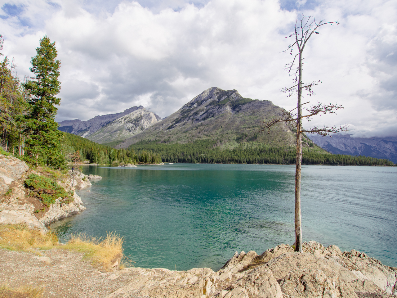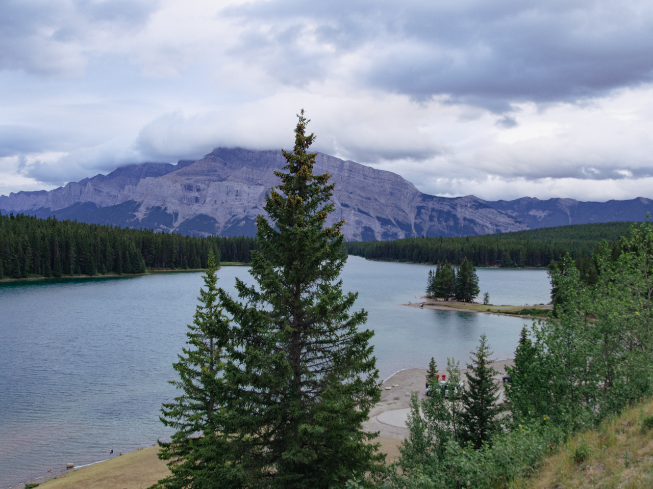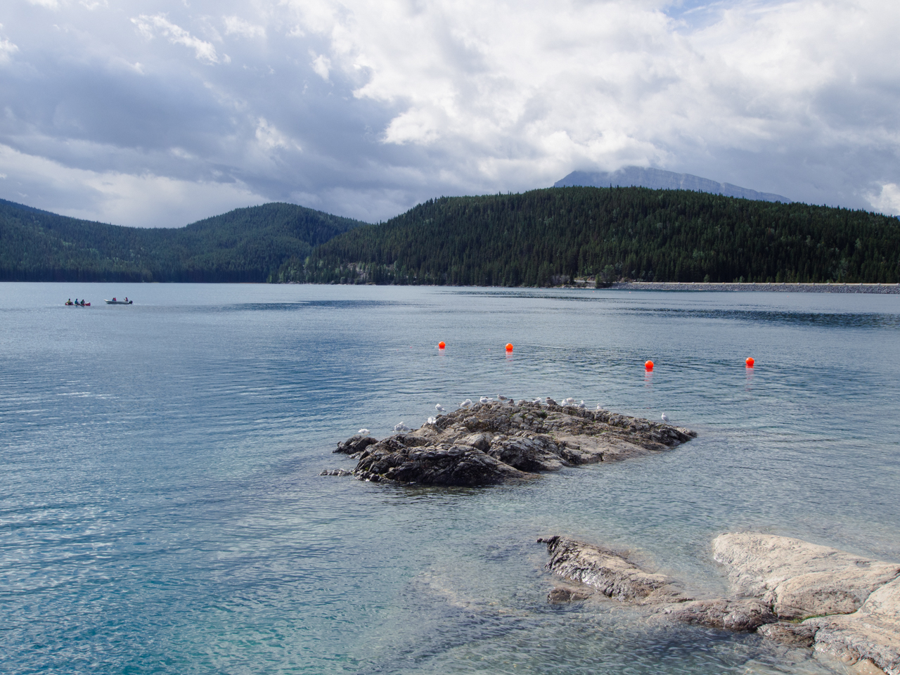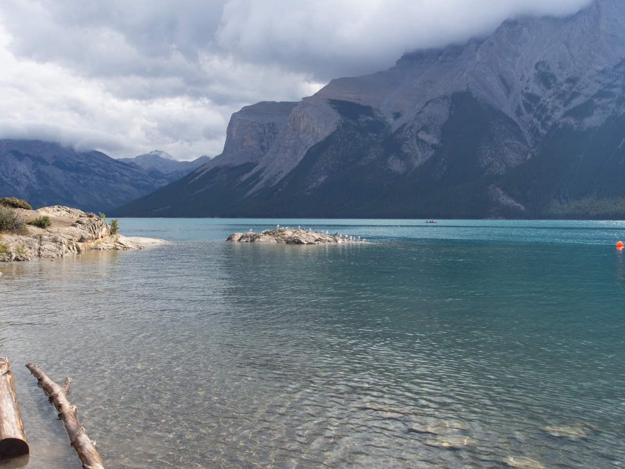 En cette journée tourmentée, nous décidons de faire quelques visites autour de Banff mais aussi de nous occuper de l'intendance, après plusieurs jours sur la route, il est temps de faire un tour à la laverie et de remplir le frigo. On trouve tout ce qu'il faut à Banff. Une laverie se trouve au sous-sol d'une galerie commerciale, sous le magasin Canada Goose. Un grand supermarché aux prix hallucinants est parfaitement situé à l'entrée de la ville. On se gare au grand parking relais de la gare, d'ici on peut rejoindre la ville en moins de 10 minutes à pieds. La météo annonce de la pluie et des fortes averses tout au long de la journée. Heureusement, avec les prévisions radars de l'application météo on arrive quand même à faire de belles sorties courtes mais intenses. Ce matin, avant de rejoindre le centre ville, on fait un petit détour par le lac de Minnewanka, une grande étendue d'eau douce qui passe au milieu de belles montagnes.