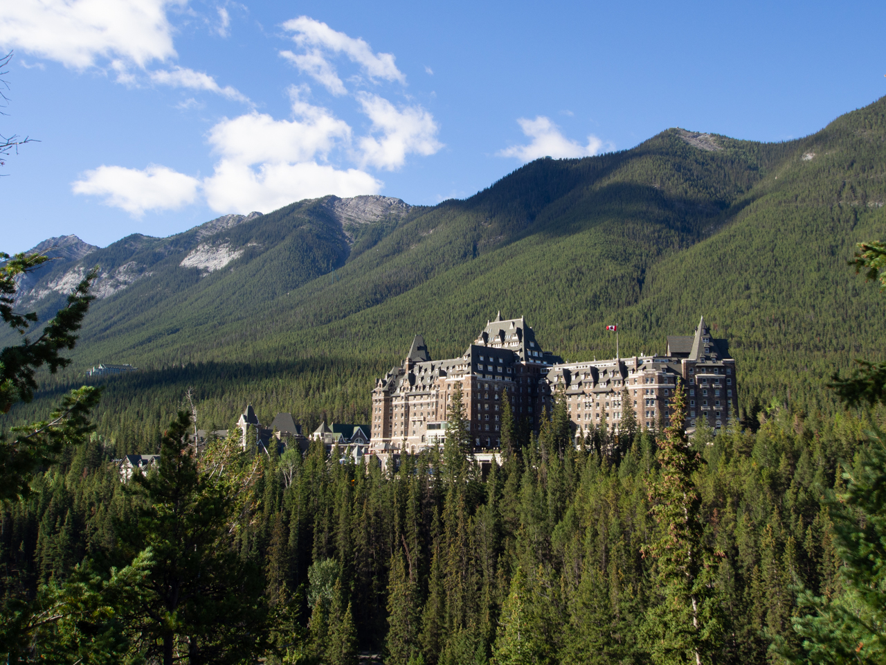 L'imposant chateau de Banff, un hôtel de luxe situé à proximité des hot Springs que l'on aperçoit en haut à gauche de cette photo.