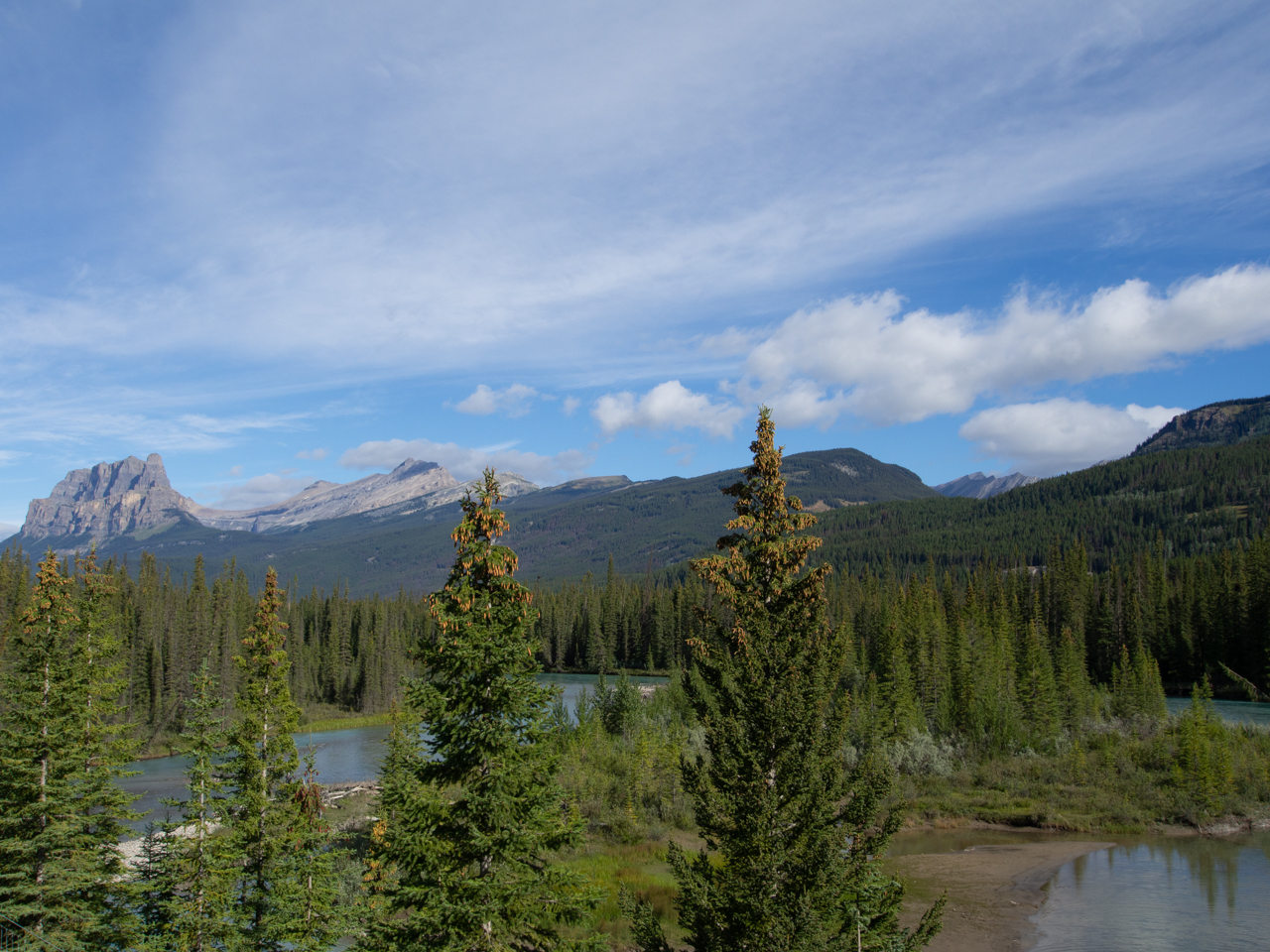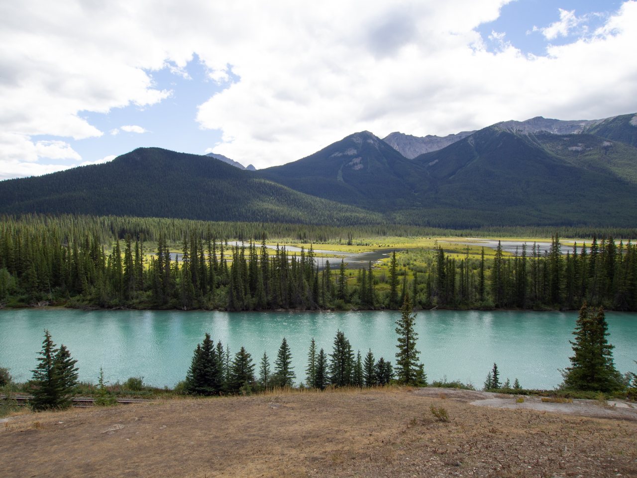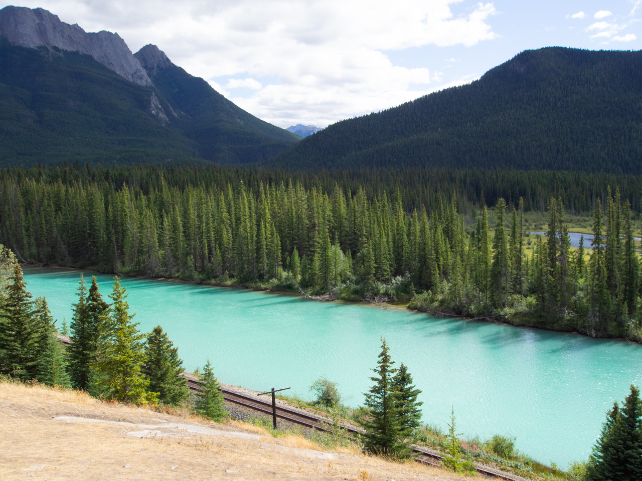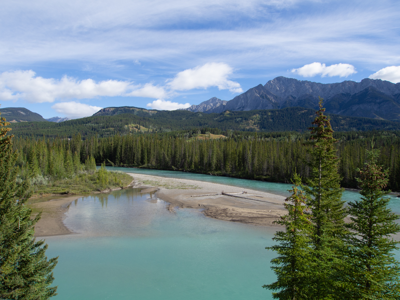 Depuis la voie rapide, on peut s'arrêter sur de jolies aires de repos qui donnent sur la rivière Bow aux couleurs bleutées qui se frayent un chemin dans la vallée de Banff et les montagnes aux pics rocheux.
