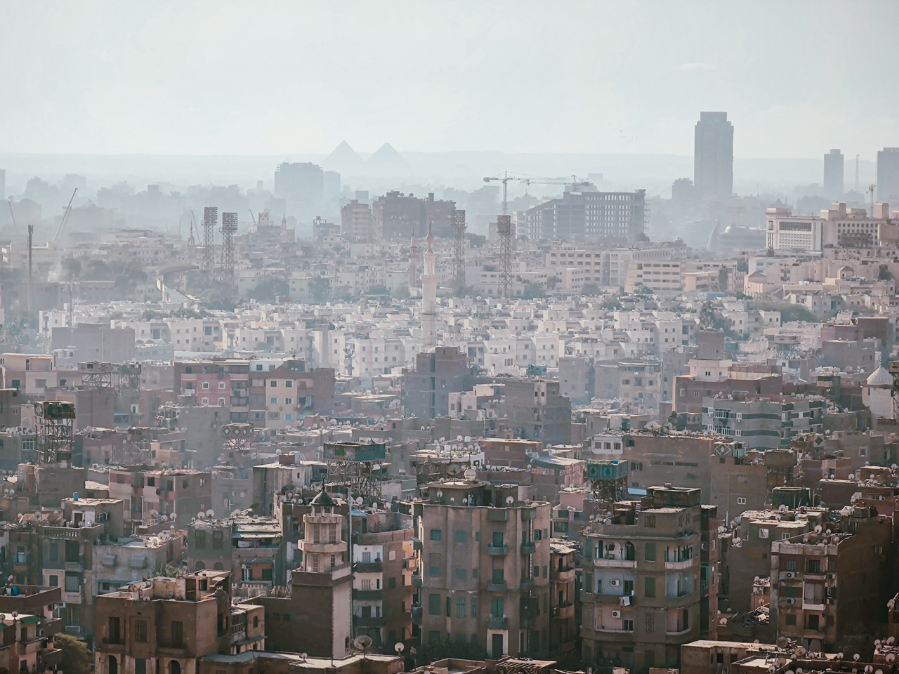 De l’autre côté du site, la ville tentaculaire du Caire s’est déjà étendue avec un nouveau quartier très dense.