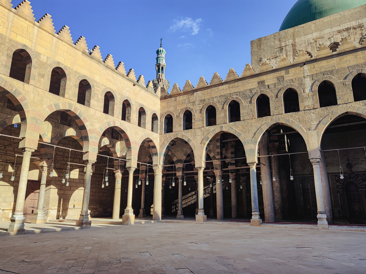 On ressort de la mosquée pour trouver une belle vue panoramique sur le vieux Caire qui soit bien dégagée. En entrant dans les jardins, on arrive à un balcon qui domine les mosquées du Caire. Les deux mosquées au premier plan semblent d’un style homogène mais en fait 5 siècles séparent leur construction.