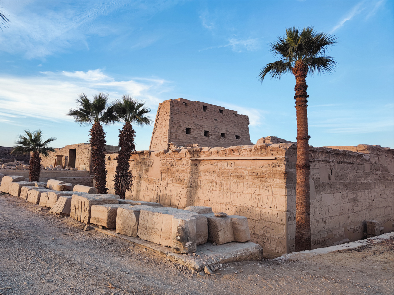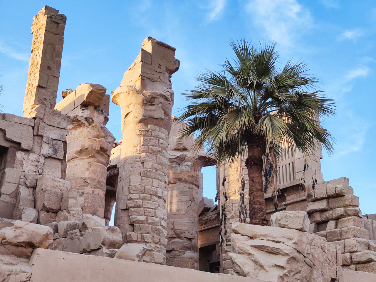 De l’extérieur, on peut continuer de visiter les différents bâtiments de Karnak. Ils sont en mauvais état de conservation mais c’est déjà incroyable qu’ils aient pu traverser plus de deux mille ans jusqu’à nous, des palmiers ont poussé au milieu des ruines.